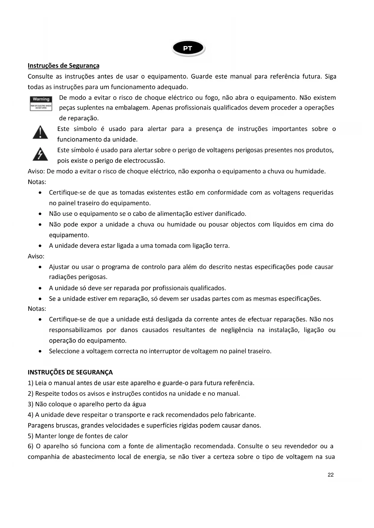 Instruções de Segurança Consulte as instruções antes de usar o equipamento. Guarde este manual para referência futura. Siga todas as instruções para um funcionamento adequado. De modo a evitar o risco de choque eléctrico ou fogo, não abra o equipamento. Não existem peças suplentes na embalagem. Apenas profissionais qualificados devem proceder a operações de reparação. Este símbolo é usado para alertar para a presença de instruções importantes sobre o funcionamento da unidade. Este símbolo é usado para alertar sobre o perigo de voltagens perigosas presentes nos produtos, pois existe o perigo de electrocussão. Aviso: De modo a evitar o risco de choque eléctrico, não exponha o equipamento a chuva ou humidade. Notas: