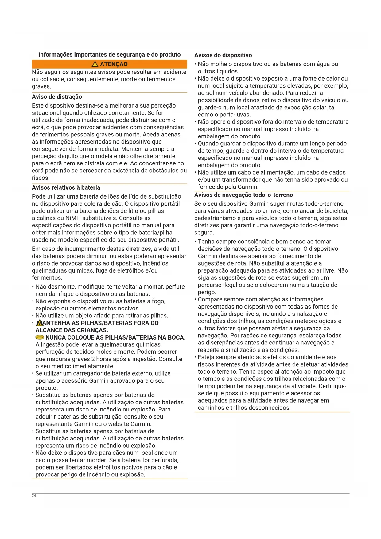 - O dispositivo destina-se ao fornecimento de sugestões de rota. Não substitui a atenção e o bom senso do condutor. Não siga as sugestões de rota se estas sugerirem manobras ilegais ou que possam colocar o veículo numa situação de perigo. AVISO O não cumprimento do seguinte aviso pode resultar em danos materiais ou ferimentos, ou afetar negativamente o funcionamento do dispositivo. Avisos acerca da bateria