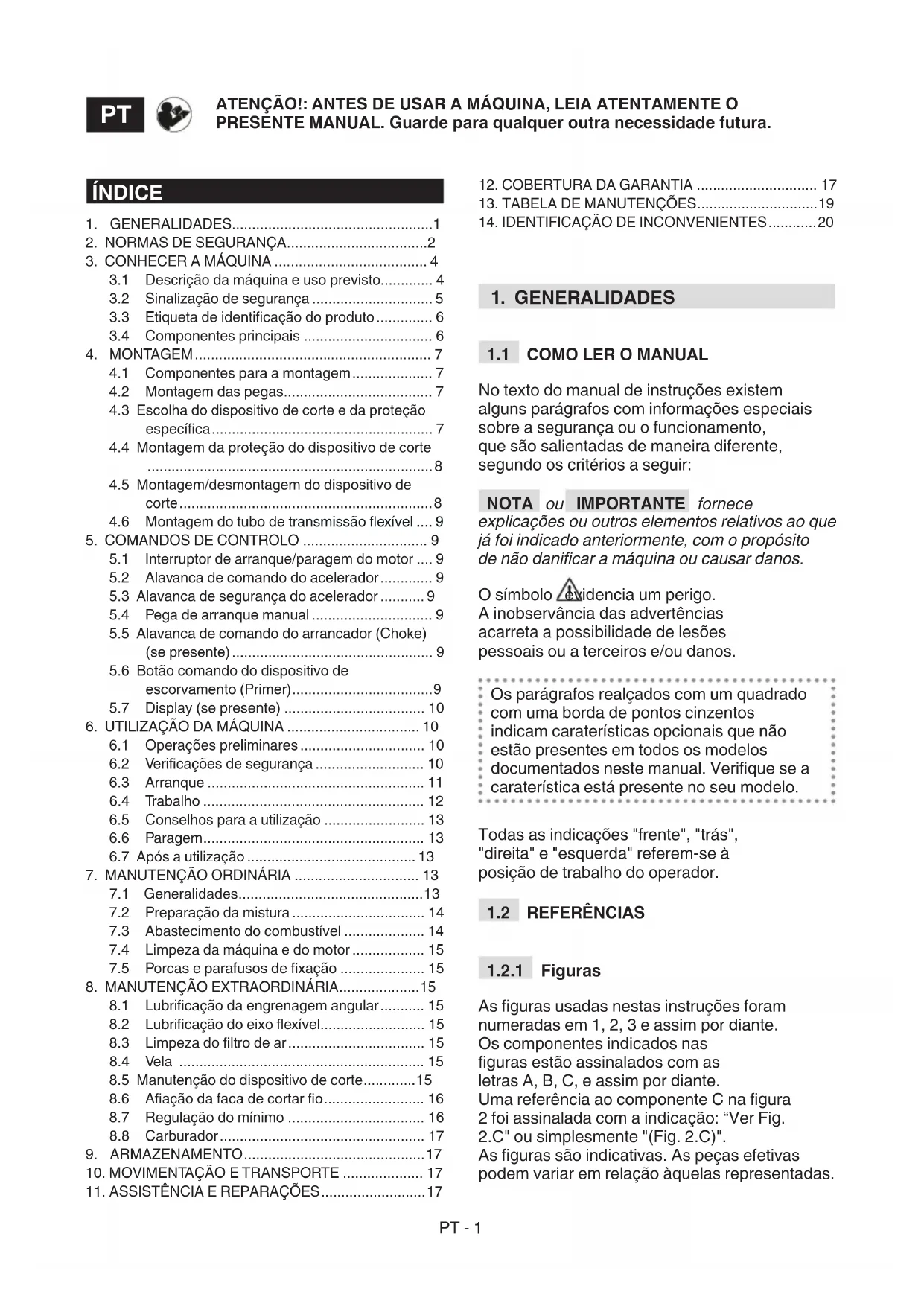 Esta máquina é um equipamento de jardinagem e exatamente moto-roçadeira/ cortadora de cantos portátil com motor térmico, previsto para uso hobby.PT - 5 A máquina compõe-se simplesmente de um motor que, mediante um eixo de transmissão localizado num tubo e uma engrenagem angular, aciona um dispositivo de corte congurado em várias tipologias para efetuar várias funções. O operador é capaz de segurar a máquina com o auxílio de um arnês e pode acionar os comandos principais mantendo-se sempre à distância de segurança do dispositivo de corte.