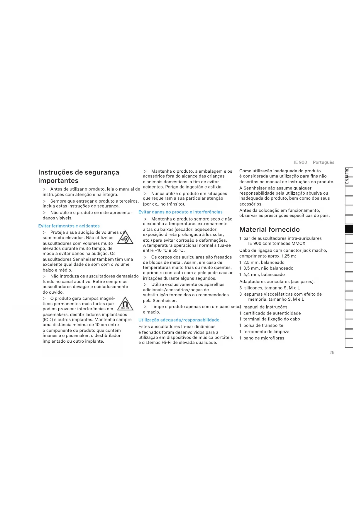IE 900 | Português Instruções de segurança importantes ▷ Antes de utilizar o produto, leia o manual de instruções com atenção e na íntegra. ▷ Sempre que entregar o produto a terceiros, inclua estas instruções de segurança. ▷ Não utilize o produto se este apresentar danos visíveis. Evitar ferimentos e acidentes ▷ Proteja a sua audição de volumes de som muito elevados. Não utilize os auscultadores com volumes muito elevados durante muito tempo, de modo a evitar danos na audição. Os auscultadores Sennheiser também têm uma excelente qualidade de som com o volume baixo e médio. ▷ Não introduza os auscultadores demasiado fundo no canal auditivo. Retire sempre os auscultadores devagar e cuidadosamente do ouvido. ▷ O produto gera campos magné- ticos permanentes mais fortes que podem provocar interferências em pacemakers, desfibriladores implantados (ICD) e outros implantes. Mantenha sempre uma distância mínima de 10 cm entre o componente do produto que contém ímanes e o pacemaker, o desfibrilador implantado ou outro implante. ▷ Mantenha o produto, a embalagem e os acessórios fora do alcance das crianças e animais domésticos, a fim de evitar acidentes. Perigo de ingestão e asfixia. ▷ Nunca utilize o produto em situações que requeiram a sua particular atenção (por ex., no trânsito). Evitar danos no produto e interferências ▷ Mantenha o produto sempre seco e não o exponha a temperaturas extremamente altas ou baixas (secador, aquecedor, exposição direta prolongada à luz solar, etc.) para evitar corrosão e deformações. A temperatura operacional normal situa-se entre –10 °C e 55 °C. ▷ Os corpos dos auriculares são fresados de blocos de metal. Assim, em caso de temperaturas muito frias ou muito quentes, o primeiro contacto com a pele pode causar irritações durante alguns segundos. ▷ Utilize exclusivamente os aparelhos adicionais/acessórios/peças de substituição fornecidos ou recomendados pela Sennheiser. ▷ Limpe o produto apenas com um pano seco e macio. Utilização adequada/responsabilidade Estes auscultadores In-ear dinâmicos e fechados foram desenvolvidos para a utilização em dispositivos de música portáteis e sistemas Hi-Fi de elevada qualidade. Como utilização inadequada do produto é considerada uma utilização para fins não descritos no manual de instruções do produto. A Sennheiser não assume qualquer responsabilidade pela utilização abusiva ou inadequada do produto, bem como dos seus acessórios. Antes da colocação em funcionamento, observar as prescrições específicas do país. Material fornecido 1 par de auscultadores intra-auriculares IE 900 com tomadas MMCX Cabo de ligação com conector jack macho, comprimento aprox. 1,25 m: 1 2,5 mm, balanceado 1 3,5 mm, não balanceado 1 4,4 mm, balanceado Adaptadores auriculares (aos pares): 3 silicones, tamanho S, M e L 3 espumas viscoelásticas com efeito de memória, tamanho S, M e L 1 manual de instruções 1 certificado de autenticidade 1 terminal de fixação do cabo 1 bolsa de transporte 1 ferramenta de limpeza 1 pano de microfibras26 Português | IE 900 Os seus Sennheiser IE 900 Para os apreciadores de música extremamente exigentes, a busca pelo som ideal é uma luta incansável pela perfeição. Inspirado por esta paixão, os IE 900 são os novos topo de gama da série In-ear da Sennheiser que voltam a estabelecer padrões em termos da alta fidelidade. Desde o corpo requintado, passando pela versão melhorada do elogiado conversor XWB de 7 mm, até às características de condutibilidade do seu canal de som: todos os aspetos mais pequenos que sejam foram considerados durante o seu desenvolvimento para tornar o vasto conhecimento acústico da Sennheiser audível nestes auscultadores In-ear. O novo design acústico possui uma bobina de voz melhorada que otimiza a potência em frequências altas de forma a obter um som brilhante e natural. As ressonância naturais e as distorções harmónicas são minimizadas por uma película de membrana otimizada. O resultado destes aperfeiçoamentos é uma reprodução sonora extremamente natural para compensar até o entusiasta áudio mais exigente. Os IE 900 são fabricados por uma equipa de especialistas na fábrica principal da Sennheiser na Alemanha cumprindo as tolerâncias de produção mais rigorosas. Cada transdutor acústico é totalmente testado duas vezes – tanto individualmente antes, como também em conjunto após o emparelhamento do lado direito e esquerdo dos auscultadores. Os transdutores acústicos do lado direito e esquerdo são selecionados para estarem otimamente sintonizados entre si. Esta atenção aos detalhes também é demonstrada pelo design Premium inspirado no áudio profissional. Cada corpo é fresado com precisão a partir de um único bloco de alumínio de elevada qualidade para garantir uma qualidade áudio máxima e simultaneamente um durabilidade extraordinária. Além disso, os IE 900 oferecem uma excelente conectividade com conexões MMCX Fidelity