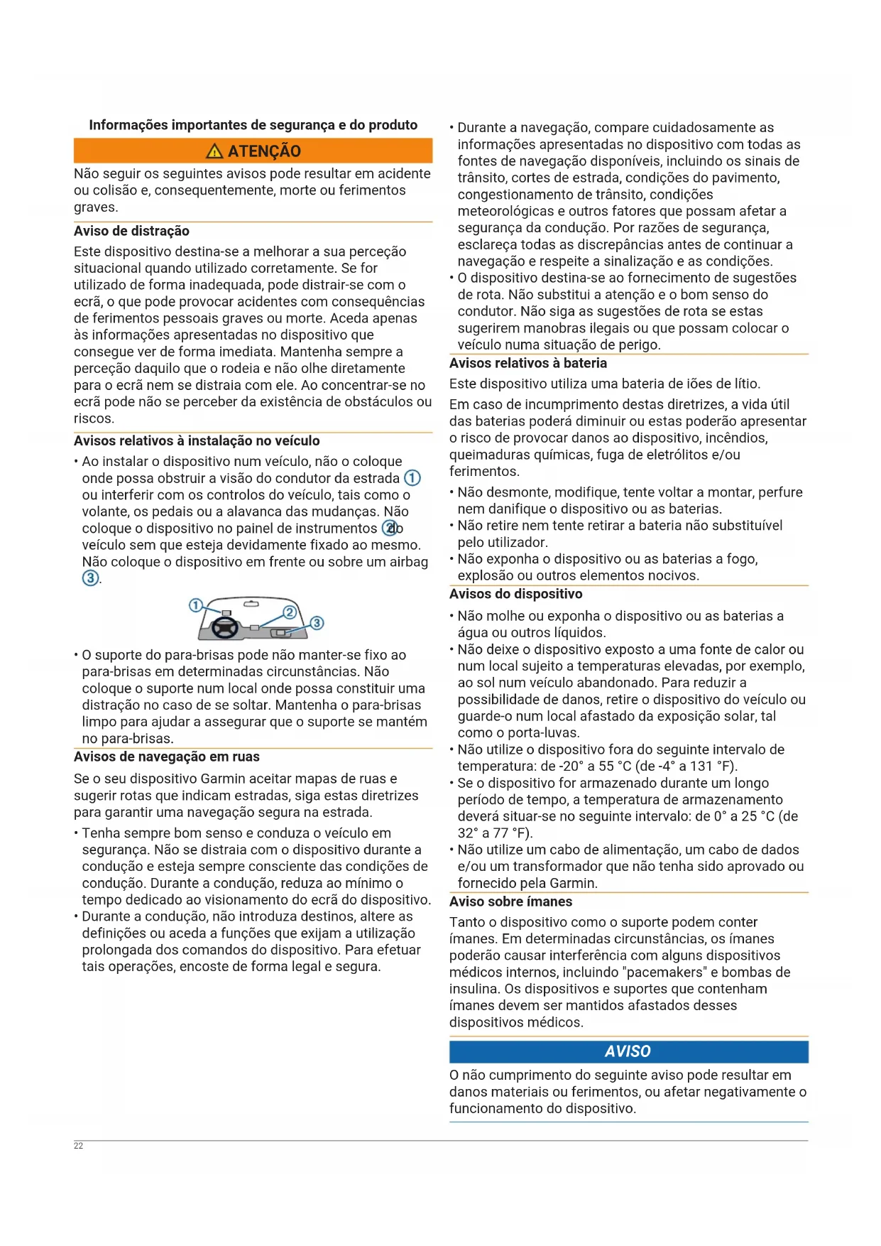 - Não utilize um cabo de alimentação, um cabo de dados e/ou um transformador que não tenha sido aprovado ou fornecido pela Garmin. Aviso sobre ímanes Tanto o dispositivo como o suporte podem conter ímanes. Em determinadas circunstâncias, os ímanes poderão causar interferência com alguns dispositivos médicos internos, incluindo "pacemakers" e bombas de insulina. Os dispositivos e suportes que contenham ímanes devem ser mantidos afastados desses dispositivos médicos. AVISO O não cumprimento do seguinte aviso pode resultar em danos materiais ou ferimentos, ou afetar negativamente o funcionamento do dispositivo. 22Avisos acerca da bateria