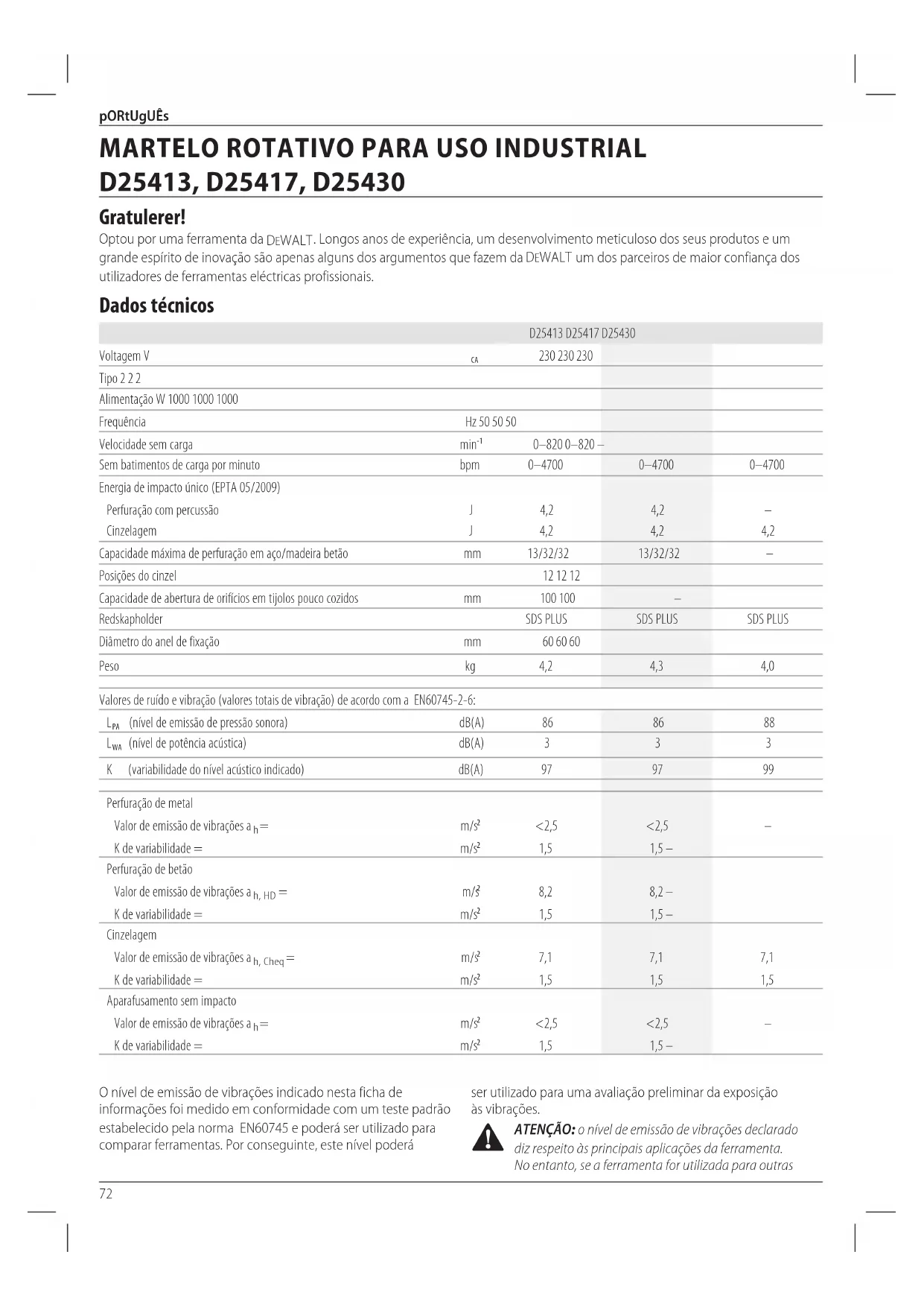 D25413, D25417, D25430 Gratulerer! Optou por uma ferramenta da DeWALT . Longos anos de experiência, um desenvolvimento meticuloso dos seus produtos e um grande espírito de inovação são apenas alguns dos argumentos que fazem da DeWALT um dos parceiros de maior confiança dos utilizadores de ferramentas eléctricasprofissionais. Dados técnicos D25413 D25417 D25430 Voltagem V
