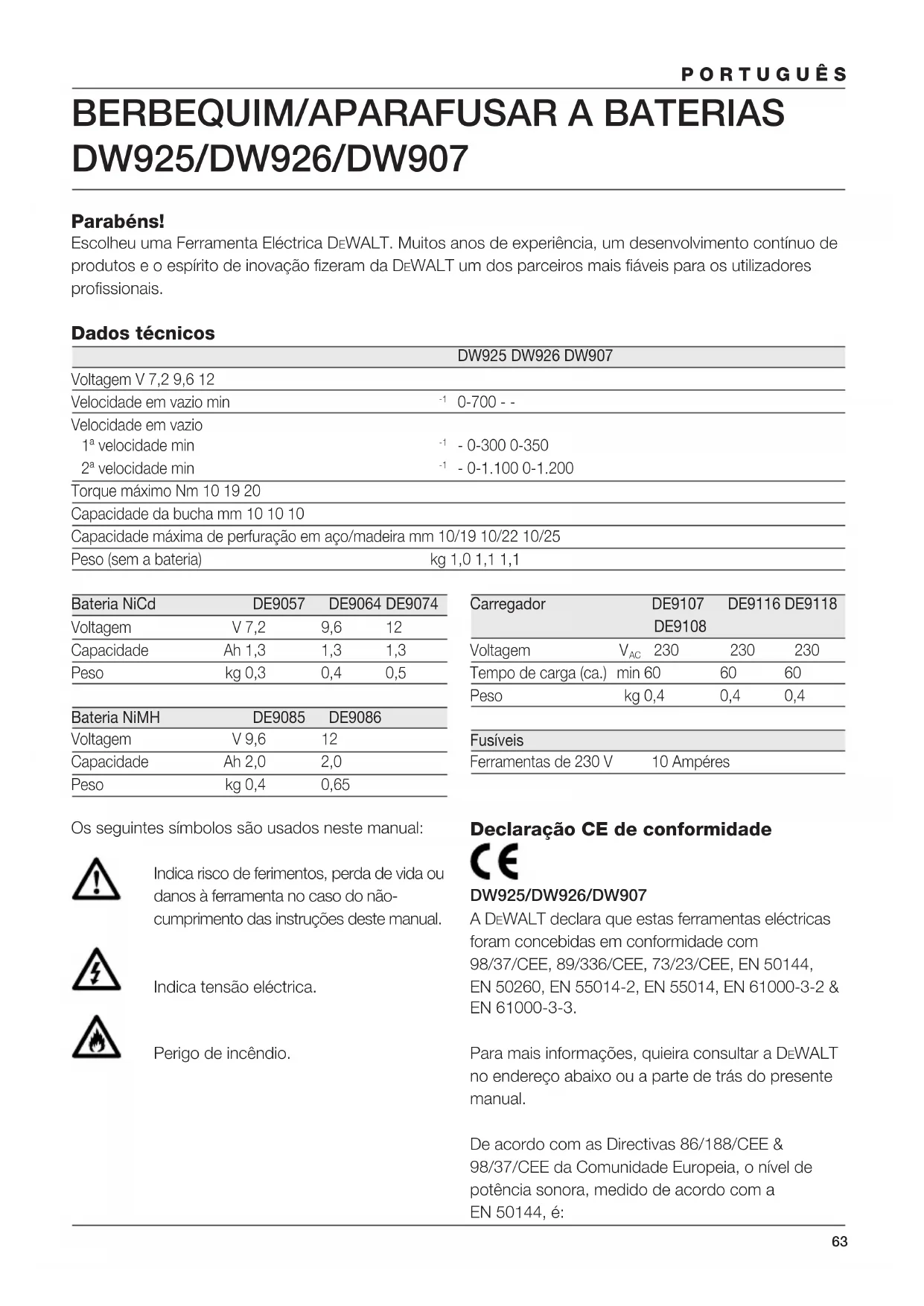 Tempo de carga (ca.) min 60 60 60 Peso kg 0,4 0,4 0,4 Fusíveis Ferramentas de 230 V 10 Ampéres Os seguintes símbolos são usados neste manual: Indica risco de ferimentos, perda de vida ou danos à ferramenta no caso do não- cumprimento das instruções deste manual. Indica tensão eléctrica. Perigo de incêndio.64 PORTUGUÊS DW925 DW926 DW907