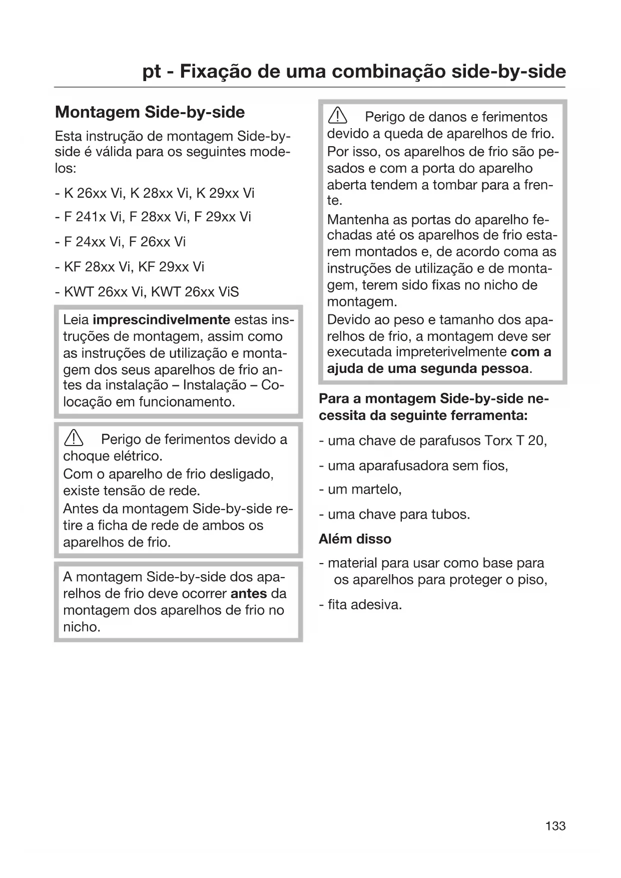 Montagem Side-by-side Esta instrução de montagem Side-by- side é válida para os seguintes mode- los: - K 26xx Vi, K 28xx Vi, K 29xx Vi - F 241x Vi, F 28xx Vi, F 29xx Vi - F 24xx Vi, F 26xx Vi - KF 28xx Vi, KF 29xx Vi - KWT 26xx Vi, KWT 26xx ViS Leia imprescindivelmente estas ins- truções de montagem, assim como as instruções de utilização e monta- gem dos seus aparelhos de frio an- tes da instalação – Instalação – Co- locação em funcionamento. Perigo de ferimentos devido a choque elétrico. Com o aparelho de frio desligado, existe tensão de rede. Antes da montagem Side-by-side re- tire a ficha de rede de ambos os aparelhos de frio. A montagem Side-by-side dos apa- relhos de frio deve ocorrer antes da montagem dos aparelhos de frio no nicho. Perigo de danos e ferimentos devido a queda de aparelhos de frio. Por isso, os aparelhos de frio são pe- sados e com a porta do aparelho aberta tendem a tombar para a fren- te. Mantenha as portas do aparelho fe- chadas até os aparelhos de frio esta- rem montados e, de acordo coma as instruções de utilização e de monta- gem, terem sido fixas no nicho de montagem. Devido ao peso e tamanho dos apa- relhos de frio, a montagem deve ser executada impreterivelmente com a ajuda de uma segunda pessoa. Para a montagem Side-by-side ne- cessita da seguinte ferramenta: - uma chave de parafusos Torx T 20, - uma aparafusadora sem fios, - um martelo, - uma chave para tubos. Além disso - material para usar como base para os aparelhos para proteger o piso, - fita adesiva.pt - Fixação de uma combinação side-by-side