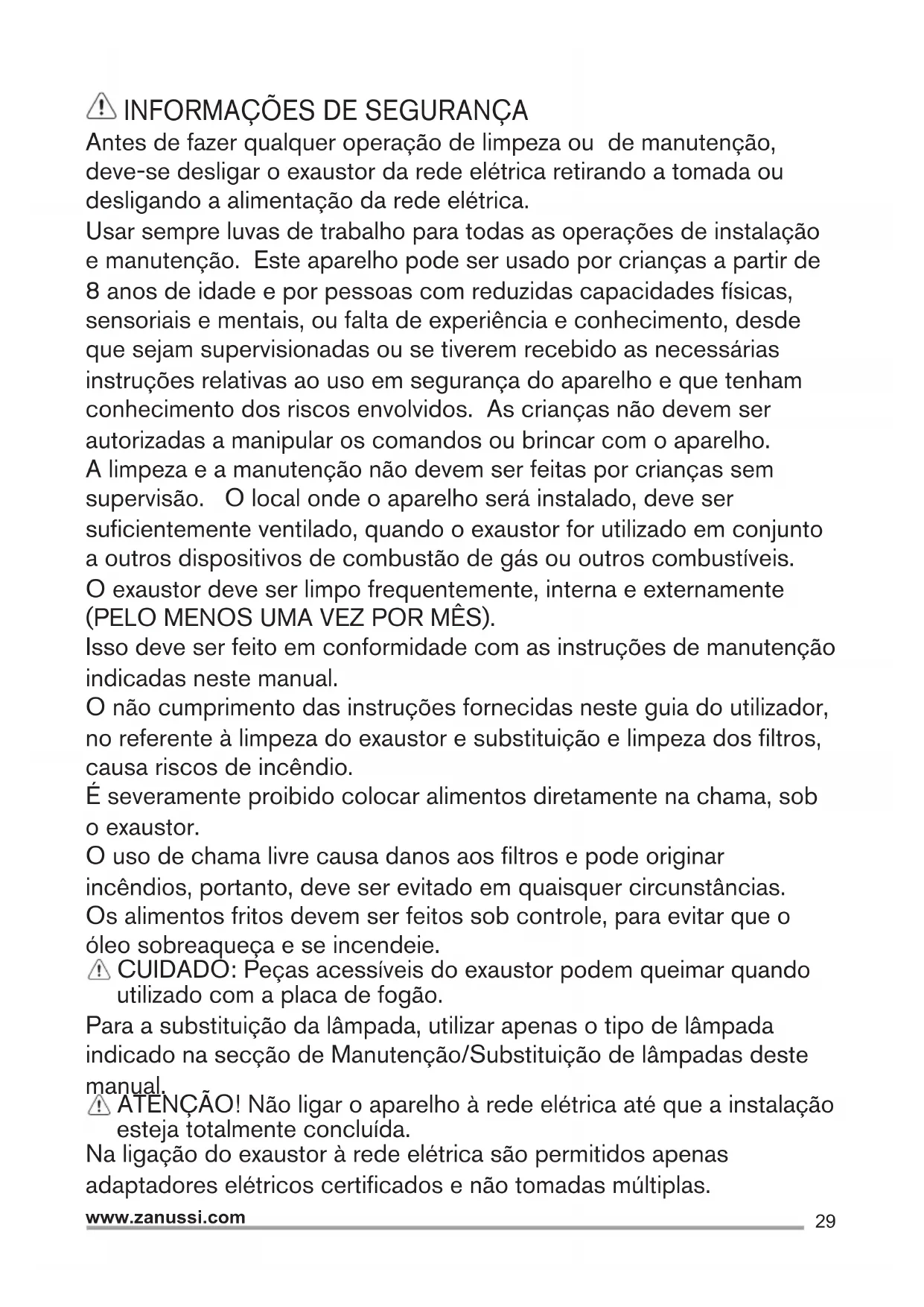 Antes de fazer qualquer operação de limpeza ou de manutenção, deve-se desligar o exaustor da rede elétrica retirando a tomada ou desligando a alimentação da rede elétrica. Usar sempre luvas de trabalho para todas as operações de instalação e manutenção. Este aparelho pode ser usado por crianças a partir de 8 anos de idade e por pessoas com reduzidas capacidades físicas, sensoriais e mentais, ou falta de experiência e conhecimento, desde que sejam supervisionadas ou se tiverem recebido as necessárias instruções relativas ao uso em segurança do aparelho e que tenham conhecimento dos riscos envolvidos. As crianças não devem ser autorizadas a manipular os comandos ou brincar com o aparelho. A limpeza e a manutenção não devem ser feitas por crianças sem supervisão. O local onde o aparelho será instalado, deve ser suficientemente ventilado, quando o exaustor for utilizado em conjunto a outros dispositivos de combustão de gás ou outros combustíveis. O exaustor deve ser limpo frequentemente, interna e externamente (PELO MENOS UMA VEZ POR MÊS). Isso deve ser feito em conformidade com as instruções de manutenção indicadas neste manual. O não cumprimento das instruções fornecidas neste guia do utilizador, no referente à limpeza do exaustor e substituição e limpeza dos filtros, causa riscos de incêndio. É severamente proibido colocar alimentos diretamente na chama, sob o exaustor. O uso de chama livre causa danos aos filtros e pode originar incêndios, portanto, deve ser evitado em quaisquer circunstâncias. Os alimentos fritos devem ser feitos sob controle, para evitar que o óleo sobreaqueça e se incendeie. CUIDADO: Peças acessíveis do exaustor podem queimar quando utilizado com a placa de fogão. Para a substituição da lâmpada, utilizar apenas o tipo de lâmpada indicado na secção de Manutenção/Substituição de lâmpadas deste manual. ATENÇÃO! Não ligar o aparelho à rede elétrica até que a instalação esteja totalmente concluída. Na ligação do exaustor à rede elétrica são permitidos apenas adaptadores elétricos certificados e não tomadas múltiplas.30 www.zanussi.com