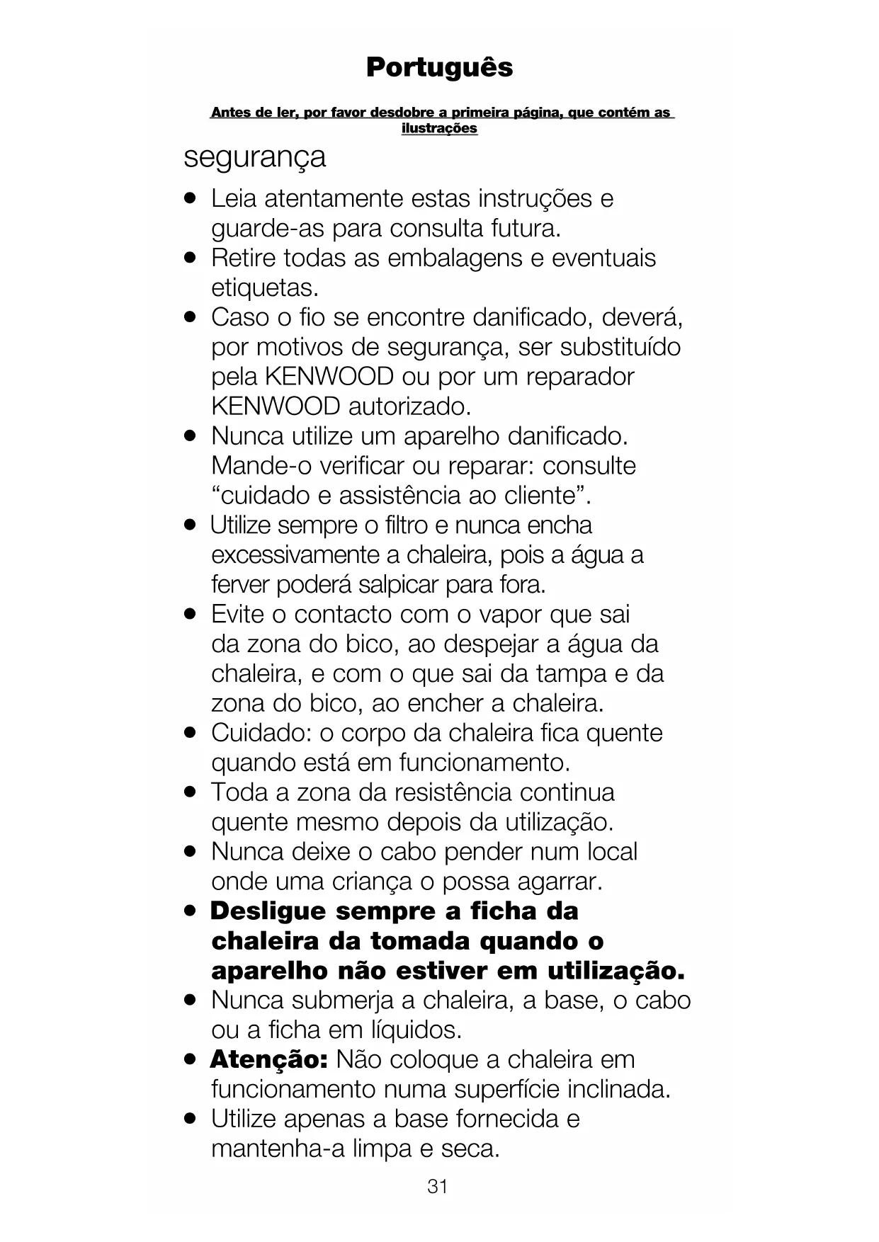 Use o aparelho apenas para o fim doméstico a que se destina. A Kenwood não se responsabiliza caso o aparelho seja utilizado de forma inadequada, ou caso estas instruções não sejam respeitadas. antes de ligar à corrente Certifique-se de que a tensão da sua fonte de alimentação eléctrica é a mesma que a exibida na parte inferior da sua chaleira. AVISO: ESTE APARELHO DEVE SER LIGADO A UMA TOMADA COM LIGAÇÃO À TERRA. Este aparelho está conforme com a Directiva n.º 1935/2004 da Comunidade Europeia sobre materiais concebidos para estarem em contacto com alimentos. antes de utilizar pela primeira vez1 Enrole o fio em excesso à volta das pegas e por baixo da base eléctrica.2 Encha de água até à marca “MAX”, ferva-a, depois despeje-a. Repita 3 vezes. chave a tampab interruptor de ligar/desligarc base eléctrica de 360°d luz indicadora de chaleira ligada (on)e arrumação do cabof filtroA medida do nível da água para usar a sua chaleira 1 Encha a chaleira retirando a tampa. O nível da água deve estar entre o ‘MAX’ e o ‘MIN’ (250 ml) no indicador de nível (A). Se a sua água doméstica é dura recomendamos que utilize água de garrafão ou água filtrada para manter o aspecto e a eficácia da sua chaleira. Seja económico, não ferva mais água do que a necessária. Para melhorar a qualidade das suas bebidas, utilize sempre água fresca.34 English