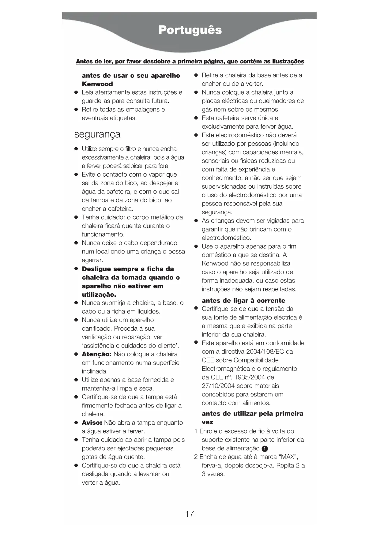 Use o aparelho apenas para o fim doméstico a que se destina. A Kenwood não se responsabiliza caso o aparelho seja utilizado de forma inadequada, ou caso estas instruções não sejam respeitadas. antes de ligar à corrente