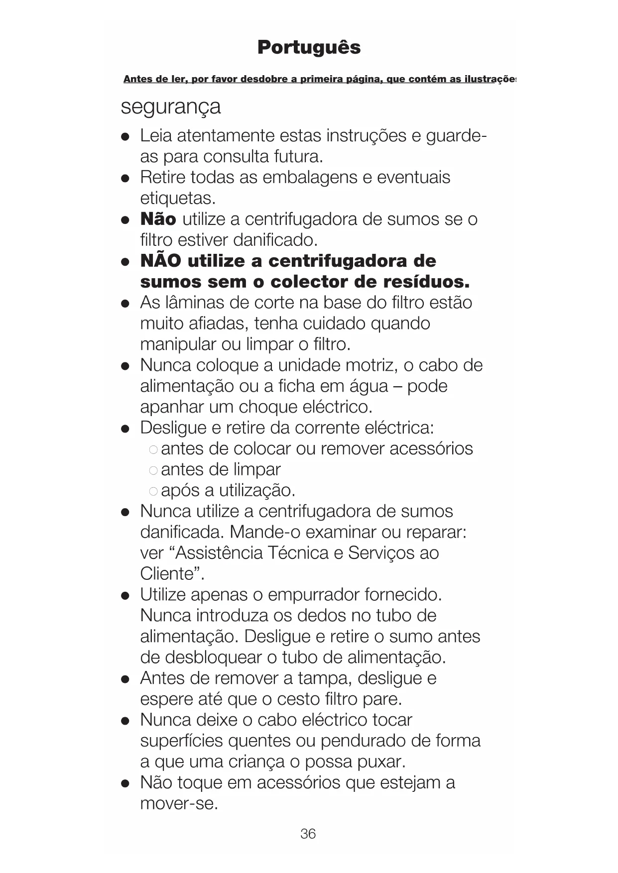 ntes de ler, por favor desdobre a primeira página, que contém as ilustrações Português● Nunca deixe a centrifugadora de sumos ligada sem vigilância.
