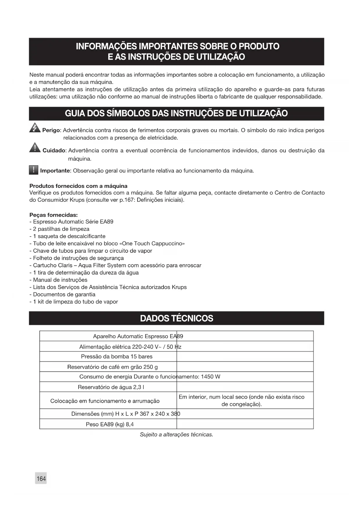 Caro/a Cliente, Parabéns pela aquisição da sua Espresso Automatic Série EA89. Com este novo produto, poderá realizar mais de 14 bebidas quentes: espresso, espresso duplo, café, café duplo, ristretto, doppio, americano, cappuccino, cappuccino duplo, latte, latte duplo, espuma de leite, chá verde, chá preto, infusão. Para além desta vasta escolha, a máquina oferece inúmeras possibilidades de personalização de bebidas. Poderá, por exemplo, utilizar uma função que reforça a intensidade do café, caso aprecie preparações mais fortes. Pode alterar o volume, a intensidade e a temperatura das suas bebidas. As bebidas consumidas com maior frequência cam acessíveis com um simples toque na interface principal. O visor, por sua vez, permite acompanhar a preparação do café ou aceder facilmente aos diversos menus. A maior parte das bebidas podem ser realizadas aos pares, para poupar tempo e conviver mais. Graças à tecnologia KRUPS Quattro force, que inclui um termobloco ”Compact System” com câmara de percolação integrada, uma bomba de 15 bares e funcionamento com café em grão acabado de moer mesmo antes da extração, a sua máquina permitir-lhe-á obter cafés ristretto, espressos e cafés logo na primeira chávena com um máximo de aromas e com espuma castanha clara. Tradicionalmente, e para que a bebida possa expressar todo o seu sabor, o espresso é servido em pequenas chávenas de porcelana com fundo mais estreito. Para obter um espresso com temperatura ideal e uma espuma bem compacta, recomendamos que aqueça as suas chávenas. Precisará provavelmente de várias tentativas antes de encontrar o café em grão do seu agrado. Ao mudar de mistura e/ou torrefação, conseguirá obter o resultado ideal. O aroma do café espresso é mais intenso do que o de um café de ltro clássico. Apesar de ter um sabor mais pronunciado, muito encorpado e mais persistente, o espresso contém menos café do que o café de máquina de ltro (cerca de 60 a 80 mg por chávena comparativamente com 80 a 100 mg por chávena) devido a uma percolação mais curta. A qualidade da água utilizada é também um outro fator determinante para a qualidade do resultado na chávena. O ideal é utilizar a água acabada de sair da torneira (para que esta não tenha tempo de car estagnada em contacto com o ar), sem odor a cloro e fria. As teclas táteis, ergonómicas e confortáveis facilitam a navegação. Será guiado ao longo das várias etapas, da preparação da bebida até às operações de manutenção. Desejamos que passe excelentes momentos com a sua máquina Krups. A equipa Krups162 Para que tire o melhor partido da sua máquina e obtenha cafés de qualidade, considere os seguintes conselhos: