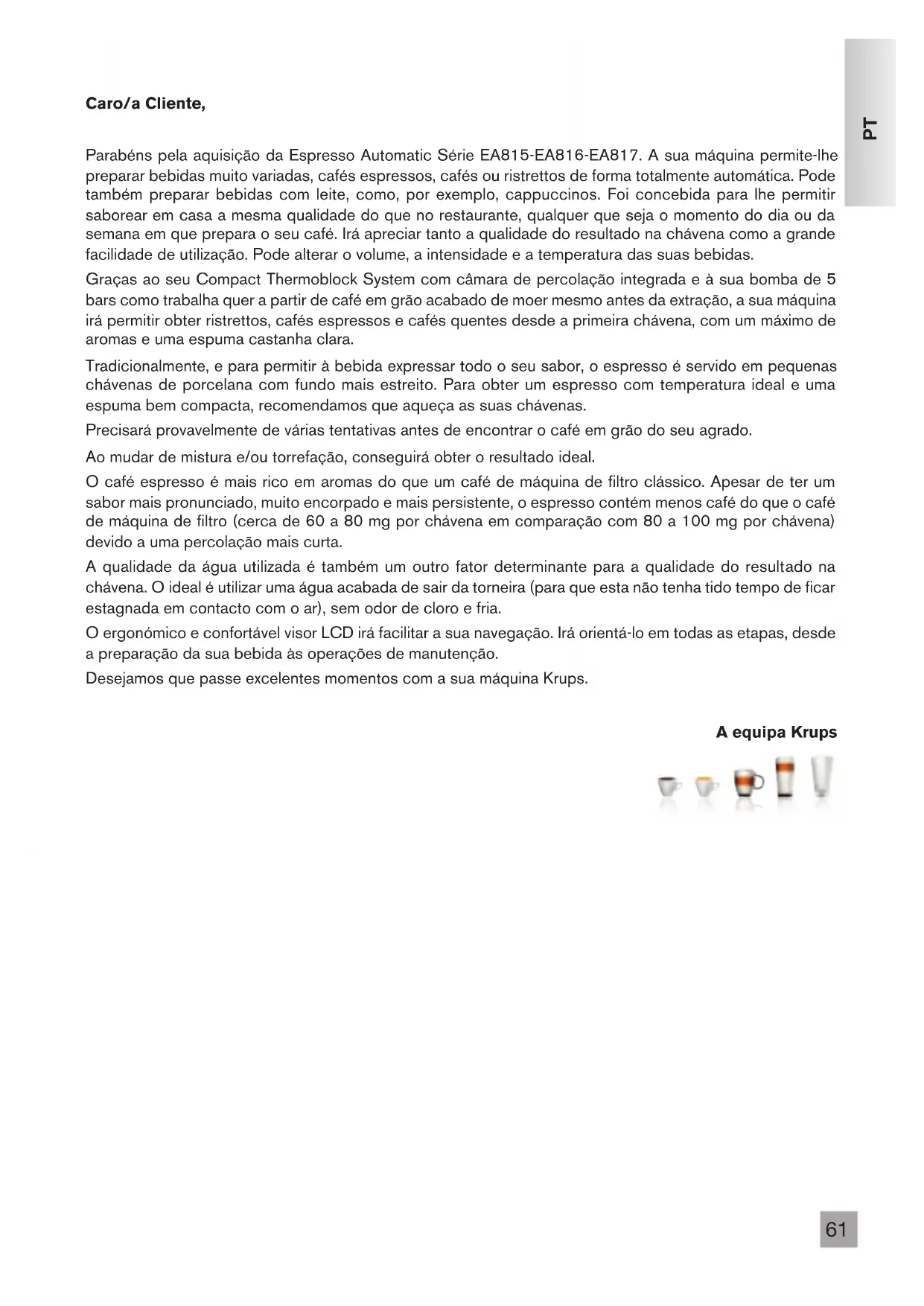 Caro/a Cliente, Parabéns pela aquisição da Espresso Automatic Série EA815-EA816-EA817. A sua máquina permite-lhe preparar bebidas muito variadas, cafés espressos, cafés ou ristrettos de forma totalmente automática. Pode também preparar bebidas com leite, como, por exemplo, cappuccinos. Foi concebida para lhe permitir saborear em casa a mesma qualidade do que no restaurante, qualquer que seja o momento do dia ou da semana em que prepara o seu café. Irá apreciar tanto a qualidade do resultado na chávena como a grande facilidade de utilização. Pode alterar o volume, a intensidade e a temperatura das suas bebidas. Graças ao seu Compact Thermoblock System com câmara de percolação integrada e à sua bomba de 5 bars como trabalha quer a partir de café em grão acabado de moer mesmo antes da extração, a sua máquina irá permitir obter ristrettos, cafés espressos e cafés quentes desde a primeira chávena, com um máximo de aromas e uma espuma castanha clara. Tradicionalmente, e para permitir à bebida expressar todo o seu sabor, o espresso é servido em pequenas chávenas de porcelana com fundo mais estreito. Para obter um espresso com temperatura ideal e uma espuma bem compacta, recomendamos que aqueça as suas chávenas. Precisará provavelmente de várias tentativas antes de encontrar o café em grão do seu agrado. Ao mudar de mistura e/ou torrefação, conseguirá obter o resultado ideal. O café espresso é mais rico em aromas do que um café de máquina de filtro clássico. Apesar de ter um sabor mais pronunciado, muito encorpado e mais persistente, o espresso contém menos café do que o café de máquina de filtro (cerca de 60 a 80 mg por chávena em comparação com 80 a 100 mg por chávena) devido a uma percolação mais curta. A qualidade da água utilizada é também um outro fator determinante para a qualidade do resultado na chávena. O ideal é utilizar uma água acabada de sair da torneira (para que esta não tenha tido tempo de ficar estagnada em contacto com o ar), sem odor de cloro e fria. O ergonómico e confortável visor LCD irá facilitar a sua navegação. Irá orientá-lo em todas as etapas, desde a preparação da sua bebida às operações de manutenção. Desejamos que passe excelentes momentos com a sua máquina Krups. A equipa Krups62 TABELA DE SIGNIFICADO DAS TECLAS E DOS BOTÕES DE FUNÇÕES