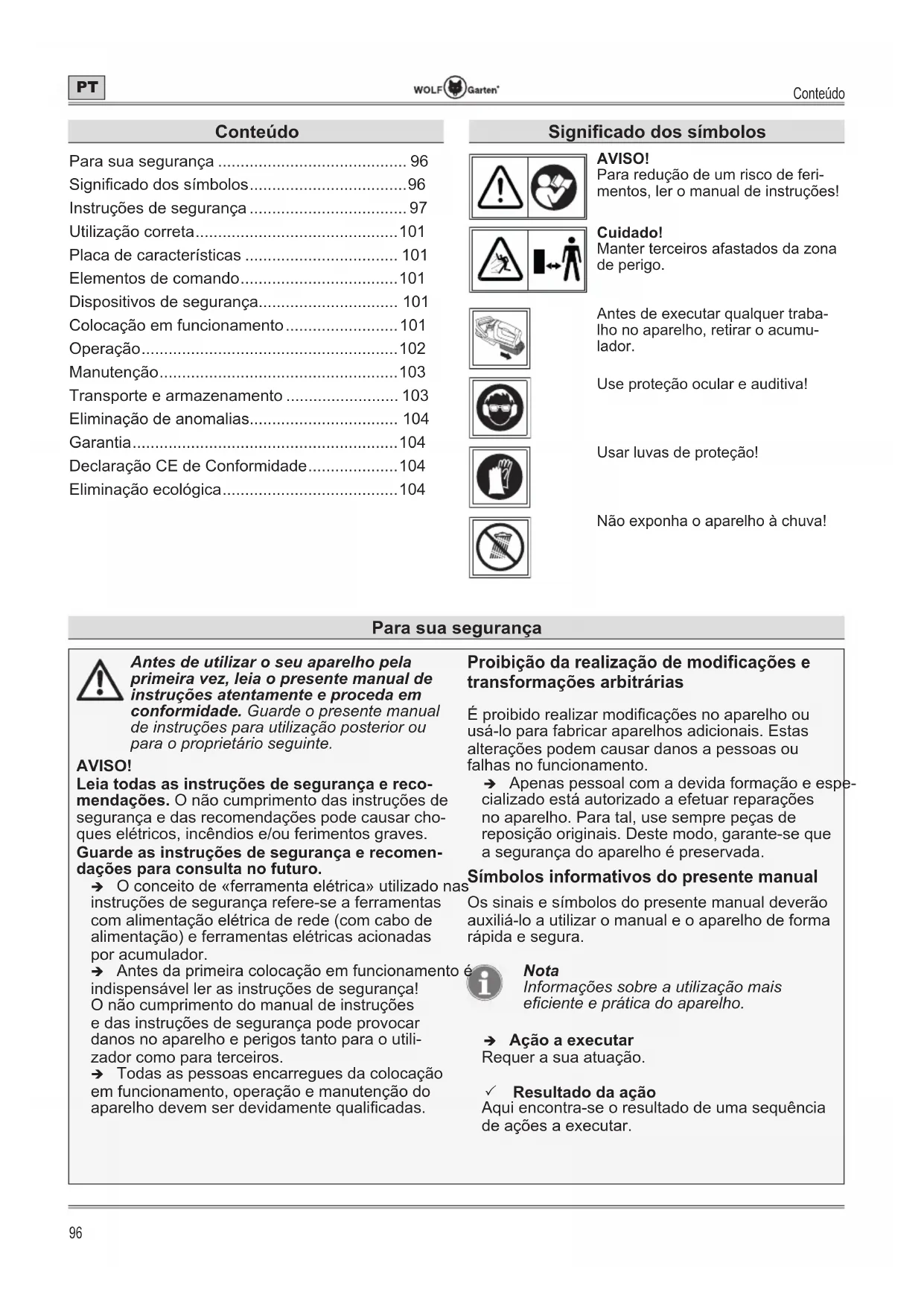 - Eliminação ecológica Signicado dos símbolos AVISO! Para redução de um risco de feri- mentos, ler o manual de instruções! Cuidado! Manter terceiros afastados da zona de perigo. Antes de executar qualquer traba- lho no aparelho, retirar o acumu- lador. Use proteção ocular e auditiva! Usar luvas de proteção! Não exponha o aparelho à chuva! Para sua segurançaPara sua segurança p. 104