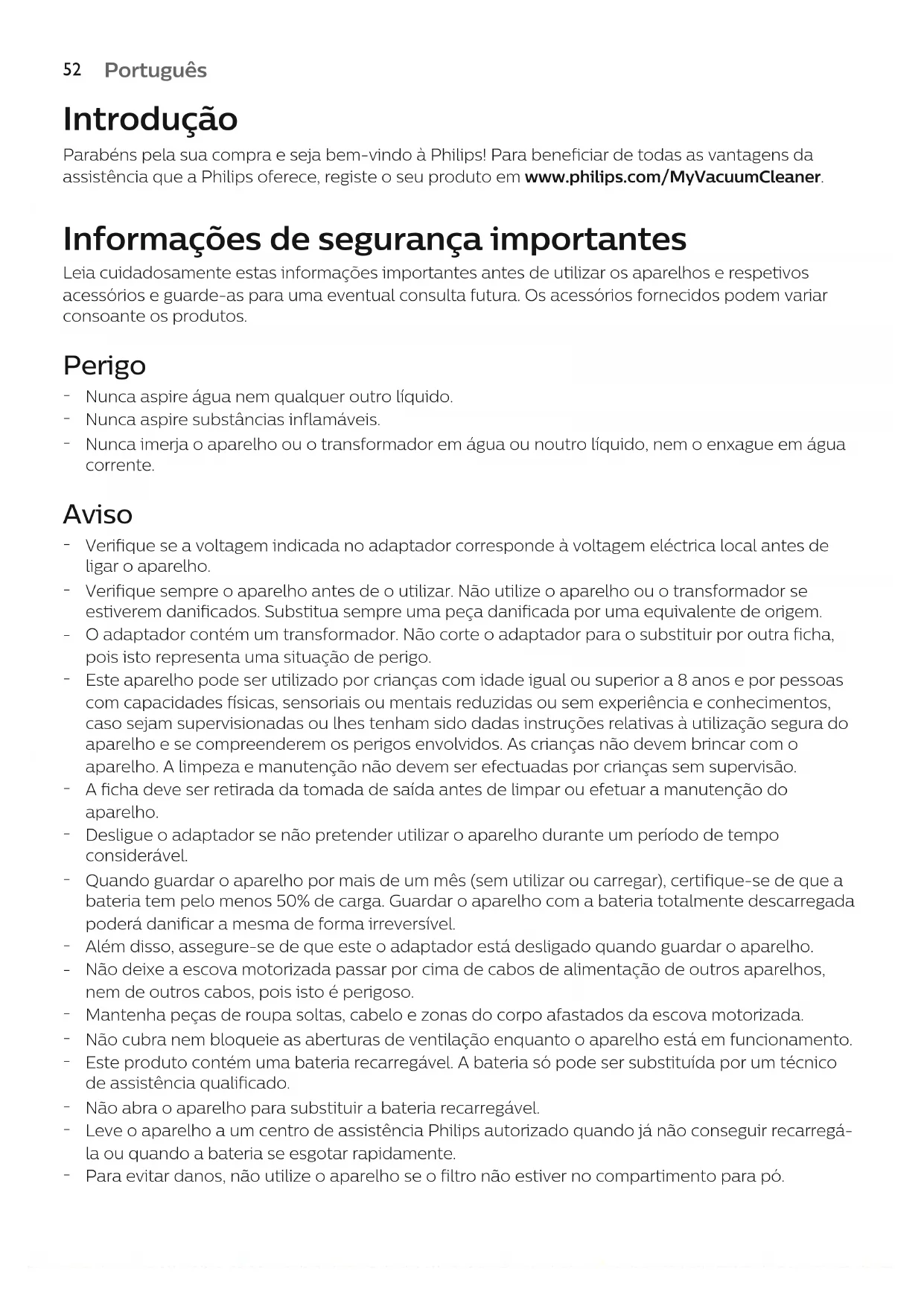 Português Introdução Parabéns pela sua compra e seja bem-vindo à Philips! Para beneficiar de todas as vantagens da assistência que a Philips oferece, registe o seu produto em www.philips.com/MyVacuumCleaner. Informações de segurança importantes Leia cuidadosamente estas informações importantes antes de utilizar os aparelhos e respetivos acessórios e guarde-as para uma eventual consulta futura. Os acessórios fornecidos podem variar consoante os produtos. Perigo