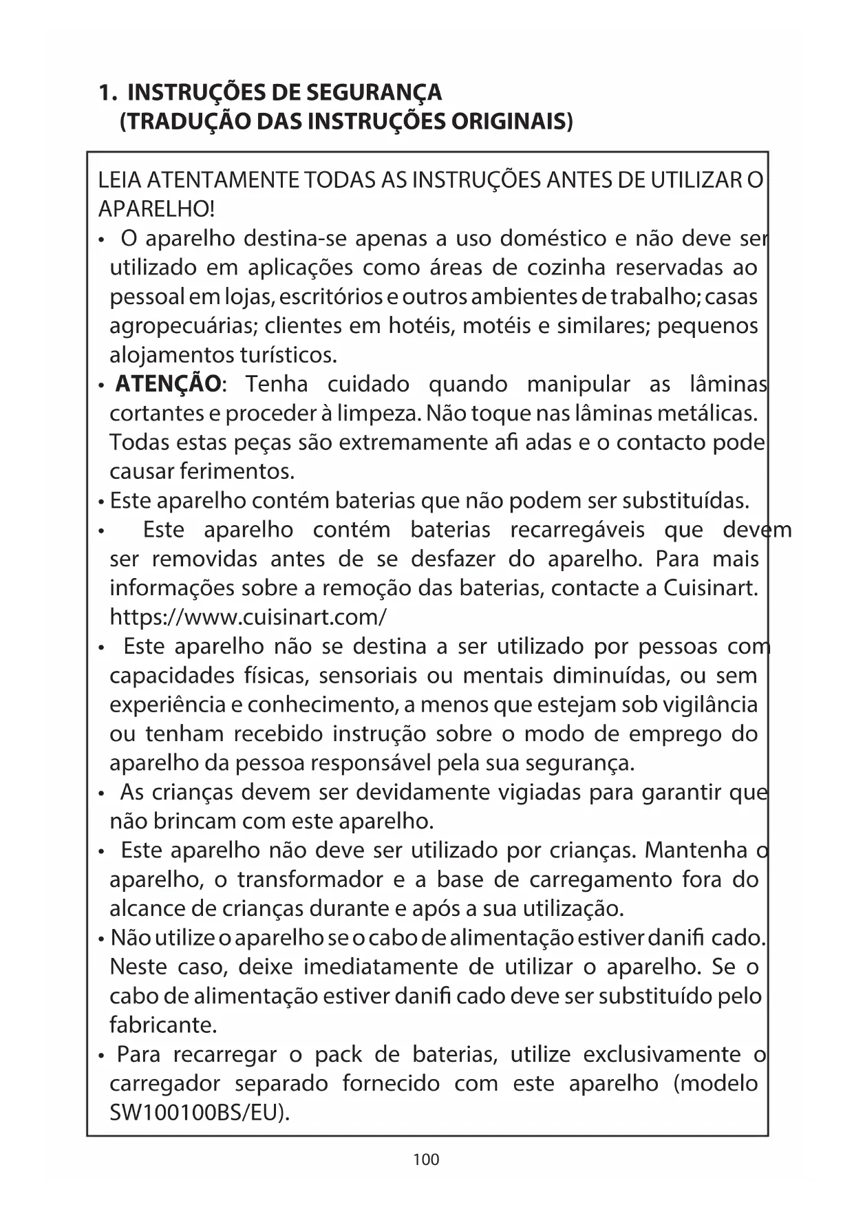 - Para recarregar o pack de baterias, utilize exclusivamente o carregador separado fornecido com este aparelho (modelo SW100100BS/EU).101