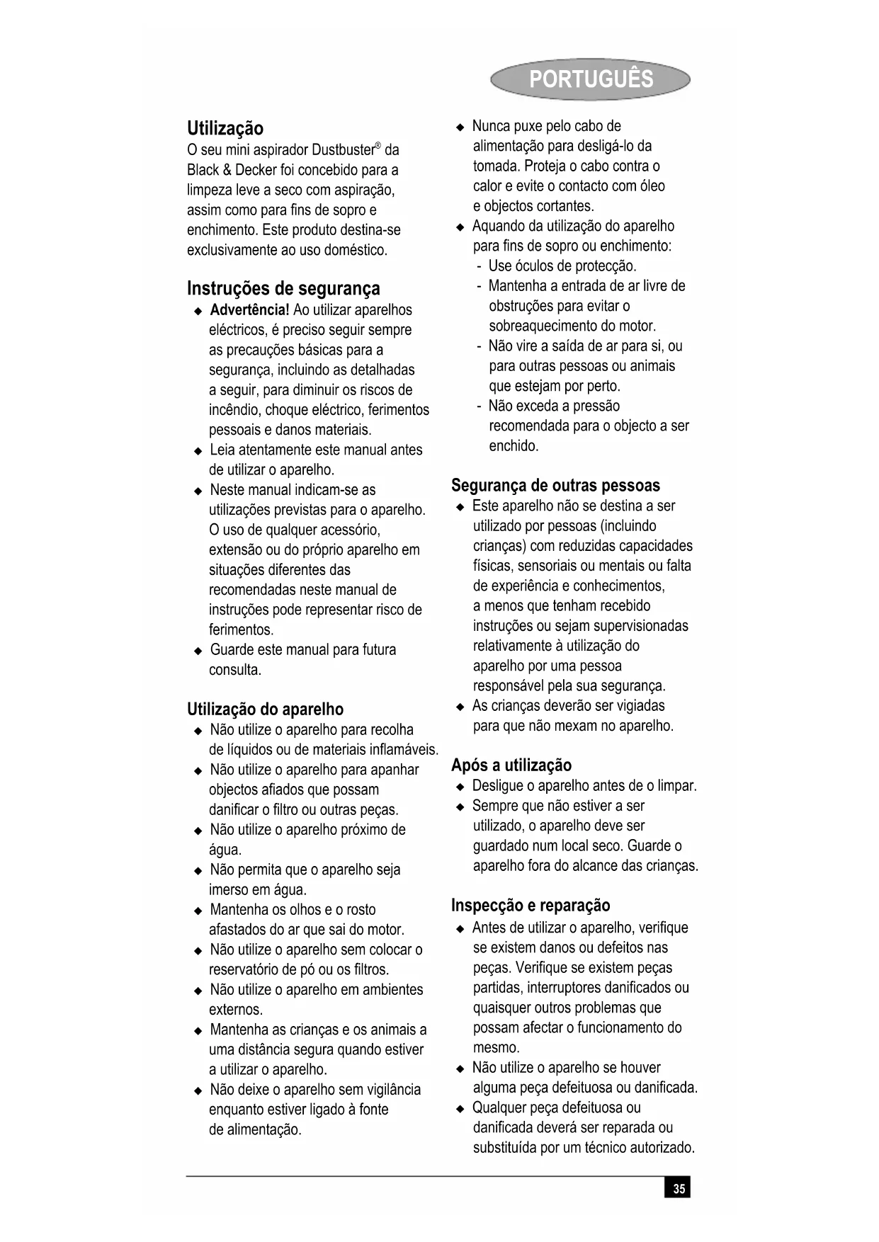 Black & Decker foi concebido para a limpeza leve a seco com aspiração, assim como para fins de sopro e enchimento. Este produto destina-se exclusivamente ao uso doméstico. Instruções de segurança Advertência! Ao utilizar aparelhos eléctricos, é preciso seguir sempre as precauções básicas para a segurança, incluindo as detalhadas a seguir, para diminuir os riscos de incêndio, choque eléctrico, ferimentos pessoais e danos materiais. Leia atentamente este manual antes de utilizar o aparelho. Neste manual indicam-se as utilizações previstas para o aparelho. O uso de qualquer acessório, extensão ou do próprio aparelho em situações diferentes das recomendadas neste manual de instruções pode representar risco de ferimentos. Guarde este manual para futura consulta. Utilização do aparelho Não utilize o aparelho para recolha de líquidos ou de materiais inflamáveis. Não utilize o aparelho para apanhar objectos afiados que possam danificar o filtro ou outras peças. Não utilize o aparelho próximo de água. Não permita que o aparelho seja imerso em água. Mantenha os olhos e o rosto afastados do ar que sai do motor. Não utilize o aparelho sem colocar o reservatório de pó ou os filtros. Não utilize o aparelho em ambientes externos. Mantenha as crianças e os animais a uma distância segura quando estiver a utilizar o aparelho. Não deixe o aparelho sem vigilância enquanto estiver ligado à fonte de alimentação. Nunca puxe pelo cabo de alimentação para desligá-lo da tomada. Proteja o cabo contra o calor e evite o contacto com óleo e objectos cortantes. Aquando da utilização do aparelho para fins de sopro ou enchimento: - Use óculos de protecção. - Mantenha a entrada de ar livre de obstruções para evitar o sobreaquecimento do motor. - Não vire a saída de ar para si, ou para outras pessoas ou animais que estejam por perto. - Não exceda a pressão recomendada para o objecto a ser enchido. Segurança de outras pessoas Este aparelho não se destina a ser utilizado por pessoas (incluindo crianças) com reduzidas capacidades físicas, sensoriais ou mentais ou falta de experiência e conhecimentos, a menos que tenham recebido instruções ou sejam supervisionadas relativamente à utilização do aparelho por uma pessoa responsável pela sua segurança. As crianças deverão ser vigiadas para que não mexam no aparelho. Após a utilização Desligue o aparelho antes de o limpar. Sempre que não estiver a ser utilizado, o aparelho deve ser guardado num local seco. Guarde o aparelho fora do alcance das crianças. Inspecção e reparação Antes de utilizar o aparelho, verifique se existem danos ou defeitos nas peças. Verifique se existem peças partidas, interruptores danificados ou quaisquer outros problemas que possam afectar o funcionamento do mesmo. Não utilize o aparelho se houver alguma peça defeituosa ou danificada. Qualquer peça defeituosa ou danificada deverá ser reparada ou substituída por um técnico autorizado.36 PORTUGUÊS Verifique regularmente se o cabo de alimentação se encontra em condições. Se o cabo de alimentação estiver danificado, deverá ser substituído pelo fabricante ou por um Centro de Assistência autorizado pela Black & Decker, de modo a evitar riscos. Nunca tente remover nem substituir peças por outras que não as especificadas neste manual. Segurança eléctrica