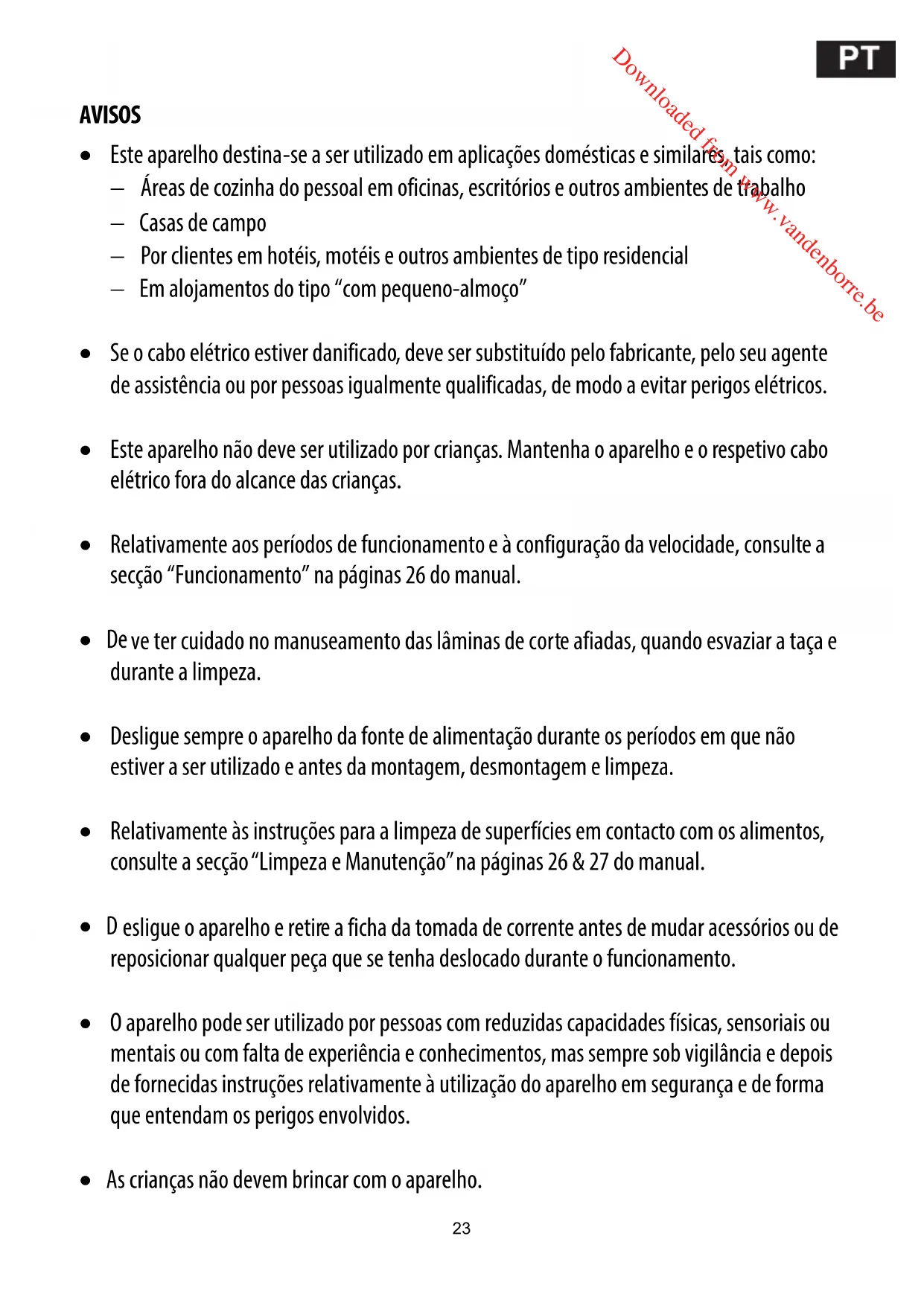 Downloaded from www.vandenborre.beAVISOS Este aparelho destina-se a ser utilizado em aplicações domésticas e similares, tais como: Áreas de cozinha do pessoal em oficinas, escritórios e outros ambientes de trabalho Casas de campo Por clientes em hotéis, motéis e outros ambientes de tipo residencial Em alojamentos do tipo “com pequeno-almoço” Se o cabo elétrico estiver danificado, deve ser substituído pelo fabricante, pelo seu agente de assistência ou por pessoas igualmente qualificadas, de modo a evitar perigos elétricos. Este aparelho não deve ser utilizado por crianças. Mantenha o aparelho e o respetivo cabo elétrico fora do alcance das crianças. Relativamente aos períodos de funcionamento e à configuração da velocidade, consulte a secção “Funcionamento” na páginas 26 do manual.