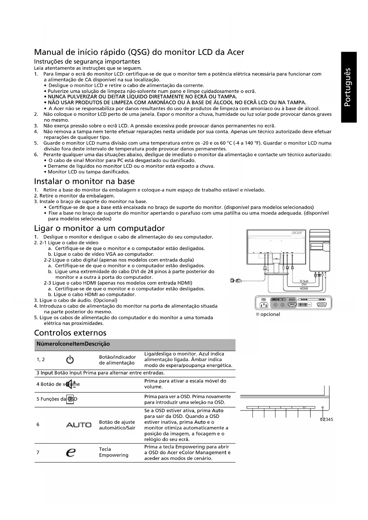 (típico) Contraste máx. de 100.000.000:1 (ACM) Ângulo de visualização 170° (H) 160° (V) (CR=10) Tempo de resposta 5 ms (On/Off) Tipo de painel TN Vídeo Interface analógica R, G, B Frequência H 31 kHz - 83 kHz Frequência V 56 - 76 Hz Cores do visor 16,7 Milhões Sincronismo de pontos 170 MHz Resolução máxima 1920 x 1080 @ 60 Hz Plug&Play VESA DDCCI/DDC2B Classe de eficiência energética A+ *Consumo de energia anual 28 kWh (modelo com entrada HDMI) Consumo de energia (até 200 nits) Ligado 26,60 W (típico) Hibernação 0,43 W (típico) Desligado 0,24 W (típico) Conector de entrada D-Sub DVI-D de 24 pinos (somente nos modelos com entrada dupla) HDMI com 19 pinos (somente nos modelos com entrada HDMI) Sinal de entrada de vídeo Analógico: 0,7 Vp-p (padrão), 75 OHM, Positivo Sinal digital (somente nos modelos com entrada dupla) Sinal HDMI (somente nos modelos com entrada HDMI) (opcional) Alto-falantes 2 W x 2 (somente nos modelos com entrada de áudio — opcional) Tamanho máximo da tela Horizontal: 543,744 mm Vertical: 302,616 mm Fonte de alimentação 100-240 V, 50/60 Hz Condições do ambiente Temperatura de funcionamento: de 0 a 40 °C Temperatura de armazenamento: de -20 a 60 °C Umidade operacional: 20% a 85% Dimensões 557,89 (L) x 430,69 (A) x 212,91 (P) mm Peso (líquido) 4,2 kg (líq.) Especificações do mecanismo Inclinação: de -5 a +20° Rotação: Não Ajuste de altura: Não Giro: Não Suporte separável: Sim Controles externos Botões Botão ON/OFF Entrada Volume MENU/ENTRAR Auto/Sair Tecla E (Empowering) Funções Acer eColor Management Contraste Brilho Foco Sincronismo Posição-H Posição-V Temp. de cor Satur.6-eixos Matiz 6-eixos Nίvel de azul Idioma Tempo limite OSD Ajuste Automático Wide Mode ACM Entrada DDC/CI Fonte Auto Modo Início Ráp. Reinicializar Todas as especificações estão sujeitas a alterações sem aviso prévio.Українська Короткий посібник з використання РК-монітора Acer (QSG) Важливі заходи безпеки Уважно прочитайте подані далі інструкції. 1. Чищення екрана РК-монітора: перевірте, чи монітор призначено для роботи в мережі змінного струму, що у вашій місцевості.
