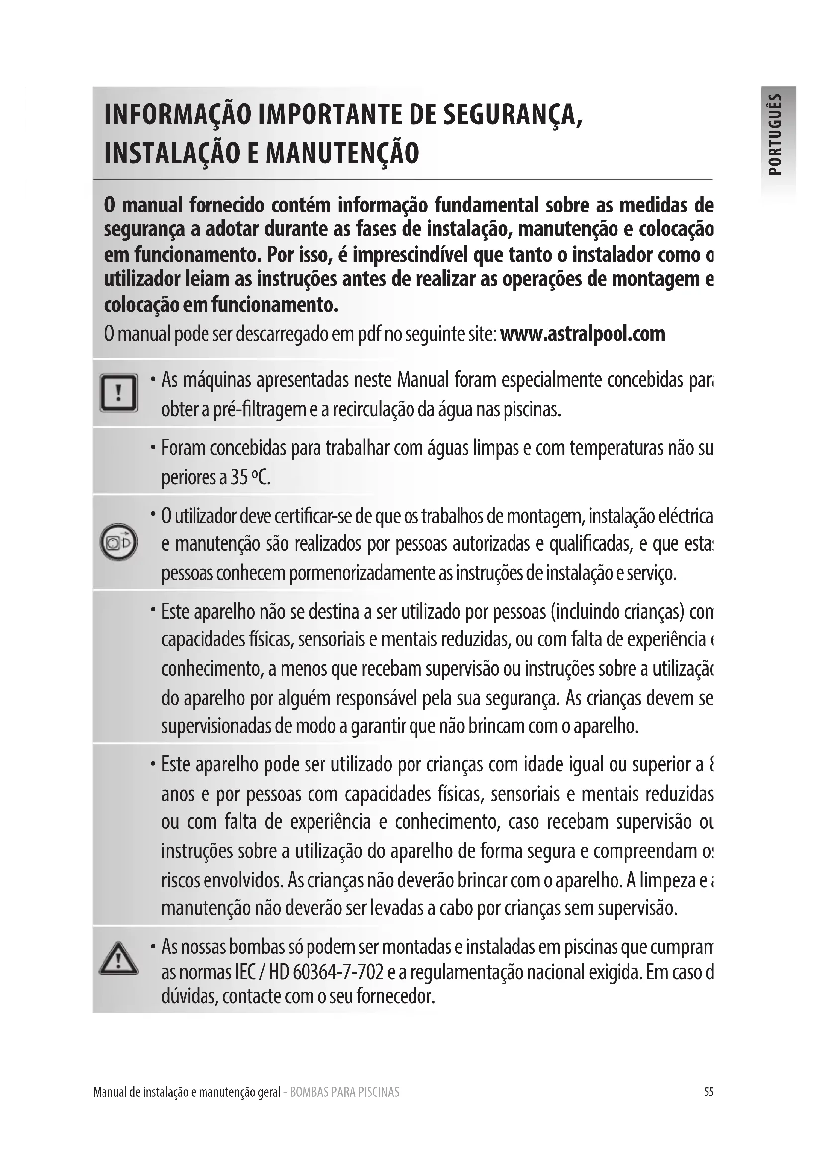 O manual fornecido contém informação fundamental sobre as medidas de segurança a adotar durante as fases de instalação, manutenção e colocação em funcionamento. Por isso, é imprescindível que tanto o instalador como o utilizador leiam as instruções antes de realizar as operações de montagem e colocação em funcionamento. O manual pode ser descarregado em pdf no seguinte site: www.astralpool.com