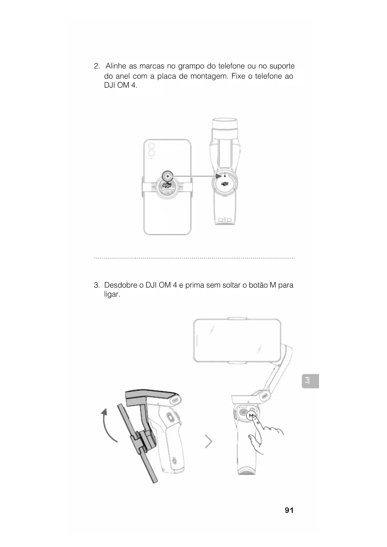Grampo Magnético do Telefone e o Suporte do Anel Magnético fornecidos podem ser usados para montar um telefone ao DJI OM 4. Usando o Suporte do Anel Magnético : xe o suporte do anel no centro do telefone. Leia cuidadosamente o Guia Guia do Utilizador do Suporte do Anel Magnético DJI OM para se certicar de que está a usar o suporte do anel de forma adequada. OU91