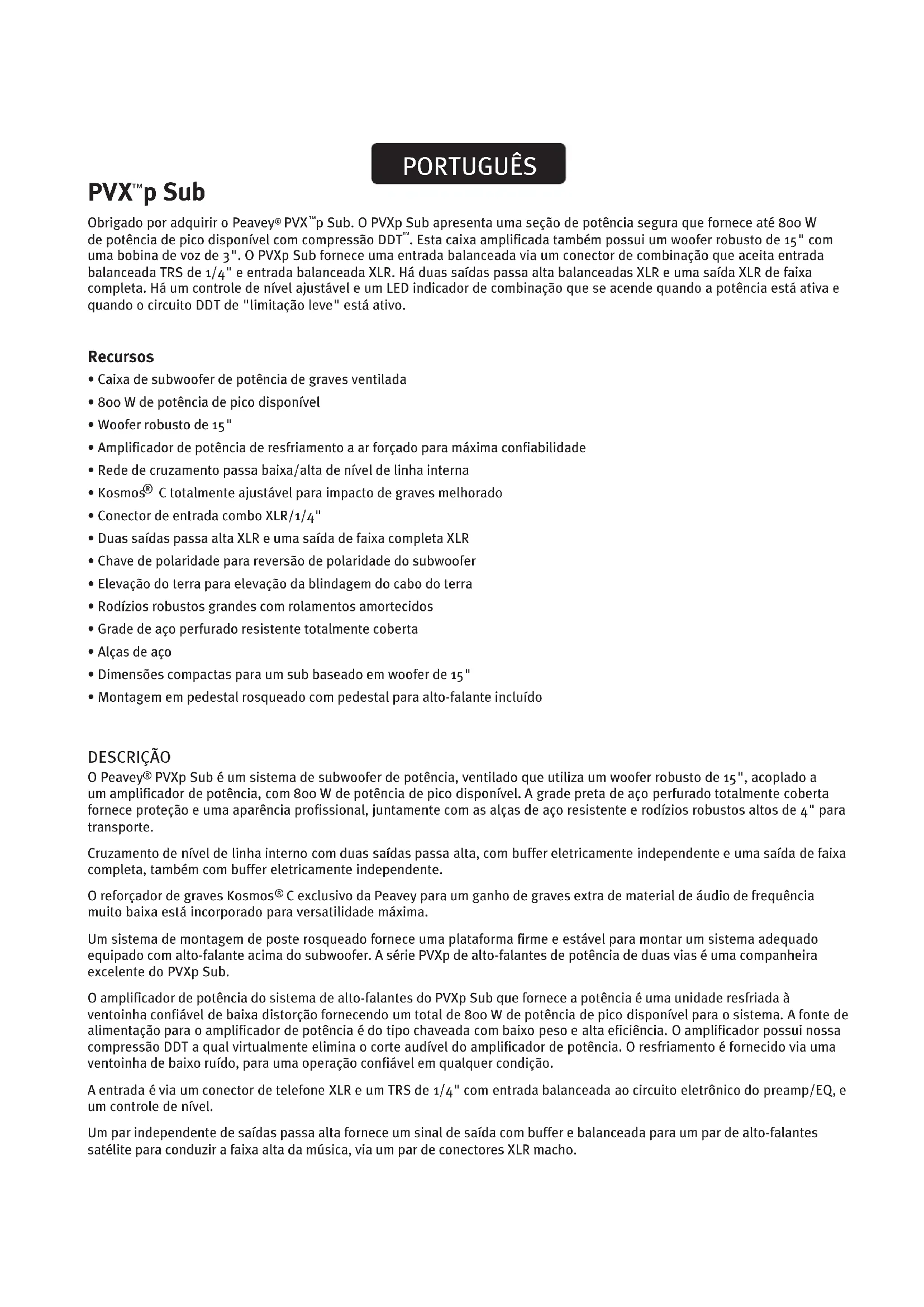 p SUB O PVXp Sub tem uma montagem em pedestal rosqueada integrada no topo da unidade e ela se destina a encaixar em um pedestal rosqueado M20 de aproximadamente 80 cm de comprimento ou menor. Este pedestal é especificamente projetado para ser utilizado com os seguintes sistemas de alto-falante: Peavey PVXp 10 Peavey PVXp 12 Peavey PVXp 15 Não coloque um sistema de alto-falantes mais alto, maior ou mais pesado do que o PVXp15 neste pedestal, ou pode ser inseguro devido ao potencial de tombar. O PVXp Sub deve ser colocado em uma superfície firme e nivelada para que o alto-falante montado no pedestal fique protegido contra tombos. Ao instalar ou desinstalar o alto-falante no pedestal, é uma boa prática ter ajuda, se possível. Pode ser difícil encaixar o copo do pedestal no pedestal do subwoofer enquanto segura o sistema de alto-falantes na extensão do braço. Ao utilizar o PVXp Sub em pedestais externos, nunca amarre faixas ou bandeiras ao pedestal ou o sistema de alto-falante montado no pedestal, pois ventos fortes podem fazer com que o alto-falante caia. Se houver possibilidade de condições de vento forte, pode ser prudente considerar remover o alto-falante do pedestal para evitar que o PVXp Sub e o sistema montado no pedestal caiam. CONEXÃO DA ENERGIA AC AO PVXp SUB O PVXp Sub vem com uma conexão IEC de cabo de energia de 1,8 m AC. Se estiver usando um cabo de extensão ou um filtro de linha com esse alto-falante de potência, certifique-se de que seja de boa qualidade e de capacidade de corrente suficiente para manter a segurança e maximizar a capacidade de saída de potência do PVXp Sub. Para saída máxima sem distorção, não conecte nenhum outro dispositivo no mesmo cabo de extensão onde o PVXpSub esteja conectado. Não exceda a capacidade de corrente nominal do cabo de extensão com a soma total de todas as unidades conectadas a ele. Ao conectar o cabo PVXp Sub AC pela primeira vez, certifique-se de que a chave de energia esteja na posição Off e então, coloque-a na posição On somente quando o cabo de energia estiver conectado. Um silenciamento interno será aplicado quando a sequência correta de passos for realizada. OBSERVAÇÃO ESPECIAL PARA INSTALAÇÃO PERMANENTE Ao instalar o PVXp Sub, AC uma energia AC será usada e um eletricista certificado deve ser consultado para assegurar que todas as conexões AC estejam conformes com os códigos e regulações locais. Aconselha-se também a usar um clipe de cabo adequadamente fixado ao gabinete para aliviar a tensão do cabo de energia IEC conectado ao módulo amplificador (2) para que este não se solte ou fique frouxo com a vibração. CONEXÃO DE UM SINAL AO PVXp SUB Há diversas formas de colocar um sinal no PVXp Sub. O conector de entrada (4) fornece uma entrada de nível de linha balanceada, permitindo o uso de um plugue de telefone TRS de 1/4" balanceado ou m plugue XLR macho. É claro, um plugue de telefone de 1/4" desbalanceado pode ser utilizado, mas ele não terá o benefício da rejeição de conexões balanceadas de interferência externa, como um zumbido e RFI. Não conecte cabos aos conectores enquanto a unidade estiver LIGADA e o nível no máximo! Enquanto um cabo equipado com um plugue de telefone de 1/4" de terminação única padrão funcionará bem e o circuito de entrada balanceada fornecerá alguma rejeição à interferência, um cabo balanceado usando o conector de telefone TRS de 1/4" balanceado ou o conector XLR fornecerá rejeição à interferência e desempenho superiores.Algumas vezes, com problemas difíceis de interferência, é útil elevar o terra da carcaça (Pino 1 de um XLR) em um cabo balanceado na terminação do PVX