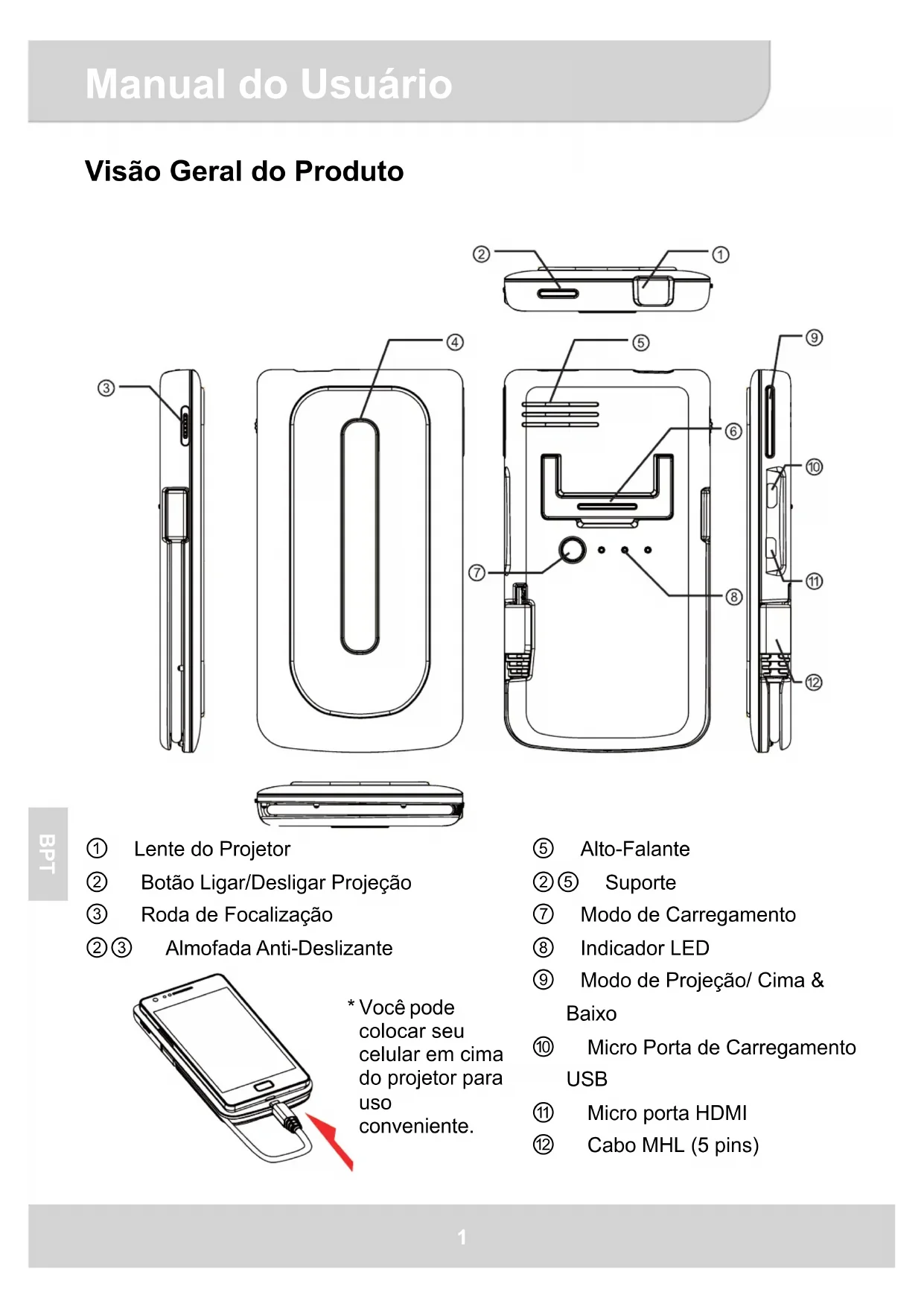 BPT Visão Geral do Produto ུ Alto-Falante ཱུ Suporte ྲྀ Modo de Carregamento ཷ Indicador LED ླྀ Modo de Projeção/ Cima & Baixo ཹ Micro Porta de Carregamento USB ེ Micro porta HDMI ཻ Cabo MHL (5 pins) Lente do Projetor ཱ Botão Ligar/Desligar Projeção ི Roda de Focalização ཱི Almofada Anti-Deslizante