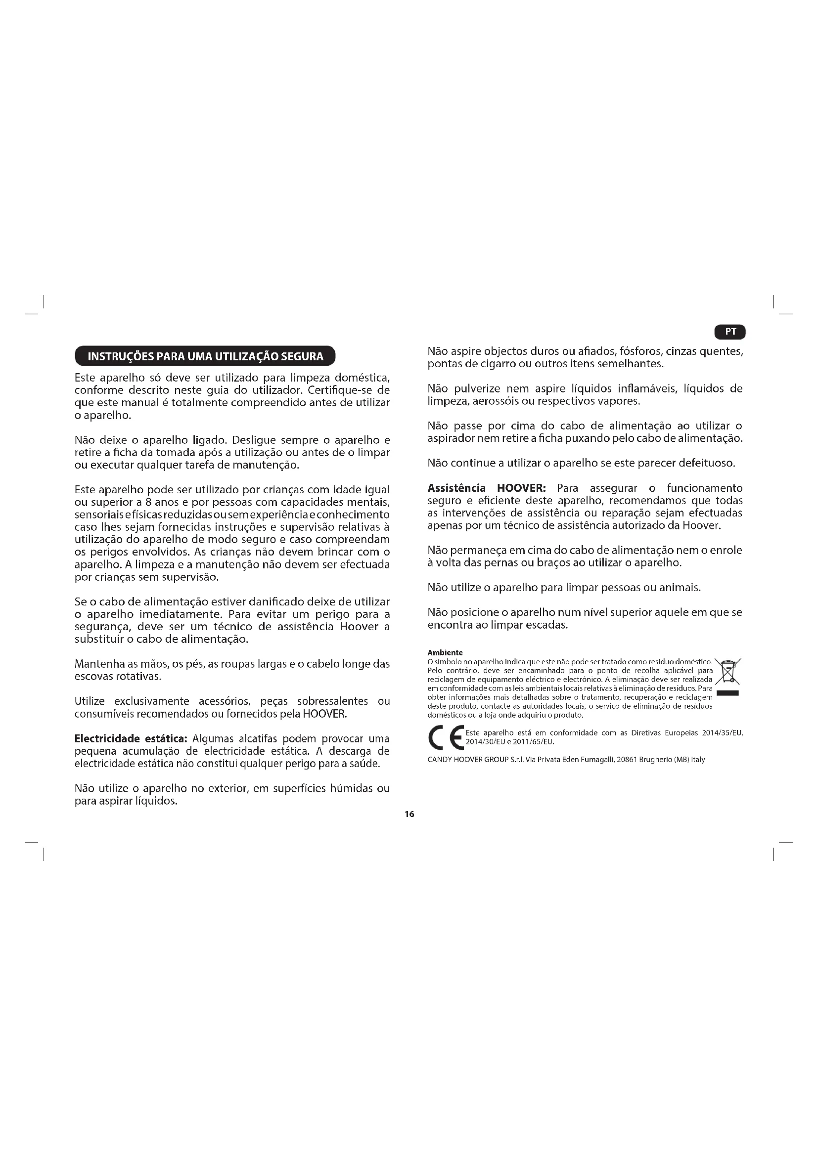 INSTRUÇÕES PARA UMA UTILIZAÇÃO SEGURA Este aparelho só deve ser utilizado para limpeza doméstica, conforme descrito neste guia do utilizador. Certique-se de que este manual é totalmente compreendido antes de utilizar o aparelho. Não deixe o aparelho ligado. Desligue sempre o aparelho e retire a cha da tomada após a utilização ou antes de o limpar ou executar qualquer tarefa de manutenção. Este aparelho pode ser utilizado por crianças com idade igual ou superior a 8 anos e por pessoas com capacidades mentais, sensoriais e físicas reduzidas ou sem experiência e conhecimento caso lhes sejam fornecidas instruções e supervisão relativas à utilização do aparelho de modo seguro e caso compreendam os perigos envolvidos. As crianças não devem brincar com o aparelho. A limpeza e a manutenção não devem ser efectuada por crianças sem supervisão. Se o cabo de alimentação estiver danicado deixe de utilizar o aparelho imediatamente. Para evitar um perigo para a segurança, deve ser um técnico de assistência Hoover a substituir o cabo de alimentação. Mantenha as mãos, os pés, as roupas largas e o cabelo longe das escovas rotativas. Utilize exclusivamente acessórios, peças sobressalentes ou consumíveis recomendados ou fornecidos pela HOOVER. Electricidade estática: Algumas alcatifas podem provocar uma pequena acumulação de electricidade estática. A descarga de electricidade estática não constitui qualquer perigo para a saúde. Não utilize o aparelho no exterior, em superfícies húmidas ou para aspirar líquidos. Não aspire objectos duros ou aados, fósforos, cinzas quentes, pontas de cigarro ou outros itens semelhantes. Não pulverize nem aspire líquidos inamáveis, líquidos de limpeza, aerossóis ou respectivos vapores. Não passe por cima do cabo de alimentação ao utilizar o aspirador nem retire a cha puxando pelo cabo de alimentação. Não continue a utilizar o aparelho se este parecer defeituoso. Assistência HOOVER: Para assegurar o funcionamento seguro e eciente deste aparelho, recomendamos que todas as intervenções de assistência ou reparação sejam efectuadas apenas por um técnico de assistência autorizado da Hoover. Não permaneça em cima do cabo de alimentação nem o enrole à volta das pernas ou braços ao utilizar o aparelho. Não utilize o aparelho para limpar pessoas ou animais. Não posicione o aparelho num nível superior aquele em que se encontra ao limpar escadas. Ambiente O símbolo no aparelho indica que este não pode ser tratado como resíduo doméstico. Pelo contrário, deve ser encaminhado para o ponto de recolha aplicável para reciclagem de equipamento eléctrico e electrónico. A eliminação deve ser realizada em conformidade com as leis ambientais locais relativas à eliminação de resíduos. Para obter informações mais detalhadas sobre o tratamento, recuperação e reciclagem deste produto, contacte as autoridades locais, o serviço de eliminação de resíduos domésticos ou a loja onde adquiriu o produto. Este aparelho está em conformidade com as Diretivas Europeias 2014/35/EU, 2014/30/EU e 2011/65/EU. CANDY HOOVER GROUP S.r.l. Via Privata Eden Fumagalli, 20861 Brugherio (MB) Italy17