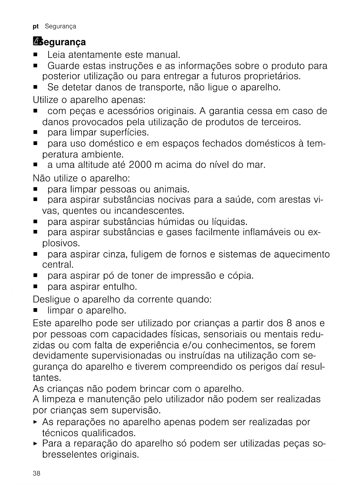 www.bosch-home.com en las secciones referentes al producto y servicio al cliente, en el área de manuales y documentos. 37pt Segurança Segurança Segurança ¡ Leia atentamente este manual. ¡ Guarde estas instruções e as informações sobre o produto para posterior utilização ou para entregar a futuros proprietários. ¡ Se detetar danos de transporte, não ligue o aparelho. Utilize o aparelho apenas: ¡ com peças e acessórios originais. A garantia cessa em caso de danos provocados pela utilização de produtos de terceiros. ¡ para limpar superfícies. ¡ para uso doméstico e em espaços fechados domésticos à tem- peratura ambiente. ¡ a uma altitude até 2000m acima do nível do mar. Não utilize o aparelho: ¡ para limpar pessoas ou animais. ¡ para aspirar substâncias nocivas para a saúde, com arestas vi- vas, quentes ou incandescentes. ¡ para aspirar substâncias húmidas ou líquidas. ¡ para aspirar substâncias e gases facilmente inflamáveis ou ex- plosivos. ¡ para aspirar cinza, fuligem de fornos e sistemas de aquecimento central. ¡ para aspirar pó de toner de impressão e cópia. ¡ para aspirar entulho. Desligue o aparelho da corrente quando: ¡ limpar o aparelho. Este aparelho pode ser utilizado por crianças a partir dos 8 anos e por pessoas com capacidades físicas, sensoriais ou mentais redu- zidas ou com falta de experiência e/ou conhecimentos, se forem devidamente supervisionadas ou instruídas na utilização com se- gurança do aparelho e tiverem compreendido os perigos daí resul- tantes. As crianças não podem brincar com o aparelho. A limpeza e manutenção pelo utilizador não podem ser realizadas por crianças sem supervisão. As reparações no aparelho apenas podem ser realizadas por técnicos qualificados. Para a reparação do aparelho só podem ser utilizadas peças so- bresselentes originais. 38Segurança pt Se o cabo de alimentação deste aparelho sofrer algum dano, deverá ser substituído pelo fabricante ou pela sua Assistência Técnica, ou por um técnico devidamente qualificado para o efei- to, para se evitarem situações de perigo. Nunca operar um aparelho danificado. Nunca operar um aparelho com a superfície fissurada ou que- brada. Para desligar o aparelho da fonte de alimentação nunca puxar pelo cabo elétrico. Remover o cabo elétrico sempre pela ficha. Nunca puxar ou mover o aparelho pelo cabo elétrico. Se o aparelho ou o cabo elétrico estiver avariado, puxe o cabo ou a ficha da tomada ou desligue o fusível no quadro elétrico. Contactar a Assistência Técnica.