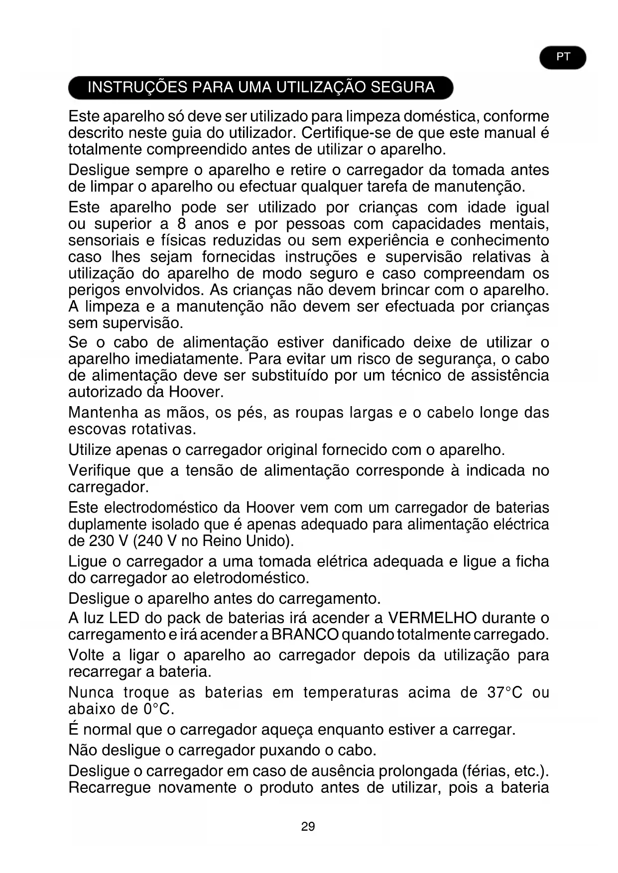 Questo prodotto è garantito, oltre che ai sensi di legge, alle condizioni e nei termini riportati sul certicato di garanzia convenzionale inserito nel prodotto. Il certicato dovrà essere conservato e mostrato al nostro Centro di Assistenza Tecnica Autorizzato, in caso di necessità, insieme allo scontrino comprovante l’acquisto dell’elettrodomestico. Puoi consultare le condizioni di garanzia anche sul nostro sito internet Per ottenere assistenza compila l’apposito form on-line oppure contattaci al numero che trovi indicato nella pagina di assistenza del nostro sito internet Queste condizioni potrebbero venire modicate senza obbligo di preavviso. IT29 INSTRUÇÕES PARA UMA UTILIZAÇÃO SEGURA Este aparelho só deve ser utilizado para limpeza doméstica, conforme descrito neste guia do utilizador. Certifique-se de que este manual é totalmente compreendido antes de utilizar o aparelho. Desligue sempre o aparelho e retire o carregador da tomada antes de limpar o aparelho ou efectuar qualquer tarefa de manutenção. Este aparelho pode ser utilizado por crianças com idade igual ou superior a 8 anos e por pessoas com capacidades mentais, sensoriais e físicas reduzidas ou sem experiência e conhecimento caso lhes sejam fornecidas instruções e supervisão relativas à utilização do aparelho de modo seguro e caso compreendam os perigos envolvidos. As crianças não devem brincar com o aparelho. A limpeza e a manutenção não devem ser efectuada por crianças sem supervisão. Se o cabo de alimentação estiver danificado deixe de utilizar o aparelho imediatamente. Para evitar um risco de segurança, o cabo de alimentação deve ser substituído por um técnico de assistência autorizado da Hoover. Mantenha as mãos, os pés, as roupas largas e o cabelo longe das escovas rotativas. Utilize apenas o carregador original fornecido com o aparelho. Verifique que a tensão de alimentação corresponde à indicada no carregador. Este electrodoméstico da Hoover vem com um carregador de baterias duplamente isolado que é apenas adequado para alimentação eléctrica de 230 V (240 V no Reino Unido). Ligue o carregador a uma tomada elétrica adequada e ligue a ficha do carregador ao eletrodoméstico. Desligue o aparelho antes do carregamento. A luz LED do pack de baterias irá acender a VERMELHO durante o carregamento e irá acender a BRANCO quando totalmente carregado. Volte a ligar o aparelho ao carregador depois da utilização para recarregar a bateria. Nunca troque as baterias em temperaturas acima de 37°C ou abaixo de 0°C. É normal que o carregador aqueça enquanto estiver a carregar. Não desligue o carregador puxando o cabo. Desligue o carregador em caso de ausência prolongada (férias, etc.). Recarregue novamente o produto antes de utilizar, pois a bateria PT30 pode descarregar durante longos períodos de armazenamento. Se for necessário eliminar o aparelho, primeiro retire as baterias. O aparelho deve ser desligado da fonte de alimentação ao remover a bateria. Elimine as baterias em segurança. Deixe o aparelho em funcionamento até parar devido ao facto de as baterias estarem completamente descarregadas. As pilhas usadas devem ser levadas para uma estação de reciclagem e não devem ser colocadas no lixo doméstico. Para remover as baterias, contacte o centro de apoio ao cliente da Hoover ou prossiga de acordo com as instruções seguintes. IMPORTANTE: Descarregue, sempre, na totalidade as baterias antes da as remover. Coloque o aspirador em funcionamento até a bateria estar totalmente descarregada. Remova a ficha de tomada do carregador do aparelho. Prima os botões de libertação do pack de baterias e deslize para remover. Nota: Caso experiencie qualquer dificuldade na desmontagem da unidade ou necessite de informações mais detalhadas sobre o trabalho, recuperação e reciclagem deste aparelho, contacte o departamento da sua cidade ou o serviço de eliminação de lixo doméstico. Utilize apenas acessórios, consumíveis ou peças sobressalentes recomendadas ou fornecidas pela Hoover. Electricidade estática: Algumas alcatifas podem provocar uma pequena acumulação de electricidade estática. A descarga de electricidade estática não constitui qualquer perigo para a saúde. Não utilize o aparelho no exterior, em superfícies húmidas ou para aspirar líquidos. Não aspire objectos duros ou afiados, fósforos, cinzas quentes, pontas de cigarro ou outros itens semelhantes. Não pulverize nem aspire líquidos inflamáveis, líquidos de limpeza, aerossóis ou respectivos vapores. Não passe por cima do cabo de alimentação ao utilizar o aspirador nem retire a ficha puxando pelo cabo de alimentação. Não continue a utilizar o aparelho ou o carregador caso aparente estar defeituoso. Assistência da Hoover: Para assegurar o funcionamento seguro e eficiente deste aparelho, recomendamos que todas as intervenções de assistência ou reparação sejam efectuadas apenas por um técnico de assistência autorizado da Hoover. Não utilize o aparelho para limpar pessoas ou animais.