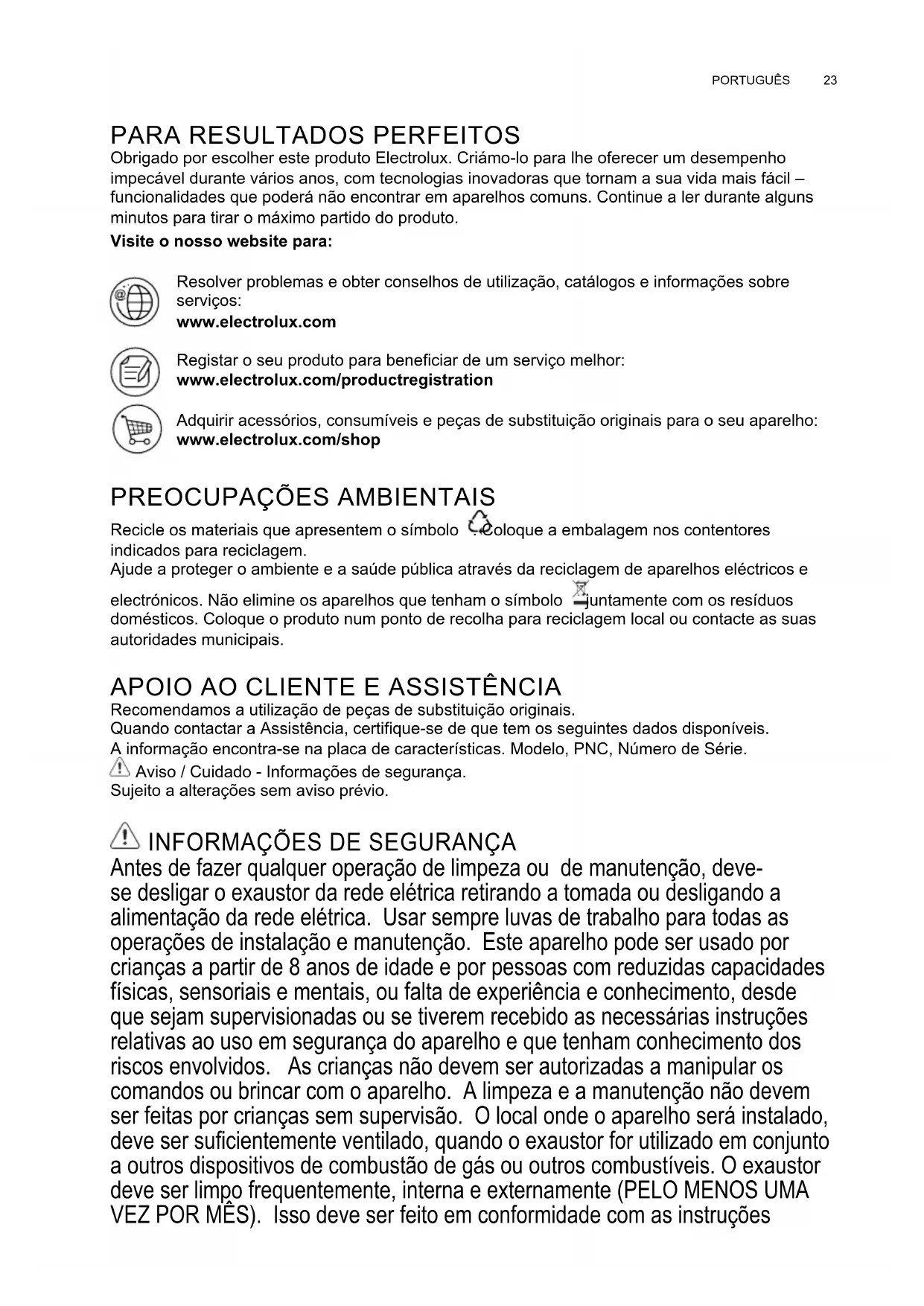 Antes de fazer qualquer operação de limpeza ou de manutenção, deve- se desligar o exaustor da rede elétrica retirando a tomada ou desligando a alimentação da rede elétrica. Usar sempre luvas de trabalho para todas as operações de instalação e manutenção. Este aparelho pode ser usado por crianças a partir de 8 anos de idade e por pessoas com reduzidas capacidades físicas, sensoriais e mentais, ou falta de experiência e conhecimento, desde que sejam supervisionadas ou se tiverem recebido as necessárias instruções relativas ao uso em segurança do aparelho e que tenham conhecimento dos riscos envolvidos. As crianças não devem ser autorizadas a manipular os comandos ou brincar com o aparelho. A limpeza e a manutenção não devem ser feitas por crianças sem supervisão. O local onde o aparelho será instalado, deve ser sucientemente ventilado, quando o exaustor for utilizado em conjunto a outros dispositivos de combustão de gás ou outros combustíveis. O exaustor deve ser limpo frequentemente, interna e externamente (PELO MENOS UMA VEZ POR MÊS). Isso deve ser feito em conformidade com as instruções PT LIVRO DE INSTRUÇÕES PARA UTILIZAÇÃOwww.electrolux.com24 de manutenção indicadas neste manual. O não cumprimento das instruções fornecidas neste guia do utilizador, no referente à limpeza do exaustor e substituição e limpeza dos ltros, causa riscos de incêndio. É severamente proibido colocar alimentos diretamente na chama, sob o exaustor. O uso de chama livre causa danos aos ltros e pode originar incêndios, portanto, deve ser evitado em quaisquer circunstâncias. Os alimentos fritos devem ser feitos sob controle, para evitar que o óleo sobreaqueça e se incendeie. CUIDADO: Peças acessíveis do exaustor podem queimar quando utilizado com a placa de fogão. Para a substituição da lâmpada, utilizar apenas o tipo de lâmpada indicado na secção de Manutenção/Substituição de lâmpadas deste manual. ATENÇÃO! Não ligar o aparelho à rede elétrica até que a instalação esteja totalmente concluída. Na ligação do exaustor à rede elétrica são permitidos apenas adaptadores elétricos certificados e não tomadas múltiplas.