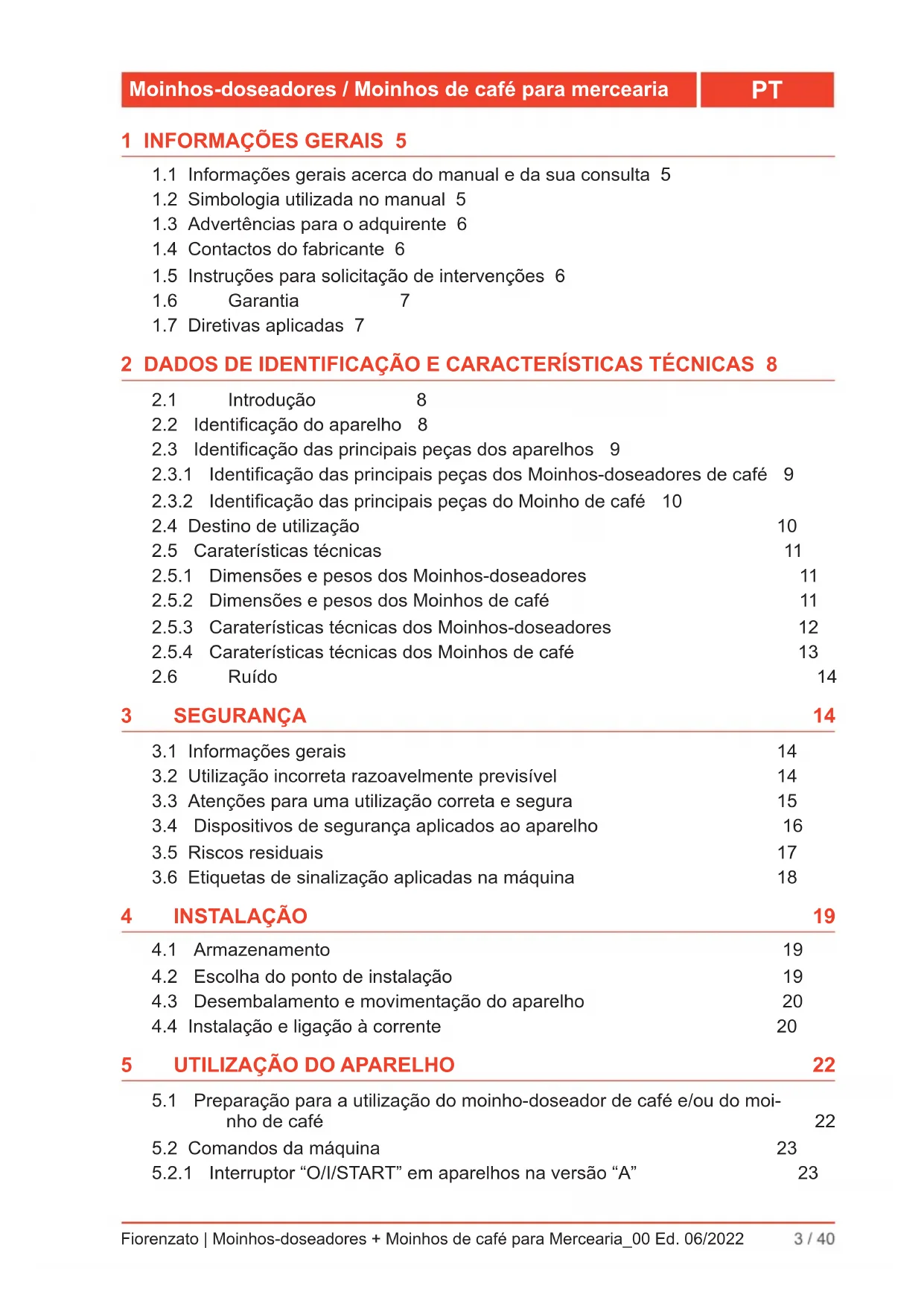 8 PEDIDO DE PEÇAS DE REPOSIÇÃO 37 9 ELIMINAÇÃO 38Fiorenzato | Moinhos-doseadores + Moinhos de café para Mercearia_00 Ed. 06/2022 5 / 40 Moinhos-doseadores / Moinhos de café para mercearia