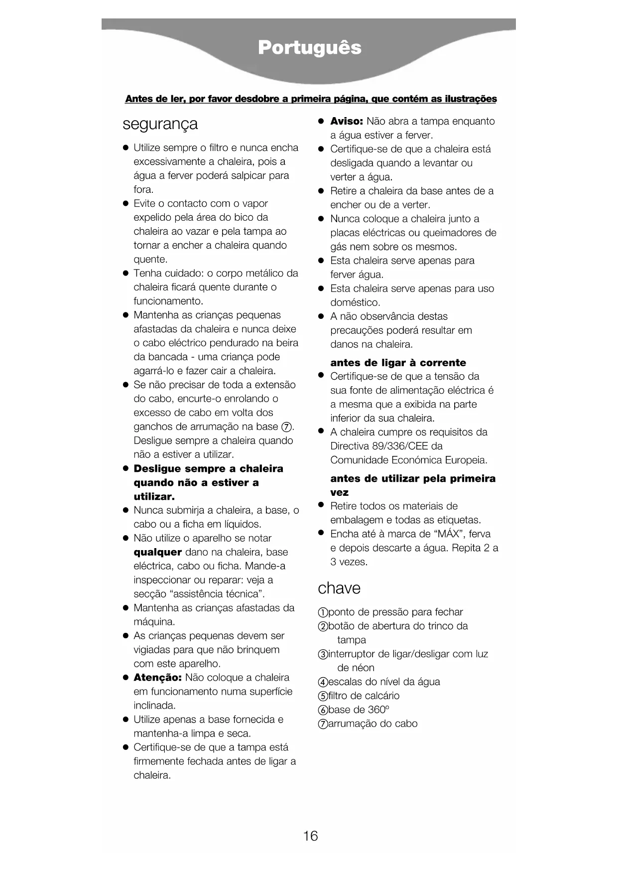 A chaleira cumpre os requisitos da Directiva 89/336/CEE da Comunidade Económica Europeia. antes de utilizar pela primeira vez