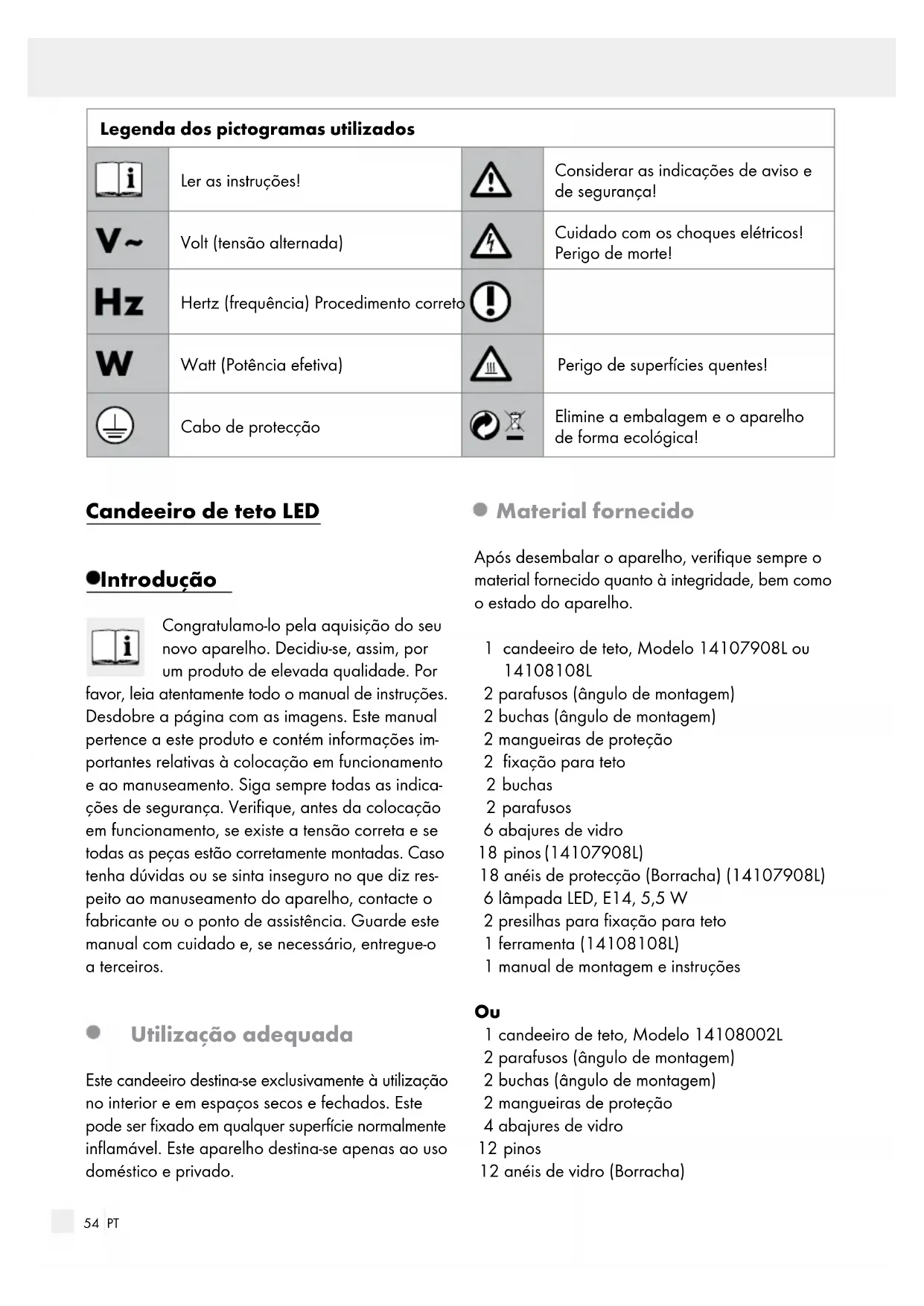 1 candeeiro de teto, Modelo 14108002L 2 parafusos (ângulo de montagem) 2 buchas (ângulo de montagem) 2 mangueiras de proteção 4 abajures de vidro 12 pinos 12 anéis de vidro (Borracha) Legenda dos pictogramas utilizados Ler as instruções! Considerar as indicações de aviso e de segurança! Volt (tensão alternada) Cuidado com os choques elétricos! Perigo de morte! Hertz (frequência) Procedimento correto Watt (Potência efetiva) Perigo de superfícies quentes! Cabo de protecção Elimine a embalagem e o aparelho de forma ecológica!55 PT Introdução / Segurança Introdução 1 bandeja de vidro 2 anéis de decoração de cromo para lâmpadas GU10 4 lâmpada LED, E14, 5,5 W 2 lâmpada LED, GU10, 5 W 2 suportes distanciadores 4 arruelas planas 2 parafusos de fixação 1 manual de montagem e instruções Descrição das peças
