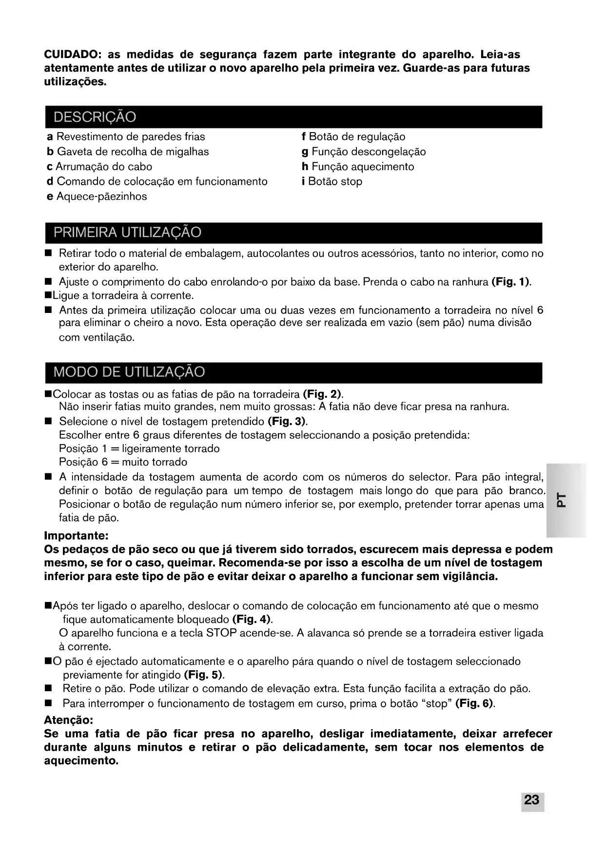 CUIDADO: as medidas de segurança fazem parte integrante do aparelho. Leia-as atentamente antes de utilizar o novo aparelho pela primeira vez. Guarde-as para futuras utilizações. n Retirar todo o material de embalagem, autocolantes ou outros acessórios, tanto no interior, como no exterior do aparelho. n Ajuste o comprimento do cabo enrolando-o por baixo da base. Prenda o cabo na ranhura (Fig. 1). n Ligue a torradeira à corrente. n Antes da primeira utilização colocar uma ou duas vezes em funcionamento a torradeira no nível 6 para eliminar o cheiro a novo. Esta operação deve ser realizada em vazio (sem pão) numa divisão com ventilação. n Colocar as tostas ou as fatias de pão na torradeira (Fig. 2). Não inserir fatias muito grandes, nem muito grossas: A fatia não deve ficar presa na ranhura. n Selecione o nível de tostagem pretendido (Fig. 3). Escolher entre 6 graus diferentes de tostagem seleccionando a posição pretendida: Posição 1 = ligeiramente torrado Posição 6 = muito torrado n A intensidade da tostagem aumenta de acordo com os números do selector. Para pão integral, definir o botão de regulação para um tempo de tostagem mais longo do que para pão branco. Posicionar o botão de regulação num número inferior se, por exemplo, pretender torrar apenas uma fatia de pão. Importante: Os pedaços de pão seco ou que já tiverem sido torrados, escurecem mais depressa e podem mesmo, se for o caso, queimar. Recomenda-se por isso a escolha de um nível de tostagem inferior para este tipo de pão e evitar deixar o aparelho a funcionar sem vigilância. n Após ter ligado o aparelho, deslocar o comando de colocação em funcionamento até que o mesmo fique automaticamente bloqueado (Fig. 4). O aparelho funciona e a tecla STOP acende-se. A alavanca só prende se a torradeira estiver ligada à corrente. n O pão é ejectado automaticamente e o aparelho pára quando o nível de tostagem seleccionado previamente for atingido (Fig. 5). n Retire o pão. Pode utilizar o comando de elevação extra. Esta função facilita a extração do pão. n Para interromper o funcionamento de tostagem em curso, prima o botão “stop” (Fig. 6). Atenção: Se uma fatia de pão ficar presa no aparelho, desligar imediatamente, deixar arrefecer durante alguns minutos e retirar o pão delicadamente, sem tocar nos elementos de aquecimento. DESCRIÇÃO a Revestimento de paredes frias b Gaveta de recolha de migalhas c Arrumação do cabo d Comando de colocação em funcionamento e Aquece-pãezinhos f Botão de regulação g Função descongelação h Função aquecimento i Botão stop