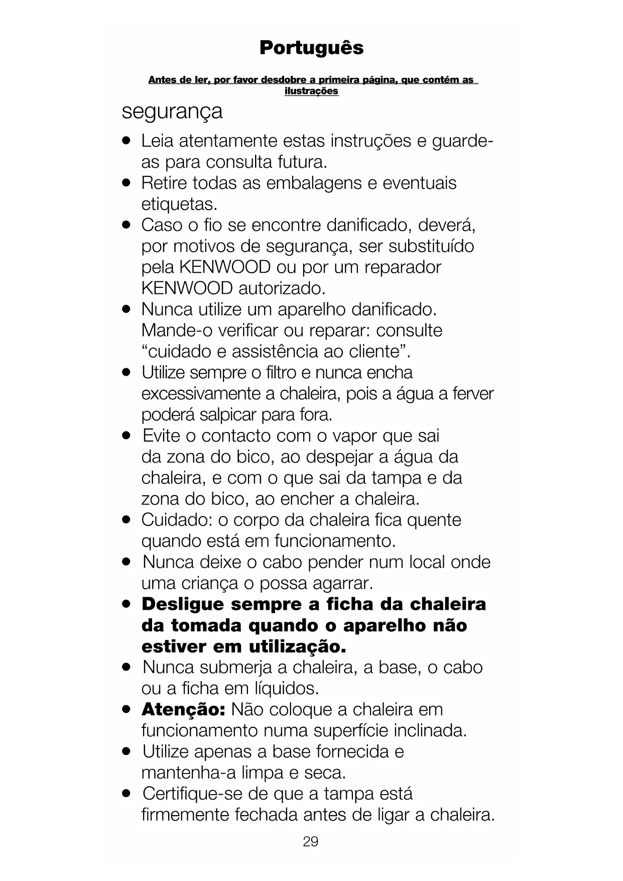Antes de ler, por favor desdobre a primeira página, que contém as ilustraçõesl Aviso: Não abra a tampa enquanto a água estiver a ferver.