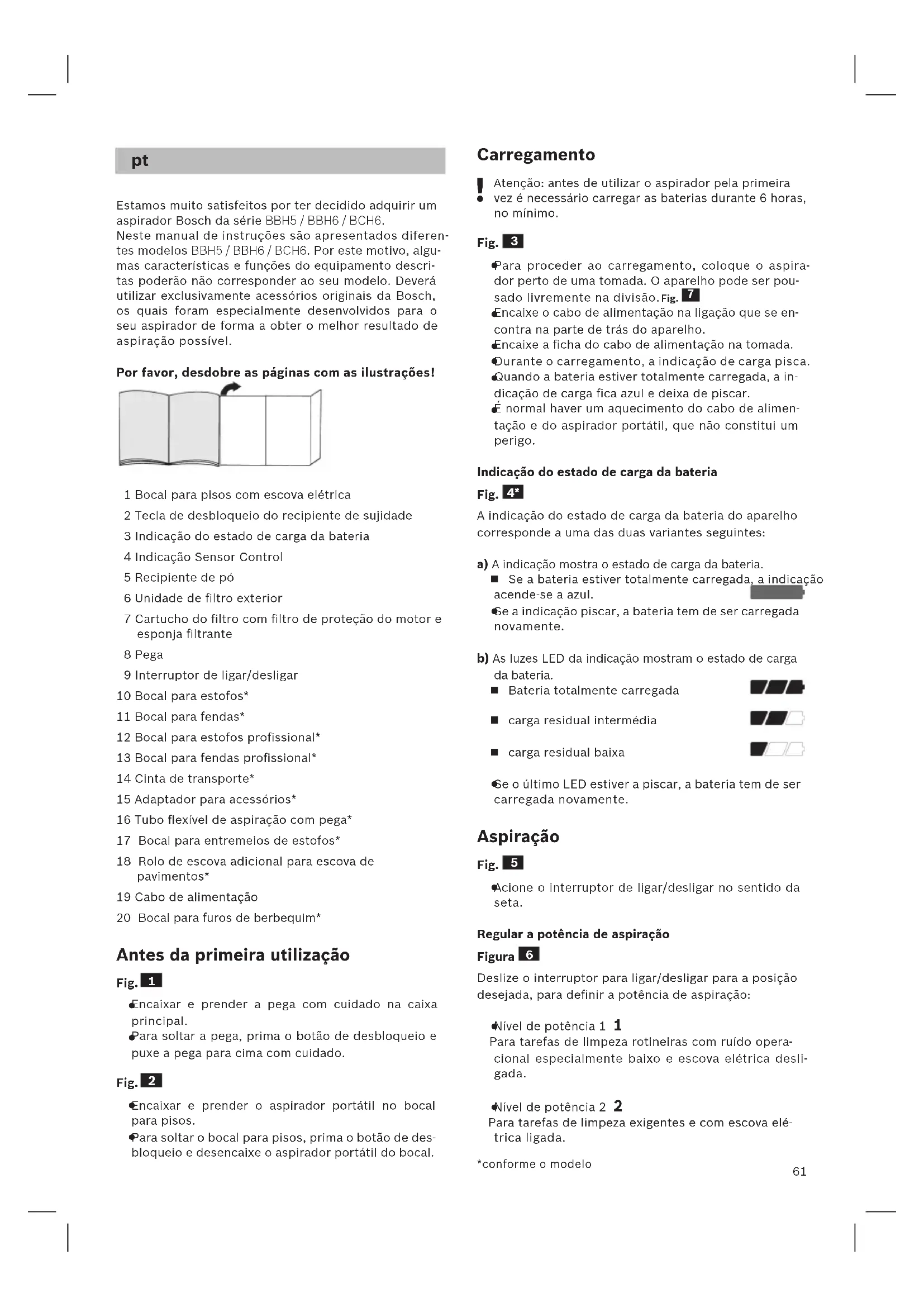 Estamos muito satisfeitos por ter decidido adquirir um aspirador Bosch da série BBH5 / BBH6 / BCH6. Neste manual de instruções são apresentados diferen- tes modelos BBH5 / BBH6 / BCH6. Por este motivo, algu- mas características e funções do equipamento descri- tas poderão não corresponder ao seu modelo. Deverá utilizar exclusivamente acessórios originais da Bosch, os quais foram especialmente desenvolvidos para o seu aspirador de forma a obter o melhor resultado de aspiração possível. Por favor, desdobre as páginas com as ilustrações! 1 Bocal para pisos com escova elétrica 2 Tecla de desbloqueio do recipiente de sujidade 3 Indicação do estado de carga da bateria 4 Indicação Sensor Control 5 Recipiente de pó 6 Unidade de filtro exterior 7 Cartucho do filtro com filtro de proteção do motor e esponja filtrante 8 Pega 9 Interruptor de ligar/desligar 10 Bocal para estofos* 11 Bocal para fendas* 12 Bocal para estofos profissional* 13 Bocal para fendas profissional* 14 Cinta de transporte* 15 Adaptador para acessórios* 16 Tubo flexível de aspiração com pega* 17 Bocal para entremeios de estofos* 18 Rolo de escova adicional para escova de pavimentos* 19 Cabo de alimentação 20 Bocal para furos de berbequim* Antes da primeira utilização Fig.