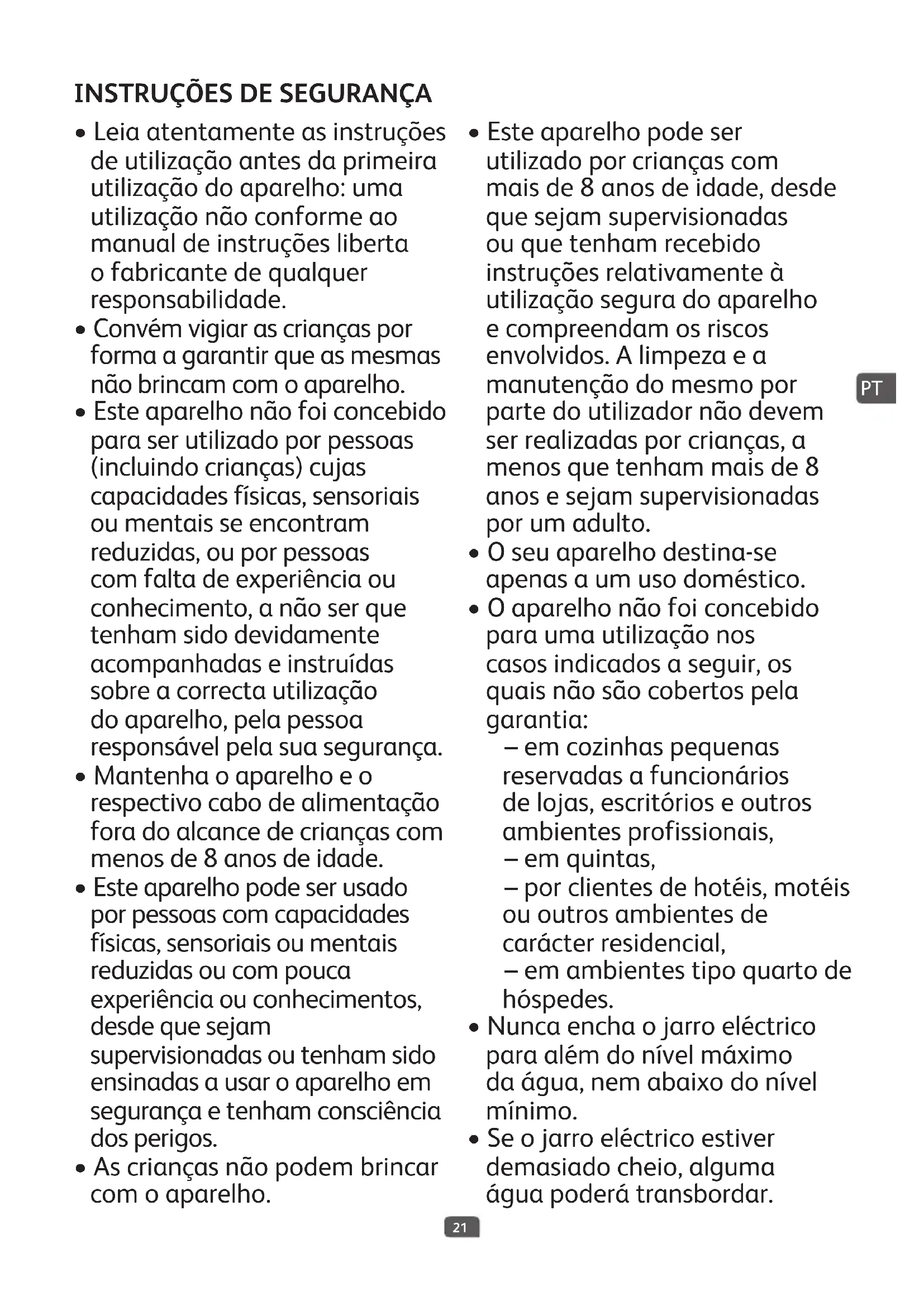 - Se o jarro eléctrico estiver demasiado cheio, alguma água poderá transbordar. PT22