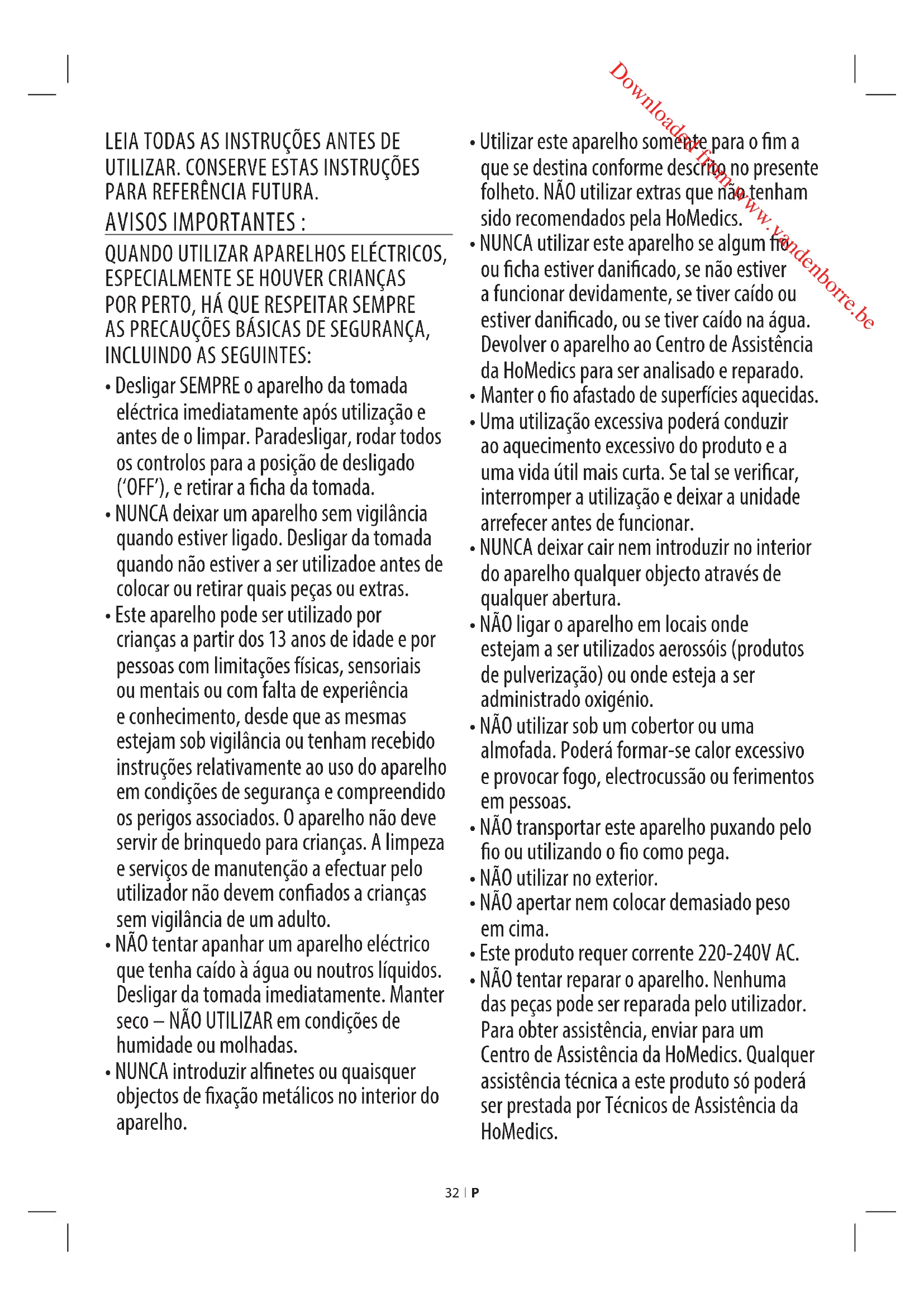 - NÃO tentar reparar o aparelho. Nenhuma das peças pode ser reparada pelo utilizador. Para obter assistência, enviar para um Centro de Assistência da HoMedics. Qualquer assistência técnica a este produto só poderá ser prestada por Técnicos de Assistência da HoMedics. Downloaded from www.vandenborre.be33 I P