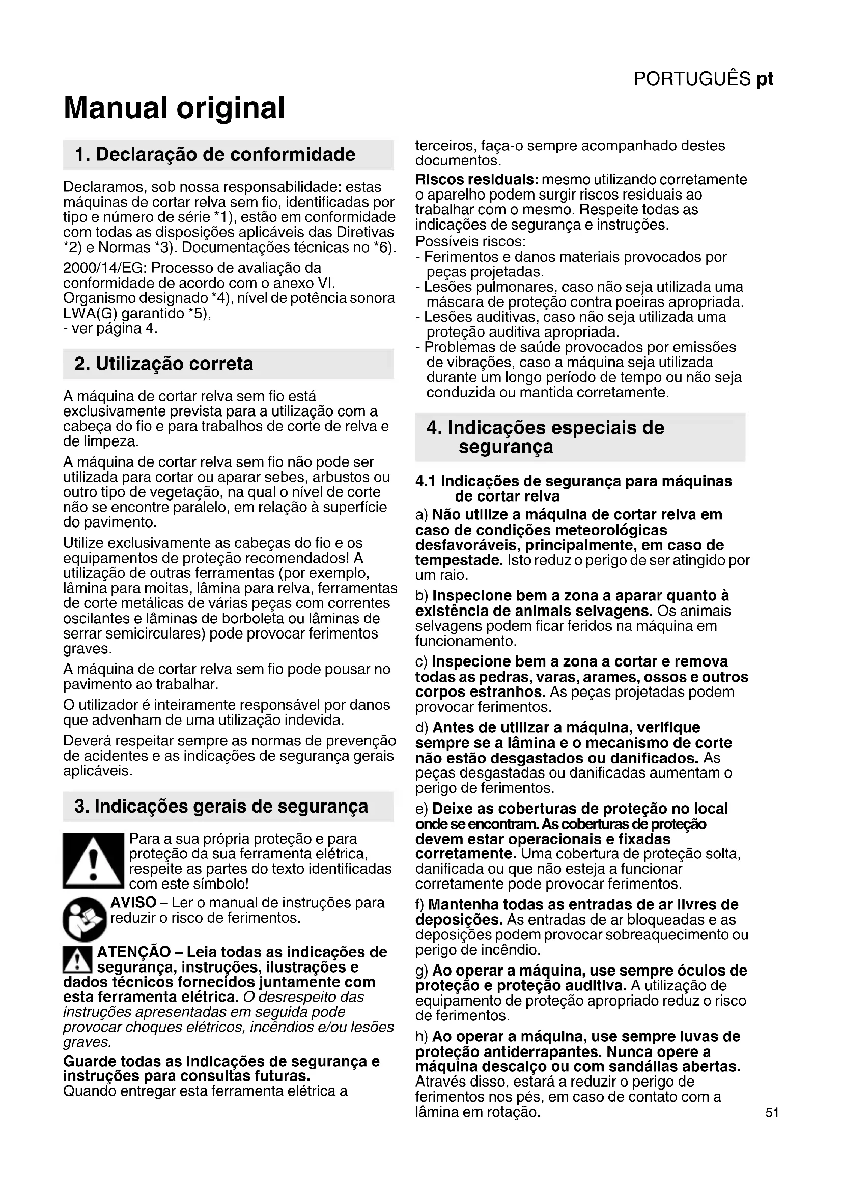 Manual original Declaramos, sob nossa responsabilidade: estas máquinas de cortar relva sem fio, identificadas por tipo e número de série *1), estão em conformidade com todas as disposições aplicáveis das Diretivas *2) e Normas *3). Documentações técnicas no *6). 2000/14/EG: Processo de avaliação da conformidade de acordo com o anexo VI. Organismo designado *4), nível de potência sonora LWA(G) garantido *5), - ver página 4. A máquina de cortar relva sem fio está exclusivamente prevista para a utilização com a cabeça do fio e para trabalhos de corte de relva e de limpeza. A máquina de cortar relva sem fio não pode ser utilizada para cortar ou aparar sebes, arbustos ou outro tipo de vegetação, na qual o nível de corte não se encontre paralelo, em relação à superfície do pavimento. Utilize exclusivamente as cabeças do fio e os equipamentos de proteção recomendados! A utilização de outras ferramentas (por exemplo, lâmina para moitas, lâmina para relva, ferramentas de corte metálicas de várias peças com correntes oscilantes e lâminas de borboleta ou lâminas de serrar semicirculares) pode provocar ferimentos graves. A máquina de cortar relva sem fio pode pousar no pavimento ao trabalhar. O utilizador é inteiramente responsável por danos que advenham de uma utilização indevida. Deverá respeitar sempre as normas de prevenção de acidentes e as indicações de segurança gerais aplicáveis. Para a sua própria proteção e para proteção da sua ferramenta elétrica, respeite as partes do texto identificadas com este símbolo! AVISO – Ler o manual de instruções para reduzir o risco de ferimentos. ATENÇÃO – Leia todas as indicações de segurança, instruções, ilustrações e dados técnicos fornecidos juntamente com esta ferramenta elétrica. O desrespeito das instruções apresentadas em seguida pode provocar choques elétricos, incêndios e/ou lesões graves. Guarde todas as indicações de segurança e instruções para consultas futuras. Quando entregar esta ferramenta elétrica a terceiros, faça-o sempre acompanhado destes documentos. Riscos residuais: mesmo utilizando corretamente o aparelho podem surgir riscos residuais ao trabalhar com o mesmo. Respeite todas as indicações de segurança e instruções. Possíveis riscos: - Ferimentos e danos materiais provocados por peças projetadas. - Lesões pulmonares, caso não seja utilizada uma máscara de proteção contra poeiras apropriada. - Lesões auditivas, caso não seja utilizada uma proteção auditiva apropriada. - Problemas de saúde provocados por emissões de vibrações, caso a máquina seja utilizada durante um longo período de tempo ou não seja conduzida ou mantida corretamente.