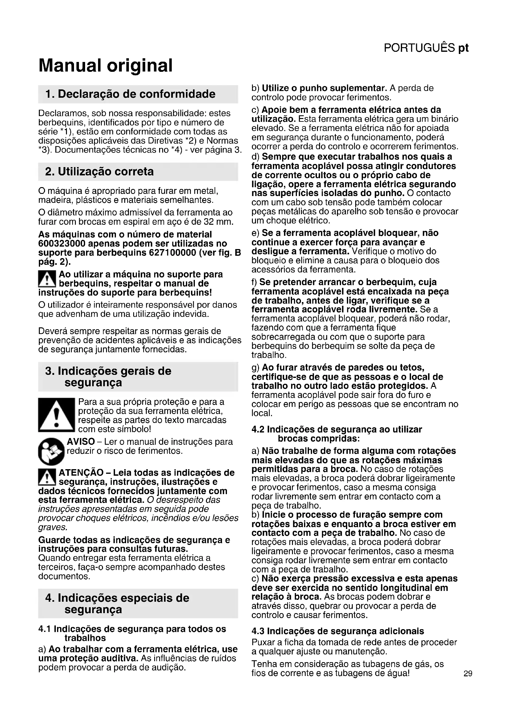 Manual original Declaramos, sob nossa responsabilidade: estes berbequins, identificados por tipo e número de série *1), estão em conformidade com todas as disposições aplicáveis das Diretivas *2) e Normas *3). Documentações técnicas no *4) - ver página 3. O máquina é apropriado para furar em metal, madeira, plásticos e materiais semelhantes. O diâmetro máximo admissível da ferramenta ao furar com brocas em espiral em aço é de 32 mm. As máquinas com o número de material 600323000 apenas podem ser utilizadas no suporte para berbequins 627100000 (ver fig. B pág. 2). Ao utilizar a máquina no suporte para berbequins, respeitar o manual de instruções do suporte para berbequins! O utilizador é inteiramente responsável por danos que advenham de uma utilização indevida. Deverá sempre respeitar as normas gerais de prevenção de acidentes aplicáveis e as indicações de segurança juntamente fornecidas. Para a sua própria proteção e para a proteção da sua ferramenta elétrica, respeite as partes do texto marcadas com este símbolo! AVISO – Ler o manual de instruções para reduzir o risco de ferimentos. ATENÇÃO – Leia todas as indicações de segurança, instruções, ilustrações e dados técnicos fornecidos juntamente com esta ferramenta elétrica. O desrespeito das instruções apresentadas em seguida pode provocar choques elétricos, incêndios e/ou lesões graves. Guarde todas as indicações de segurança e instruções para consultas futuras. Quando entregar esta ferramenta elétrica a terceiros, faça-o sempre acompanhado destes documentos.