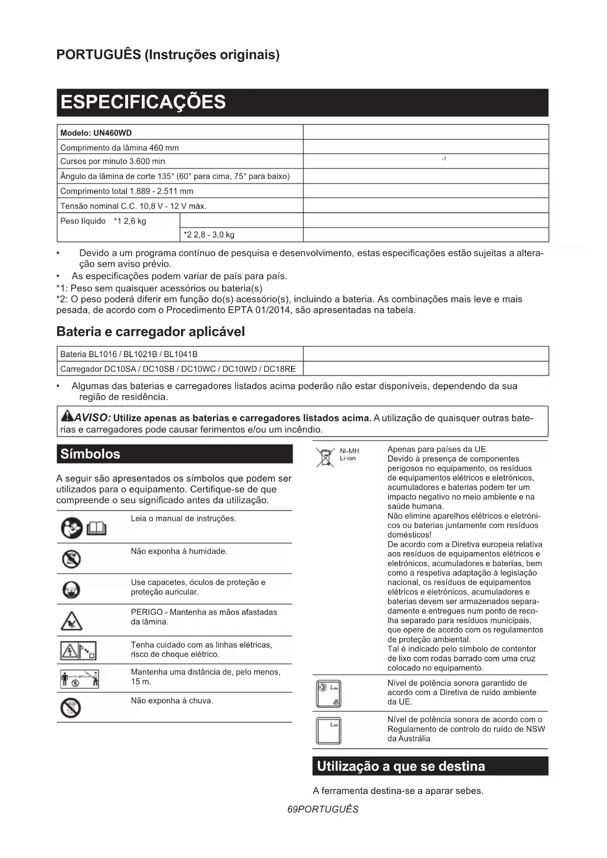 - Algumasdasbateriasecarregadoreslistadosacimapoderãonãoestardisponíveis,dependendodasua região de residência. AVISO: Utilize apenas as baterias e carregadores listados acima. A utilização de quaisquer outras bate- rias e carregadores pode causar ferimentos e/ou um incêndio. Símbolos Aseguirsãoapresentadosossímbolosquepodemser utilizadosparaoequipamento.Certique-sedeque compreendeoseusignicadoantesdautilização. Leiaomanualdeinstruções. Nãoexponhaàhumidade. Use capacetes, óculos de proteção e proteção auricular. PERIGO - Mantenha as mãos afastadas da lâmina. Tenha cuidado com as linhas elétricas, risco de choque elétrico. Mantenha uma distância de, pelo menos, 15 m. Nãoexponhaàchuva. Ni-MH Li-ion ApenasparapaísesdaUE Devidoàpresençadecomponentes perigososnoequipamento,osresíduos de equipamentos elétricos e eletrónicos, acumuladores e baterias podem ter um impacto negativo no meio ambiente e na saúde humana. Não elimine aparelhos elétricos e eletróni- cosoubateriasjuntamentecomresíduos domésticos! De acordo com a Diretiva europeia relativa aosresíduosdeequipamentoselétricose eletrónicos, acumuladores e baterias, bem comoarespetivaadaptaçãoàlegislação nacional,osresíduosdeequipamentos elétricos e eletrónicos, acumuladores e baterias devem ser armazenados separa- damente e entregues num ponto de reco- lhaseparadopararesíduosmunicipais, que opere de acordo com os regulamentos de proteção ambiental. Taléindicadopelosímbolodecontentor de lixo com rodas barrado com uma cruz colocado no equipamento. Níveldepotênciasonoragarantidode acordocomaDiretivaderuídoambiente da UE. Níveldepotênciasonoradeacordocomo RegulamentodecontrolodoruídodeNSW da Austrália Utilização a que se destina A ferramenta destina-se a aparar sebes.70 PORTUGUÊS Ruído AcaracterísticadonívelderuídoAdeterminadodeacordocomaEN62841-4-2: Nível de pressão sonora Nível garantido de potência sonoraNível medido de potência sonora