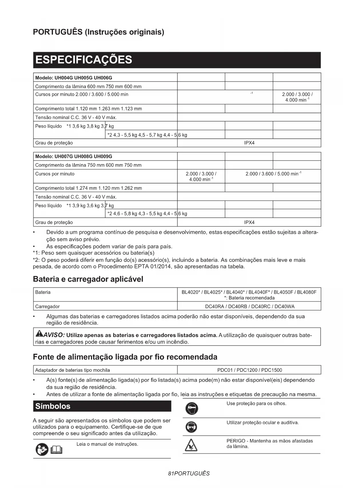 [dB(A)] K de incerteza (dB(A)) UH004G 88 3 98 96 2,2 UH005G 89 3 99 97 1,8 UH006G 84 3 94 92 2,2 UH007G 84 3 94 92 1,7 UH008G 85 3 95 93 2,1 UH009G 86 3 96 94 1,6 NOTA:O(s)valor(es)daemissãoderuídoindicado(s)foimedidodeacordocomummétododetestepadrãoe pode ser utilizado para comparar duas ferramentas. NOTA:O(s)valor(es)daemissãoderuídoindicado(s)podetambémserutilizadonaavaliaçãopreliminarda exposição. AVISO: Utilize protetores auriculares. AVISO: A emissão de ruído durante a utilização real da ferramenta elétrica pode diferir do(s) valor(es) indicado(s), dependendo das formas como a ferramenta é utilizada, especialmente o tipo de peça de tra- balho que é processada. AVISO: Certique-se de identicar as medidas de segurança para proteção do operador que sejam baseadas em uma estimativa de exposição em condições reais de utilização (considerando todas as partes do ciclo de operação, tal como quando a ferramenta está desligada e quando está a funcionar em marcha lenta além do tempo de acionamento).83 PORTUGUÊS Vibração Valortotaldavibração(somavetorialtri-axial)determinadodeacordocomaEN62841-4-2: Modelo Pega frontal Pega traseiraah (m/s ) K de incerteza (m/s