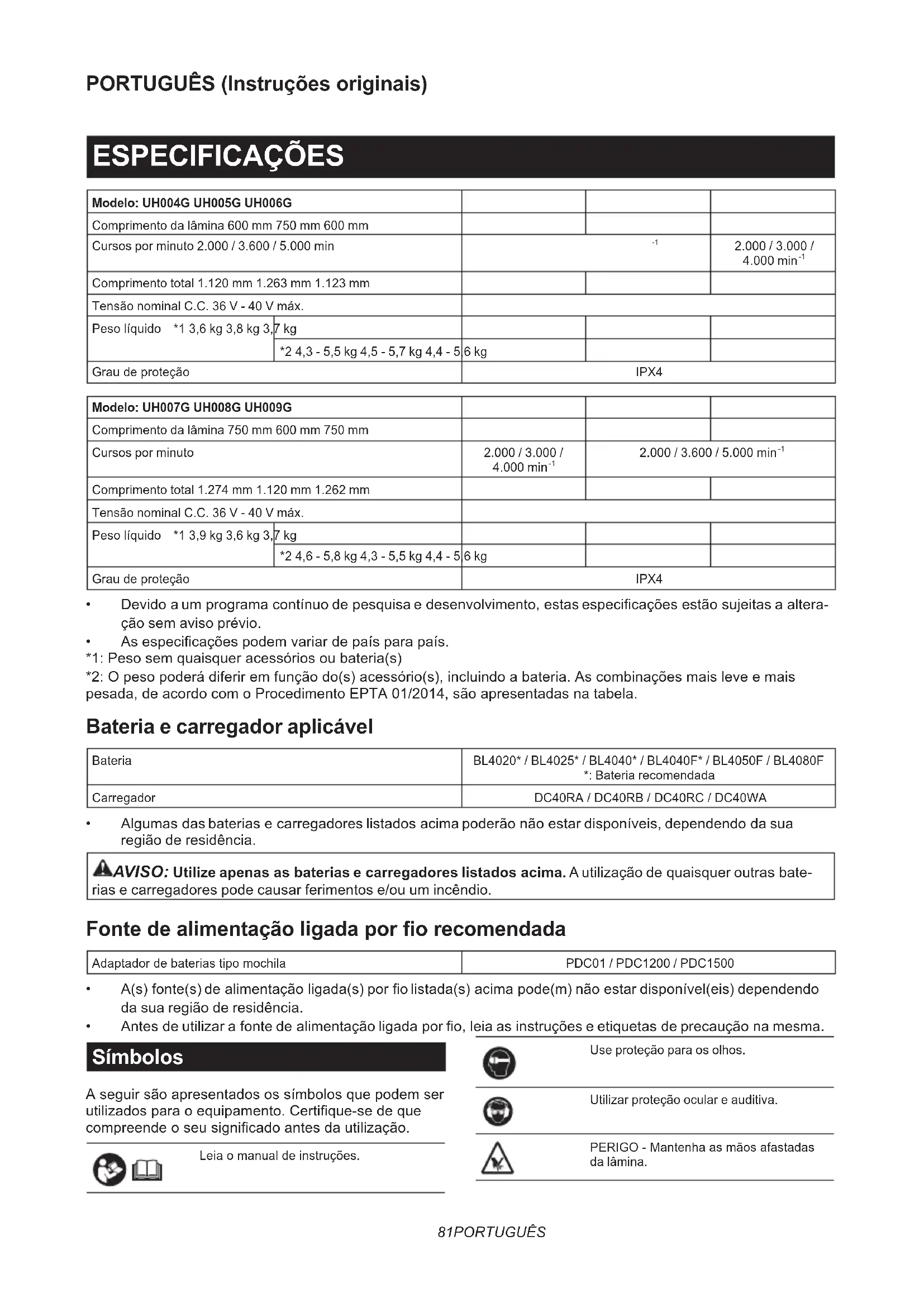 - Asespecicaçõespodemvariardepaísparapaís. *1:Pesosemquaisqueracessóriosoubateria(s) *2:Opesopoderádiferiremfunçãodo(s)acessório(s),incluindoabateria.Ascombinaçõesmaisleveemais pesada,deacordocomoProcedimentoEPTA01/2014,sãoapresentadasnatabela. Bateria e carregador aplicável Bateria BL4020* / BL4025* / BL4040* / BL4040F* / BL4050F / BL4080F *: Bateria recomendada Carregador DC40RA/DC40RB/DC40RC/DC40WA