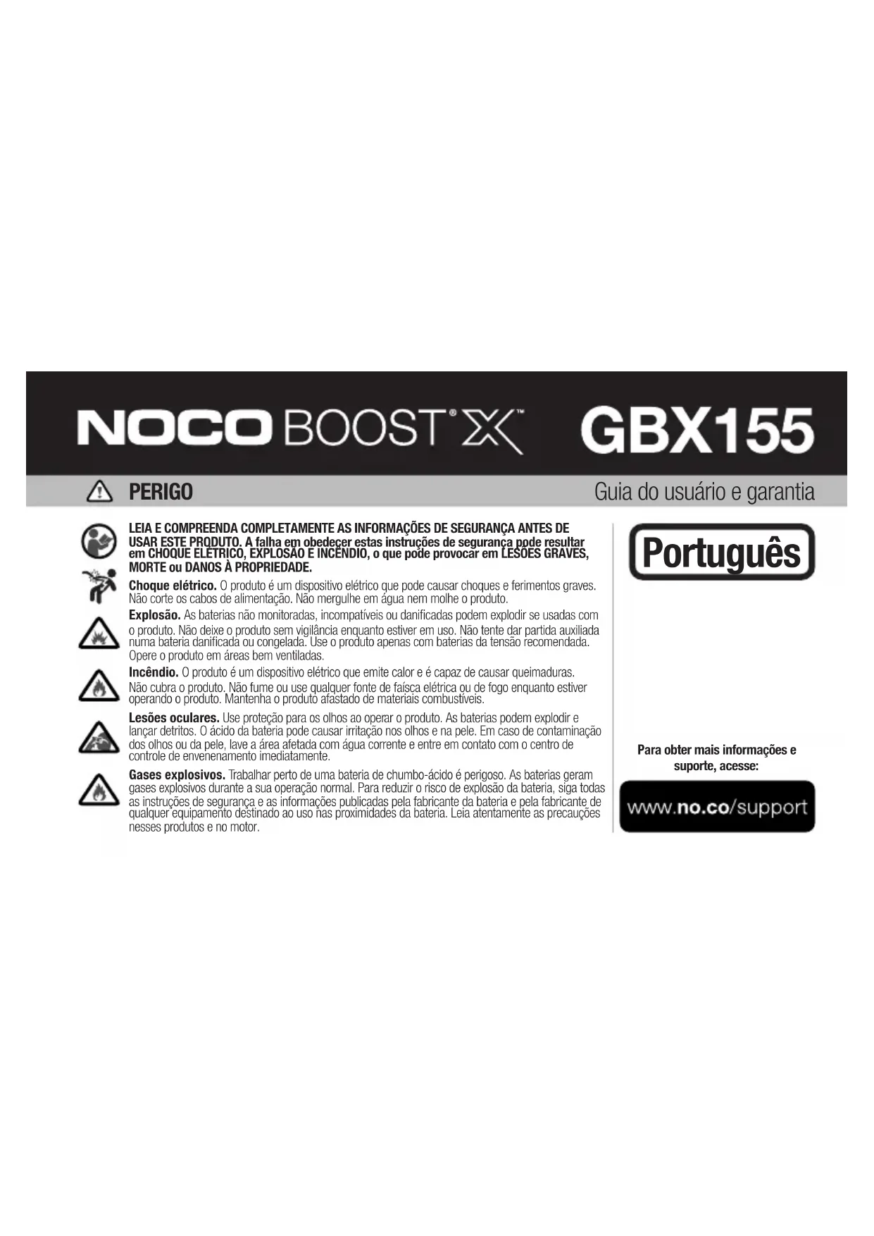 16h 10W Como usar imediatamente e consulte seu médico. Condições médicas. Se você tem alguma condição médica que acredita que pode ser afetada pelo produto, incluindo, mas não se limitando a convulsões, apagões, fadiga ocular ou dores de cabeça, consulte seu médico antes do uso do produto. O uso de uma lanterna de alta potência integrada oferece risco para pessoas com sensibilidade à luz. O uso da luz no modo estroboscópico pode causar convulsões em pessoas com epilepsia fotossensível, o que pode resultar em ferimentos graves ou mesmo em morte. Luz. Olhar diretamente para a lanterna pode resultar em lesões oculares permanentes. O produto está equipado com uma lâmpada pré-focada de LED de alto desempenho que emite um feixe poderoso na configuração mais alta. Limpeza. Desligue o produto antes de qualquer manutenção ou limpeza. Limpe e seque o produto imediatamente se entrar em contato com líquidos ou qualquer tipo de contaminante. Use um pano macio e sem fiapos (microfibra). Evite a umidade nas aberturas. Atmosferas explosivas. Obedeça todos os sinais e instruções. Não opere o produto em qualquer área com uma atmosfera potencialmente explosiva, incluindo áreas de abastecimento de combustíveis ou áreas que contenham produtos químicos ou partículas como grãos, poeiras ou pós metálicos. Atividades com enormes consequências. Este produto não se destina ao uso onde a falha do produto possa levar a lesões, mortes ou danos ambientais graves. Interferência de radiofrequência. O produto foi projetado, testado e fabricado de acordo com as normas que regulam as emissões de radiofrequência. Tais emissões do produto podem afetar negativamente a operação de outros equipamentos eletrônicos, fazendo com que eles funcionem mal. Número do modelo: GBX155 Este dispositivo cumpre com a Parte 15 das Regras da FCC (Federal Communications Commission). Sua operação está sujeita às duas condições seguintes: (1) este dispositivo não deve causar interferência prejudicial e (2) este dispositivo deve aceitar qualquer interferência recebida, inclusive interferências que possam resultar em mau funcionamento. OBS.: Este equipamento foi testado e está em conformidade com os limites para um dispositivo digital de Classe A, de acordo com a Parte 15 das Regras da FCC. Esses limites são projetados para fornecer proteção razoável contra interferências prejudiciais quando o equipamento é operado em um ambiente comercial. Este equipamento gera, usa e pode irradiar energia de radiofrequência e, se não for instalado e usado de acordo com o manual de instruções, pode causar interferência prejudicial às comunicações de rádio. A operação deste equipamento em uma área residencial provavelmente causará interferência prejudicial, caso em que o usuário será obrigado a corrigir a interferência às suas próprias custas. Etapa 1: Recarregue o GBX155. O GBX155 vem parcialmente carregado, mas precisa de uma recarga completa antes do uso. Usando o Cabo de Carregamento USB-C incluso ou um Carregador Veicular de 12V, conecte o GBX155 através da porta USB-C IN/ OUT. Ele pode ser recarregado a partir de qualquer porta USB energizada, como um adaptador CA, carregador veicular, notebook e outros. A porta USB-C IN/OUT utiliza a tecnologia Power Delivery 3.0, capaz de receber/entregar até 60W. O tempo de recarga do GBX155 será diferente com base no nível de descarga e na fonte de alimentação usada. Os resultados reais podem variar de acordo com as condições da bateria.PT Etapa 2: Conecte à bateria. Leia cuidadosamente e compreenda o manual do veículo com relação às suas precauções específicas e os métodos recomendados de partida assistida. Certifique-se de determinar a voltagem e a química da bateria consultando o manual da bateria antes de usar este produto. O GBX155 serve apenas para baterias chumbo-ácido de 12 volts. Antes de conectá-lo à bateria, confirme se é uma bateria chumbo-ácido de 12 volts. O GBX155 não é adequado para nenhum outro tipo de bateria. Identifique a polaridade correta dos terminais da bateria. O terminal positivo da bateria geralmente é marcado por estas letras ou símbolos: POS, P, +. O terminal negativo da bateria geralmente é marcado por estas letras ou símbolos: NEG, N, -. Não faça conexão com o carburador, linhas de combustível ou peças finas de chapa metálica. As instruções abaixo se referem a um sistema de aterramento negativo (mais comum). Se o seu veículo tiver um sistema de aterramento positivo (muito incomum), consulte o manual do veículo para obter instruções adequadas de partida assistida. 1. Prenda o grampo de bateria positivo (vermelho) ao terminal positivo (POS, P, +) da bateria e o grampo de bateria negativo (preto) ao terminal negativo (NEG, N, -) da bateria ou ao chassi do veículo. Tempo de recarga: Classificação do carregador: 2,7h 60W Carregamento Rápido. Nível da bateria internaAo recarregar, o nível de carga da bateria interna é indicado pelos LEDs de recarga. Os LEDs pulsam lentamente e se tornam constantes na cor até que os quatro LEDs de recarga estejam acesos. Quando a bateria estiver totalmente recarregada, o LED verde 100% ficará constante e os LEDs de recarga de 25%, 50% e 75% “desligam”. De vez em quando, o LED verde de 100% pulsará indicando que a recarga de manutenção está ocorrendo. Carregamento Rápido. O GBX155 vem equipado com tecnologia de carregamento rápido que permite sua recarga a uma taxa de até 60W. É necessário um carregador compatível – com capacidade de 60W via USB-C Power Delivery 3.0 – para utilizar esse recurso completamente. O LED de Carregamento Rápido se acende quando a taxa de recarga excede os 15W, indicando que o USB Power Delivery 3.0 está ativo. Carregador Automotivo A maneira mais eficaz de carregar o GBX155 é usando o carregador automotivo NOCO. NOTA: O veículo deve estar ligado / funcionando para que o carregador a