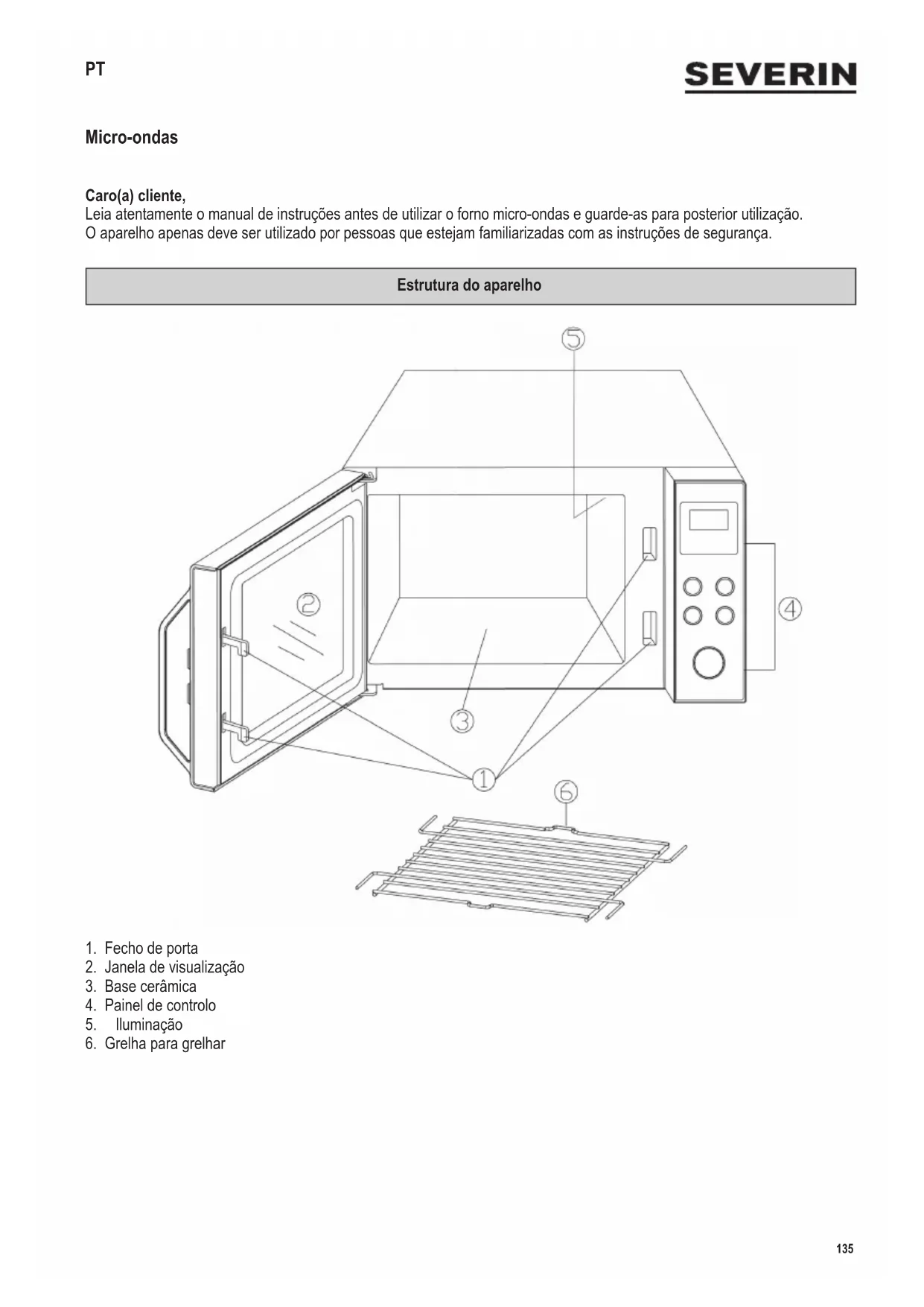 Instruções de preparação A-1 Bebidas: Para aquecimento de bebidas, aquecimento de água para chá ou café instantâneo A-2 Batatas assadas: Colocar as batatas cruas com casca num prato seguro para o micro-ondas, no meio da câmara de cozedura. A-3 Aquecer: Para aquecimento de alimentos em recipientes que possam ir ao micro-ondas. Sugestão! Organizar os alimentos em círculo, para conseguir uma distribuição ótima do calor. A-4 Peixe: Colocar o peixe num prato seguro para o micro-ondas, no centro da câmara de cozedura. A-5 Frango assado: Colocar o frango inteiro num prato seguro para o micro-ondas na parte de trás da câmara de cozedura. Depois de decorridos 2/3 do tempo de cozedura, são emitidos sinais sonoros e o processo de cozedura para. Vire os alimentos. Prima o botão para continuar a cozinhar. A-6 Carne: Colocar costeletas, panados, etc. diretamente na grelha (ou numa placa adequada) na área traseira da grelha. Depois de decorridos 2/3 do tempo de cozedura, são emitidos sinais sonoros e o processo de cozedura para. Vire os alimentos. Prima o botão para continuar a cozinhar. A-7 Espetadas: Colocar as espetadas diretamente sobre a grelha (ou sobre uma placa adequada) na área traseira da grelha. Depois de decorridos 2/3 do tempo de cozedura, são emitidos sinais sonoros e o processo de cozedura para. Vire os alimentos. Prima o botão para continuar a cozinhar.148 142 x 208 mm A-8 Enchidos para churrasco: Colocar os enchidos para churrasco diretamente na grelha (ou num prato adequado) na área traseira da grelha. Depois de decorridos 2/3 do tempo de cozedura, são emitidos sinais sonoros e o processo de cozedura para. Vire os alimentos. Prima o botão para continuar a cozinhar. A-9 Bifes tenros e nos: Colocar os bifes nos no grelhador ou numa placa à prova de micro-ondas, na parte de trás da câmara de cozedura. Depois de decorridos 2/3 do tempo de cozedura, são emitidos sinais sonoros e o processo de cozedura para. Vire os alimentos. Prima o botão para continuar a cozinhar. d-1 Descongelamento por tempo: Consulte a secção “Descongelamento por tempo” abaixo. d-2 Descongelamento por peso: Consulte a secção “Descongelamento por peso” abaixo. d-1 Descongelamento por tempo e d-2 Descongelamento por peso Com estes programas de descongelamento, o descongelamento pode ser executado especicando o tempo ou o peso. ∙ Rodar o botão para a esquerda, até o visor mostrar d-1 ou d-2. ∙ Premir o botão rotativo para conrmar o programa. ∙ Rodar o botão até aparecer no visor o tempo de descongelamento pretendido (em d-1) ou o peso pretendido (em d-2). ∙ Premir o botão para iniciar o processo de descongelamento. Nota: ∙ Depois de decorridos 2/3 do tempo estabelecido, soam sinais sonoros. Agora, remova os alimentos já descongelados ou vire os alimentos a descongelar. ∙ Prima o botão para continuar o processo de descongelamento. ∙ Se, depois de decorrido o tempo, os alimentos ainda não tiverem sido descongelados, programar o aparelho em incrementos de 1 minuto até que quem nalmente descongelados. ∙ Se retirar os alimentos do congelador num recipiente de plástico que não seja seguro para o micro-ondas, descongelar apenas até que os alimentos possam ser retirados do recipiente de plástico e depois utilizar pratos seguros para o micro-ondas. Iluminação Quando a porta está aberta e o aparelho está em funcionamento, a iluminação interior é ligada. Quando um programa é terminado, a lâmpada apaga-se. Limpeza ∙ O micro-ondas deve ser limpo regularmente e quaisquer resíduos alimentares removidos após cada utilização. ∙ Antes de limpar, desligue sempre o aparelho, desligue-o da corrente e deixe-o arrefecer o suciente. ∙ O aparelho não deve ser manuseado com água. Não permitir a entrada de nenhuma água nas aberturas de ventilação no interior nem no exterior da unidade. Não deve ser utilizado para limpeza nenhum produto de limpeza a vapor. ∙ Todo o aparelho pode ser limpo com um pano macio ligeiramente húmido e um pouco de detergente para louça. Em seguida, secar com um pano macio. ∙ Não utilizar abrasivos nem outros agentes de limpeza agressivos. Não deve ser utilizado spray de limpeza do forno. ∙ Limpar a câmara de cozedura após cada utilização. O interior da porta, a moldura da porta e a base cerâmica devem ser sempre mantidos limpos. ∙ Lavar a grelha em água quente de enxaguamento. Não limpar as peças individuais na máquina de lavar louça. ∙ Após a limpeza, deixar a porta aberta durante algum tempo para permitir dissipar qualquer humidade.149 142 x 208 mm Outras notas Dados técnicos Dimensões externas: 495 mm (C) x 415 mm (P) x 288 mm (A) Dimensões internas: ∙ Altura: 195 mm Peso do aparelho: aprox. 14,4 kg Tensão de funcionamento: 230 - 240 V~, 50 Hz Consumo energético total: 1400 W ∙ Grelhador: 1000 W ∙ Micro-ondas: 1400 W Potência de saída ∙ Micro-ondas: 90 - 900 W Eliminação Os aparelhos marcados com este símbolo devem ser eliminados separadamente dos resíduos domésticos, já que contêm materiais valiosos que podem ser reciclados. A eliminação adequada protege o ambiente e a saúde humana. As suas autoridades locais ou o revendedor podem facultar-lhe informações sobre o assunto. Garantia Nas seguintes condições, os direitos de garantia obrigatórios perante o vendedor e eventuais garantias permanecem intactos. Caso necessite de usufruir da sua garantia, contacte o comerciante diretamente. Além disso, a SEVERIN concede uma garantia de 2 anos com efeito a partir da data da compra do produto. Neste período, resolveremos qualquer defeito de fabrico ou de material que prejudique signicativamente o funcionamento do aparelho. Quaisquer outras reivindicações serão rejeitadas. Excluídos da garantia estão: Danos causados devido à não observância das instruções de uso, manuseio inadequado ou desgaste normal, bem como peças facilmente quebráveis, como, por exemplo, vidro,