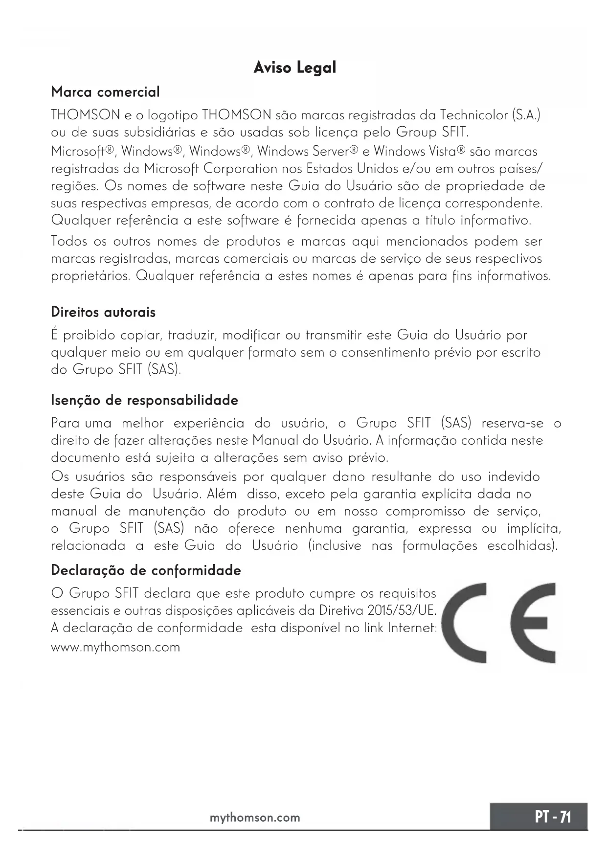 mythomson.com Aviso Legal Marca comercial THOMSON e o logotipo THOMSON são marcas registradas da Technicolor (S.A.) ou de suas subsidiárias e são usadas sob licença pelo Group SFIT. Microsoft®, Windows®, Windows®, Windows Server® e Windows Vista® são marcas registradas da Microsoft Corporation nos Estados Unidos e/ou em outros países/ regiões. Os nomes de software neste Guia do Usuário são de propriedade de suas respectivas empresas, de acordo com o contrato de licença correspondente. Qualquer referência a este software é fornecida apenas a título informativo. Todos os outros nomes de produtos e marcas aqui mencionados podem ser marcas registradas, marcas comerciais ou marcas de serviço de seus respectivos proprietários. Qualquer referência a estes nomes é apenas para ns informativos. Direitos autorais É proibido copiar, traduzir, modicar ou transmitir este Guia do Usuário por qualquer meio ou em qualquer formato sem o consentimento prévio por escrito do Grupo SFIT (SAS). Isenção de responsabilidade Para uma melhor experiência do usuário, o Grupo SFIT (SAS) reserva-se o direito de fazer alterações neste Manual do Usuário. A informação contida neste documento está sujeita a alterações sem aviso prévio. Os usuários são responsáveis por qualquer dano resultante do uso indevido deste Guia do Usuário. Além disso, exceto pela garantia explícita dada no manual de manutenção do produto ou em nosso compromisso de serviço, o Grupo SFIT (SAS) não oferece nenhuma garantia, expressa ou implícita, relacionada a este Guia do Usuário (inclusive nas formulações escolhidas). Declaração de conformidade O Grupo SFIT declara que este produto cumpre os requisitos essenciais e outras disposições aplicáveis da Diretiva 2015/53/UE. A declaração de conformidade esta disponível no link Internet: www.mythomson.com72 - PT Manual do Usuário - Neo - 15.6’’ mythomson.com - Instruções de segurança importantes - Esta unidade deve ser utilizada num ambiente com uma temperatura ambiente entre 5°C (41°F) e 35°C (95°F). Não exponha a unidade à chuva ou humidade e mantenha-a afastada de líquidos. Em caso de salpicos de água ou outro líquido na unidade, desligue-a imediatamente e aguarde até que esteja completamente seca antes de a ligar novamente. Não exponha o aparelho diretamente à radiação solar Não utilize solventes fortes, detergentes líquidos ou outros produtos químicos sobre ou perto da superfície da unidade para evitar a corrosão ou deterioração da superfície da unidade. Não exponha a máquina a ambientes poeirentos. Não utilize a unidade durante uma fuga de gás. Não exponha o dispositivo a campos magnéticos ou elétricos fortes. Você pode operar o dispositivo através de detectores de raios X do aeroporto. No entanto, recomenda-se que não passe o seu dispositivo através dos portais de detecção magnética nem o exponha a detetores portáteis. Não coloque quaisquer objetos sobre o dispositivo. Não coloque a unidade sobre uma superfície irregular ou instável. Certique-se de que protege a unidade de quedas ou qualquer outro impacto que a possa danicar. Não deixe o aparelho sobre ou carregado no seu colo ou em qualquer outra parte do seu corpo para evitar qualquer risco de lesões relacionadas com o calor. Desligue o aparelho antes de o transportar ou de o cobrir com um material que não permita uma circulação de ar óptima. Não utilize cabos de alimentação, acessórios ou outros dispositivos danicados com o seu aparelho. Recomendamos a utilização exclusiva dos acessórios (alimentação eléctrica, cabos, etc.) fornecidos com o aparelho.PT - 73 mythomson.com Utilize apenas baterias originais. A substituição da bateria por uma bateria incorreta pode causar risco de explosão. Não desmonte, modique ou repare a unidade por conta própria, pois isso pode anular a garantia. Por favor, faça cópias de segurança do seu conteúdo importante regularmente para evitar a perda de dados. A nossa empresa não aceita qualquer responsabilidade pela perda ou remoção de itens contidos no dispositivo devido à utilização inadequada do hardware ou software, falta de manutenção ou qualquer outro evento acidental. Na potência máxima, o uso prolongado de ouvir o leitor de música pode danicar o ouvido do usuário. Este produto foi concebido para permitir a reciclagem adequada de peças e componentes. O símbolo que representa um caixote do lixo com uma cruz indica que o dispositivo não deve ser eliminado juntamente com o lixo municipal. Consulte os regulamentos locais para descarte de dispositivos eletrônicos. O símbolo que representa um caixote do lixo com uma cruz indica que a bateria não deve ser eliminada juntamente com os resíduos municipais. Consulte os regulamentos locais para a eliminação da bateria.74 - PT Manual do Usuário - Neo - 15.6’’ mythomson.com - Apresentação do dispositivo - Vista frontal Vista esquerda Vista direita Nota : A apresentação do dispositivo e alguns recursos podem variar de acordo com o país, modelo ou versão.