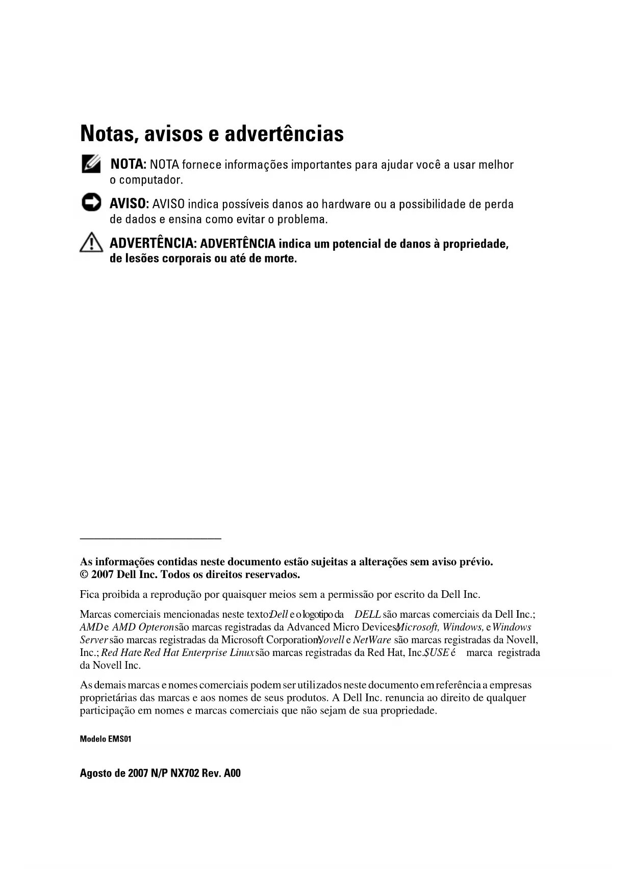 Red Hat Enterprise Linux são marcas registradas da Red Hat, Inc.; SUSE é marca registrada da Novell Inc. As demais marcas e nomes comerciais podem ser utilizados neste documento em referência a empresas proprietárias das marcas e aos nomes de seus produtos. A Dell Inc. renuncia ao direito de qualquer participação em nomes e marcas comerciais que não sejam de sua propriedade. Modelo EMS01 Agosto de 2007 N/P NX702 Rev. A00Primeiros passos com o sistema 33 Recursos do sistema Esta seção descreve os principais recursos de hardware e software do sistema. Também fornece informações sobre outros documentos de que talvez necessite quando configurar o sistema e sobre como obter assistência técnica.