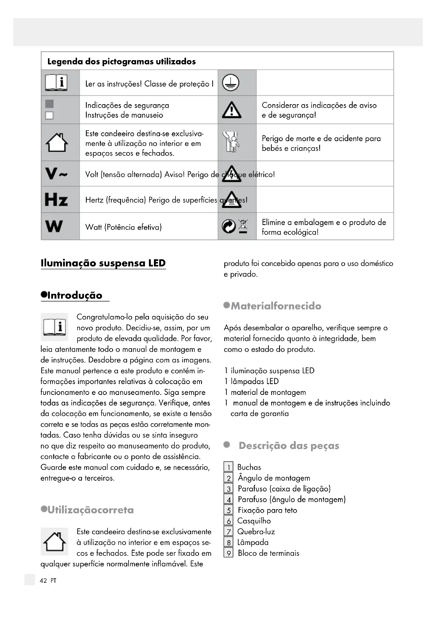 Para casos fuera de garantía: Devuelva el artículo sin reparar abonando los gastos de transporte incurridos. Indíqueme los gastos. Repare el artículo cargándome el coste. Índice41 PT Garantía / Atención al cliente Índice Legenda dos pictogramas utilizados .................................................................. Página 42 Introdução .................................................................................................................................. Página 42 Utilização correta ........................................................................................................................... Página 42 Material fornecido .......................................................................................................................... Página 42 Descrição das peças ...................................................................................................................... Página 42 Dados técnicos ................................................................................................................................ Página 43 Segurança................................................................................................................................... Página 43 Indicações de segurança ............................................................................................................... Página 43 Preparação ................................................................................................................................ Página 44 Ferramentas e material necessário ................................................................................................ Página 44 Antes da instalação ............................................................................................................ Página 44 Colocação em funcionamento ................................................................................... Página 44 Montar o candeeiro........................................................................................................................ Página 44 Inserir ou trocar lâmpada ............................................................................................................... Página 44 Ligar / desligar o candeeiro ........................................................................................................... Página 44 Manutenção e limpeza .................................................................................................... Página 45 Eliminação .................................................................................................................................. Página 45 Declaração de conformidade .................................................................................... Página 45 Garantia / Assistência técnica .................................................................................... Página 45 Garantia .......................................................................................................................................... Página 45 Endereço da assistência ................................................................................................................. Página 46 Certificado de garantia .................................................................................................................. Página 4642 PT Introdução / SegurançaIntrodução Iluminação suspensa LED Introdução Congratulamo-lo pela aquisição do seu novo produto. Decidiu-se, assim, por um produto de elevada qualidade. Por favor, leia atentamente todo o manual de montagem e de instruções. Desdobre a página com as imagens. Este manual pertence a este produto e contém in- formações importantes relativas à colocação em funcionamento e ao manuseamento. Siga sempre todas as indicações de segurança. Verifique, antes da colocação em funcionamento, se existe a tensão correta e se todas as peças estão corretamente mon- tadas. Caso tenha dúvidas ou se sinta inseguro no que diz respeito ao manuseamento do produto, contacte o fabricante ou o ponto de assistência. Guarde este manual com cuidado e, se necessário, entregue-o a terceiros. Utilização correta Este candeeiro destina-se exclusivamente à utilização no interior e em espaços se- cos e fechados. Este pode ser fixado em qualquer superfície normalmente inflamável. Este produto foi concebido apenas para o uso doméstico e privado. Material fornecido Após desembalar o aparelho, verifique sempre o material fornecido quanto à integridade, bem como o estado do produto. 1 iluminação suspensa LED 1 lâmpadas LED 1 material de montagem 1 manual de montagem e de instruções incluindo carta de garantia Descrição das peças