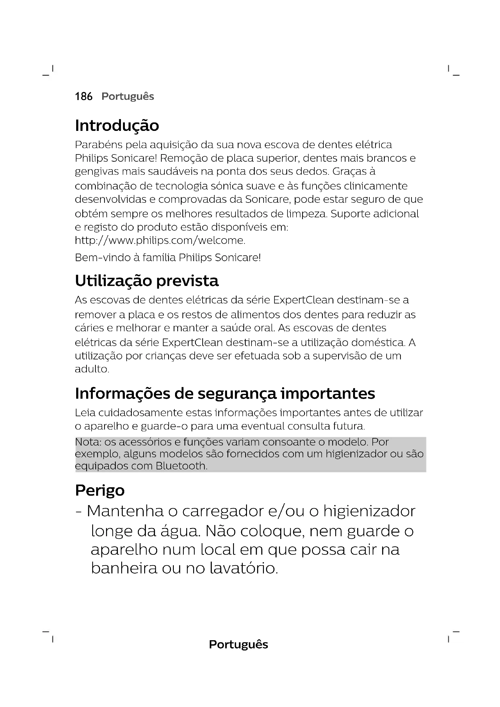 NederlandsPortuguês Introdução Parabéns pela aquisição da sua nova escova de dentes elétrica Philips Sonicare! Remoção de placa superior, dentes mais brancos e gengivas mais saudáveis na ponta dos seus dedos. Graças à combinação de tecnologia sónica suave e às funções clinicamente desenvolvidas e comprovadas da Sonicare, pode estar seguro de que obtém sempre os melhores resultados de limpeza. Suporte adicional e registo do produto estão disponíveis em: http://www.philips.com/welcome. Bem-vindo à família Philips Sonicare! Utilização prevista As escovas de dentes elétricas da série ExpertClean destinam-se a remover a placa e os restos de alimentos dos dentes para reduzir as cáries e melhorar e manter a saúde oral. As escovas de dentes elétricas da série ExpertClean destinam-se a utilização doméstica. A utilização por crianças deve ser efetuada sob a supervisão de um adulto. Informações de segurança importantes Leia cuidadosamente estas informações importantes antes de utilizar o aparelho e guarde-o para uma eventual consulta futura. Nota: os acessórios e funções variam consoante o modelo. Por exemplo, alguns modelos são fornecidos com um higienizador ou são equipados com Bluetooth. Perigo - Mantenha o carregador e/ou o higienizador longe da água. Não coloque, nem guarde o aparelho num local em que possa cair na banheira ou no lavatório.