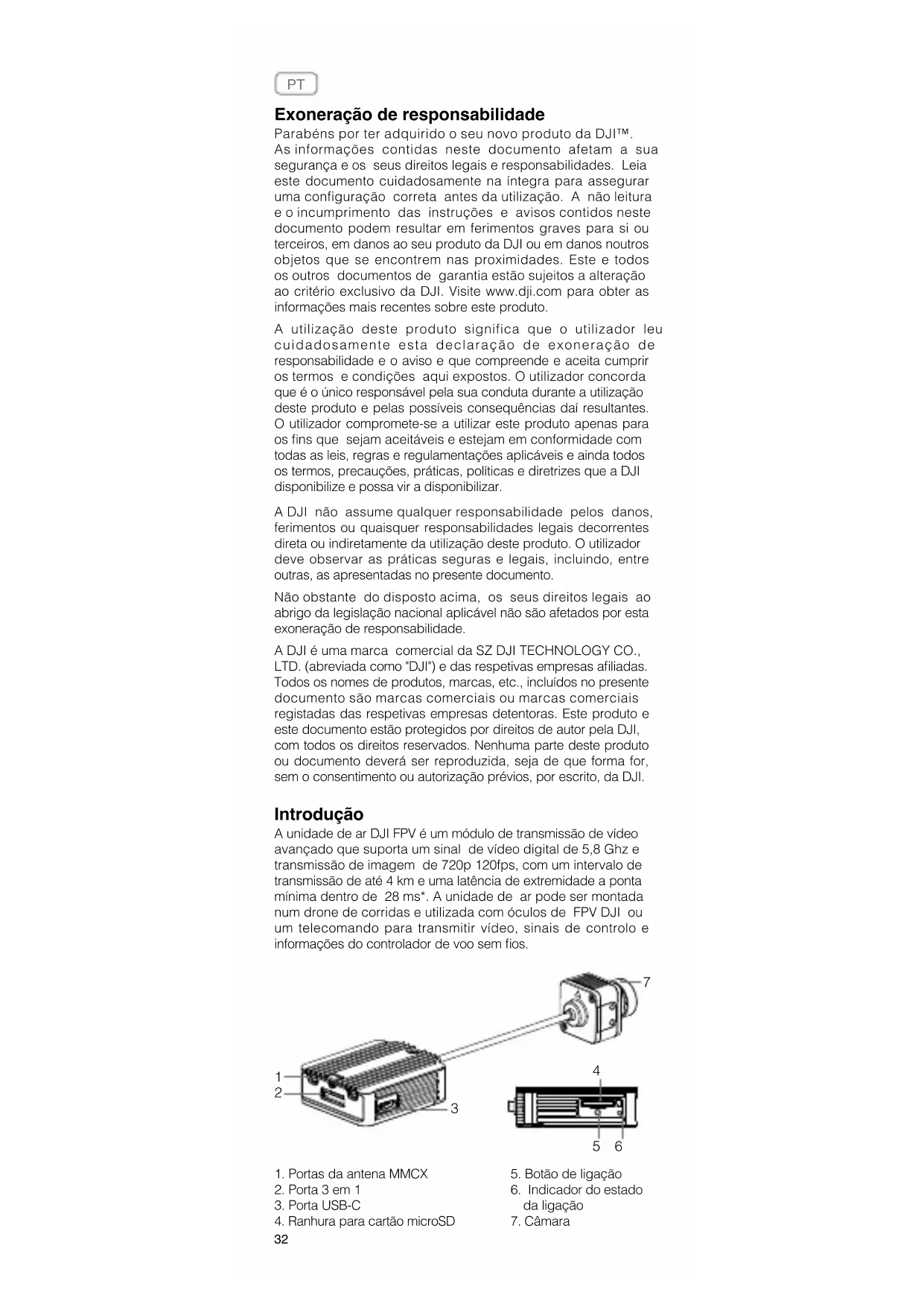 Exoneração de responsabilidade Parabéns por ter adquirido o seu novo produto da DJI™. As informações contidas neste documento afetam a sua segurança e os seus direitos legais e responsabilidades. Leia este documento cuidadosamente na íntegra para assegurar uma configuração correta antes da utilização. A não leitura e o incumprimento das instruções e avisos contidos neste documento podem resultar em ferimentos graves para si ou terceiros, em danos ao seu produto da DJI ou em danos noutros objetos que se encontrem nas proximidades. Este e todos os outros documentos de garantia estão sujeitos a alteração ao critério exclusivo da DJI. Visite www.dji.com para obter as informações mais recentes sobre este produto. A utilização deste produto significa que o utilizador leu cuidadosamente esta declaração de exoneração de responsabilidade e o aviso e que compreende e aceita cumprir os termos e condições aqui expostos. O utilizador concorda que é o único responsável pela sua conduta durante a utilização deste produto e pelas possíveis consequências daí resultantes. O utilizador compromete-se a utilizar este produto apenas para os ns que sejam aceitáveis e estejam em conformidade com todas as leis, regras e regulamentações aplicáveis e ainda todos os termos, precauções, práticas, políticas e diretrizes que a DJI disponibilize e possa vir a disponibilizar. A DJI não assume qualquer responsabilidade pelos danos, ferimentos ou quaisquer responsabilidades legais decorrentes direta ou indiretamente da utilização deste produto. O utilizador deve observar as práticas seguras e legais, incluindo, entre outras, as apresentadas no presente documento. Não obstante do disposto acima, os seus direitos legais ao abrigo da legislação nacional aplicável não são afetados por esta exoneração de responsabilidade. A DJI é uma marca comercial da SZ DJI TECHNOLOGY CO., LTD. (abreviada como "DJI") e das respetivas empresas aliadas. Todos os nomes de produtos, marcas, etc., incluídos no presente documento são marcas comerciais ou marcas comerciais registadas das respetivas empresas detentoras. Este produto e este documento estão protegidos por direitos de autor pela DJI, com todos os direitos reservados. Nenhuma parte deste produto ou documento deverá ser reproduzida, seja de que forma for, sem o consentimento ou autorização prévios, por escrito, da DJI. Introdução A unidade de ar DJI FPV é um módulo de transmissão de vídeo avançado que suporta um sinal de vídeo digital de 5,8 Ghz e transmissão de imagem de 720p 120fps, com um intervalo de transmissão de até 4 km e uma latência de extremidade a ponta mínima dentro de 28 ms*. A unidade de ar pode ser montada num drone de corridas e utilizada com óculos de FPV DJI ou um telecomando para transmitir vídeo, sinais de controlo e informações do controlador de voo sem os.
