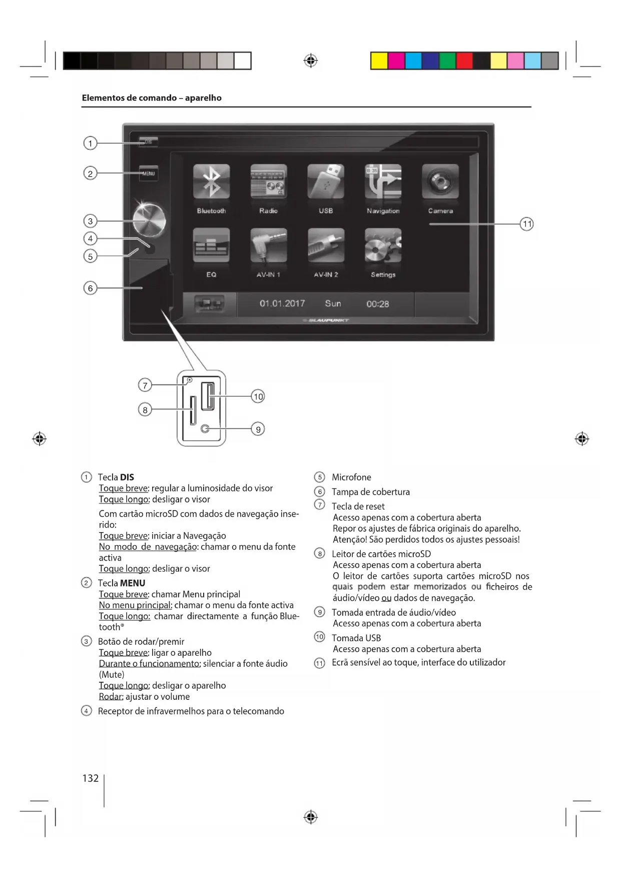 O ajuste é memorizado, a fonte actual volta a ser apresentada. Ajustes básicos No menu Ajustes pode adaptar os ajustes básicos das di- ferentes funções do aparelho às suas exigências. Prima o botão [ gs ] no menu principal. O menu Opções é apresentado, o submenu Geral está activo. Com os botões na zona inferior do menu Opções, chame os submenus. Generalidades São possíveis os seguintes ajustes: Região de Rádio – Seleccionar a região de recepção para a recepção do rádio. Desligar tela – Se estiver seleccionado este valor, o visor do rádio é desligado por completo após 10 ou 20 seg. sem ser utilizado. Modo de Dimmer – Ajustar a luminosidade do visor Tom das teclas – Ligar/desligar o sinal sonoro de con- rmação Calibração de TFT – Aqui pode calibrar o ecrã sensível ao toque. SWC gurar as teclas de um telecoman- do no volante ligado. Software version – Indicação das versões actuais do software. g. de fábrica nições persona- lizadas.150 Ajustes básicos | Informações práticas Som São possíveis os seguintes ajustes: Subwoofer – Ligar / desligar o subwoofer Filtro de Subwoofer – Efectue o ajuste de acordo com o subwoofer utilizado (ajustes: 80/120/160 Hz). Dynamic sound – Ligar/desligar Baixos dinâmicos Tempo São possíveis os seguintes ajustes: Data – Acertar a data Modo do relógio ras Hora – Acertar a hora Auto clock – Ligar/desligar o ajuste automático do reló- gio com os dados de hora enviados via RDS. Idioma São possíveis os seguintes ajustes: OSD – Idioma para a interface do utilizador do aparelho. Bluetooth São possíveis os seguintes ajustes: Bluetooth – Aqui pode ligar ou desligar o Bluetooth® Conectar automático – Se estiver ligado o "Conectar automático", o aparelho liga-se automaticamente aos aparelhos Bluetooth® conhecidos, logo que estes este- jam ao seu alcance. Responder automático – As chamadas telefónicas de telefones ligados são automaticamente atendidas, se o "Responder automático" estiver activo. Código de pareamento – Muitos aparelhos Bluetooth® perguntam o código de emparelhamento antes de esta- nido. Microfone – Escolha qual o microfone que deverá ser utilizado para o sistema de mãos-livres através de Blue- tooth®. Volume No menu do Volume pode ajustar a relação do volume para todas as fontes áudio. Informações práticas Garantia Poderá consultar as condições de garantia em www.blaupunkt.com. Serviço Caso tenha alguma vez de solicitar um Serviço de repara- ção, poderá encontrar informações sobre os nossos par- ceiros de Assistência no seu país em www.blaupunkt.com. Reservado o direito a alterações técnicas!151 DANSK Betjeningselementer – apparat Tasten DIS Kort tryk: Indstil displayets lysstyrke Langt tryk: Sluk displayet Ved isat microSD-kort med navigationsdata: Kort tryk: start navigation I navigationstilstand: Åbn den aktive kildes menu Langt tryk: Sluk displayet Tasten MENU Kort tryk: Åbn hovedmenu I hovedmenuen: Åbn den aktive kildes menu Langt tryk: Åbn Bluetooth®-funktion direkte Dreje-/trykknap Kort tryk: Tænd apparat Når apparatet er tændt: Afbryd lyden fra lydkilden (Mute) Langt tryk: Sluk apparat Drejning: Indstil lydstyrke ernbetjeningen Mikrofon Afdækningsklap Reset-tast Kun adgang ved åbnet afdækning Retabler apparatets oprindelige fabriksindstillinger. Vigtigt! Alle personlige indstillinger går tabt! microSD-kortlæser Kun adgang ved åbnet afdækning Kortlæseren understøtter microSD-kort, som der kan ler eller navigations- data. AV-IN-bøsning Kun adgang ved åbnet afdækning USB-bøsning Kun adgang ved åbnet afdækning ade