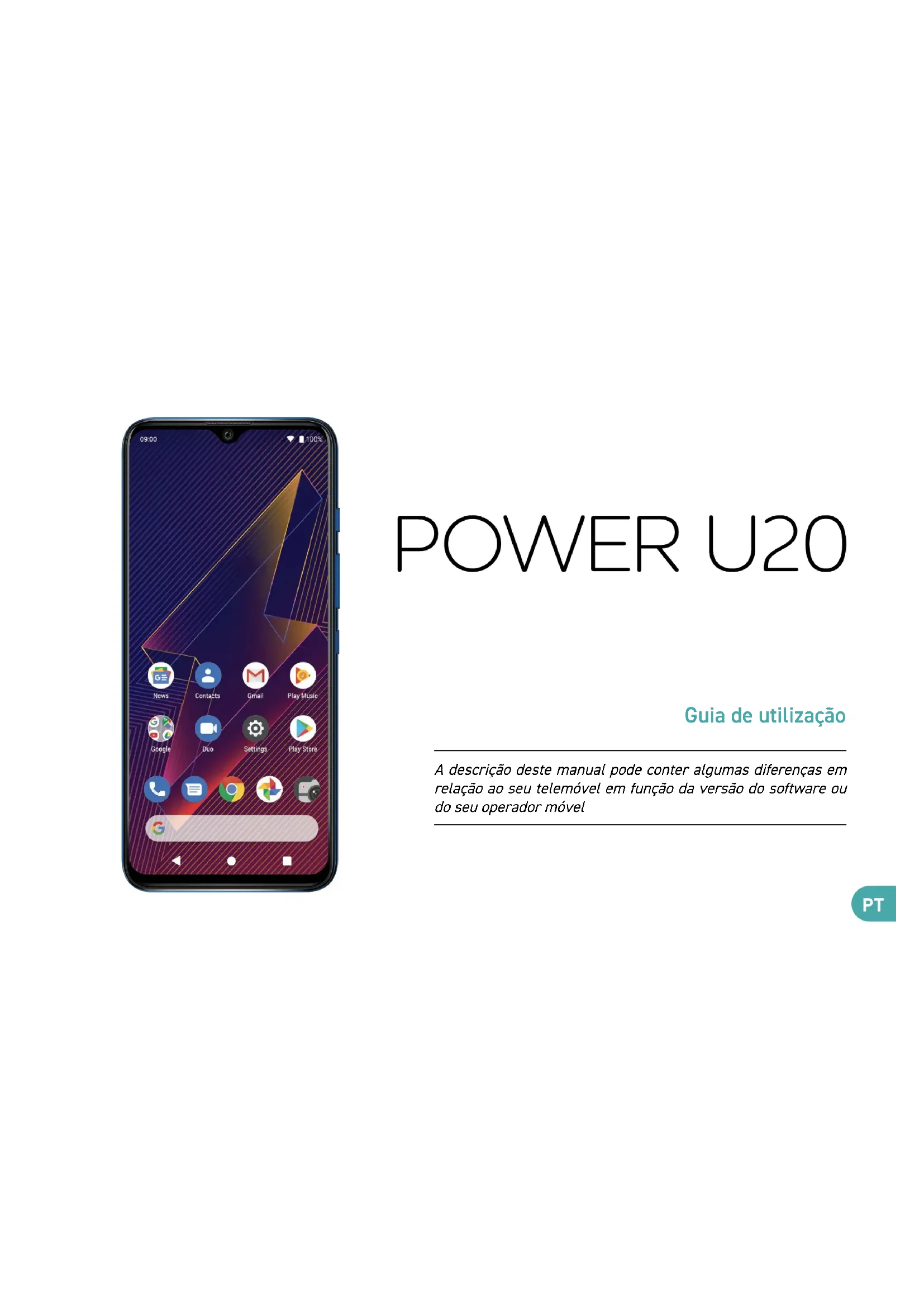 Google Play, Gmail, Chrome, Google Duo y otras marcas son marcas registradas de Google LLC.Guia de utilização A descrição deste manual pode conter algumas diferenças em relação ao seu telemóvel em função da versão do software ou do seu operador móvelPARABÉNS ! Acabou de adquirir o seu telemóvel WIKO POWER U20 (W‑V745). Este guia contém toda a informação necessária para a utilização deste telemóvel para que se familiarize rapidamente, nós esperamos, com o universo Wiko. A versão completa das diretrizes, normas de segurança e instruções para a utilização do seu dispositivo estão disponíveis no nosso website: es.wikomobile.com. Pode solicitar a versão impressa através de e-mail ou carta para o endereço indicado no final do guia de utilização. Copyright © 2021 WIKO A informação contida neste manual não pode, de forma alguma, ser transmitida a terceiros ou reproduzida sob quaisquer formas sem a autorização escrita de Wiko. Marcas comerciais WIKO é uma marca registada de WIKO SAS. Advertencia Este manual foi preparado com muito cuidado e atenção para o guiar nas funções do seu aparelho. No entanto, a informação e recomendações contidas neste manual não constituem uma garantia. Wiko reserva o direito de modificar em qualquer momento a informação contida neste manual. Limite de responsabilidade A integralidade dos serviços e conteúdos acessíveis a partir deste aparelho são de propriedade exclusiva de terceiros e protegidos pelas leis inerentes (direitos de autor, patente, licença e demais leis acerca da propriedade intelectual). Tais serviços são reservados ao seu uso pessoal e não são destinados ao uso comercial. É impossível utilizar tais conteúdos ou serviços sem que haja uma solicitação expressa e escrita ao proprietário do conteúdo. Lembre- se que não pode, de maneira alguma, copiar, publicar, transferir, vender ou explorar em quaisquer suportes, os conteúdos ou serviços editados por meio deste aparelho ou produzir formas derivadas do mesmo.OS SERVIÇOS E CONTEÚDOS DE TERCEIROS SÃO FORNECIDOS “NO ESTADO EM QUE SE ENCONTRAM”. DESSA FORMA, WIKO NÃO GARANTE TAIS SERVIÇOS OU CONTEÚDOS, QUER SEJA EXPRESSA OU IMPLICITAMENTE E INDEPENDENTEMENTE DOS FINS AOS QUAIS SE DESTINAM. IGUALMENTE, WIKO TAMBÉM NÃO GARANTE A QUALIDADE COMERCIAL NEM A ADEQUAÇÃO DOS MESMOS A UM USO ESPECÍFICO. ADEMAIS, WIKO NÃO GARANTE A EXACTIDÃO, A VALIDADE, A LEGALIDADE OU A EXAUSTIVIDADE DOS CONTEÚDOS OU SERVIÇOS FORNECIDOS POR MEIO DESTE APARELHO. WIKO não controla, de modo algum, os conteúdos e serviços que são transmitidos por terceiros, por meio de redes ou dispositivos de transmissão. Ademais, os serviços de terceiros podem ser interrompidos ou rescindidos a todo momento. Dessa forma, WIKO não assegura quaisquer representações ou garantias quanto à disponibilidade de todo e qualquer conteúdo ou serviço de terceiros e declina expressamente toda responsabilidade relacionada a tal interrupção ou suspensão. WIKO não pode, de modo algum, ser responsabilizada pelo tratamento e monitoramento dos conteúdos e serviços de terceiros acessíveis por meio deste aparelho. Toda e qualquer pergunta ou pedido relacionado a tais conteúdos ou serviços devem ser transmitidos directamente ao fornecedor dos conteúdos ou dos serviços em questão. Um operador terceiro, independente, fornece o cartão SIM e a rede ou o sistema (móvel ou outro) sob o qual funciona o presente aparelho. WIKO rejeita expressamente toda e qualquer responsabilidade relativa ao funcionamento, à disponibilidade, à cobertura, aos serviços ou à capacidade da rede ou do sistema (móvel ou outro). A responsabilidade de WIKO e do seu serviço pós-venda certificado limita-se exclusivamente ao custo dos reparos e/ou da substituição da unidade durante o período de garantia.WIKO NÃO SERÁ RESPONSÁVEL EM CASO DE NEGLIGÊNCIA, QUER SEJA EM TERMOS DE RESPONSABILIDADE CONTRATUAL OU DELITUAL, DE DANOS DIRECTOS OU INDIRECTOS, ACESSÓRIOS, ESPECIAIS, DE HONORÁRIOS DE ADVOGADO, DE CUSTOS OU DE QUAISQUER OUTROS DANOS RESULTANTES DO USO PRÓPRIO OU DE TERCEIROS DOS CONTEÚDOS OU SERVIÇOS ACESSÍVEIS POR MEIO DESTE APARELHO. ALGUNS PAÍSES NÃO AUTORIZAM A EXCLUSÃO DAS GARANTIAS IMPLÍCITAS OU A LIMITAÇÃO DOS